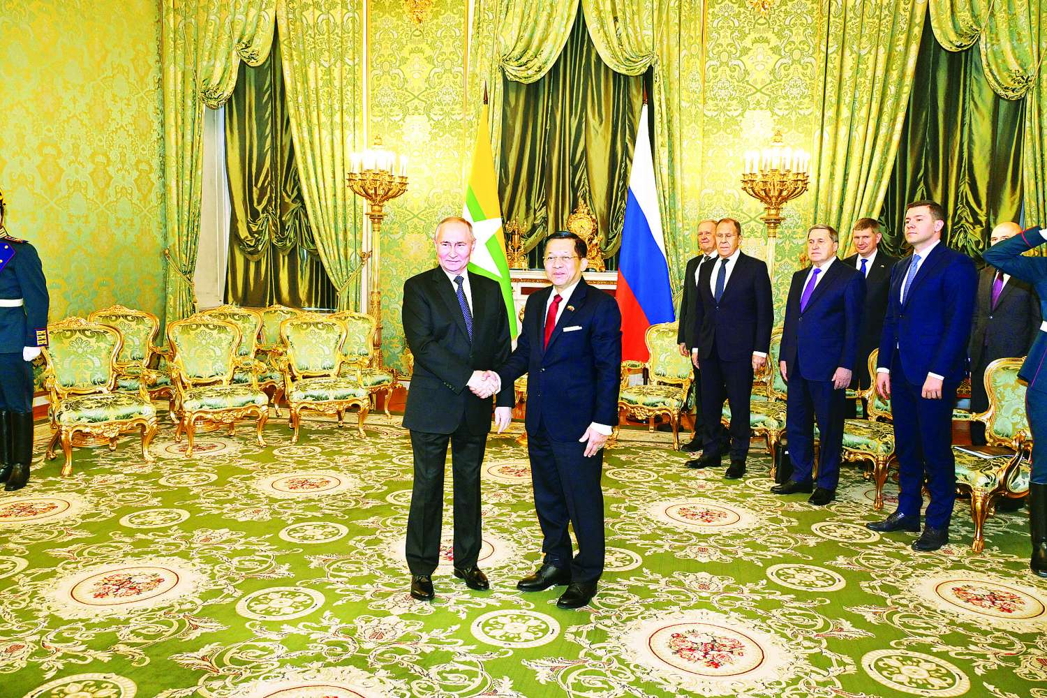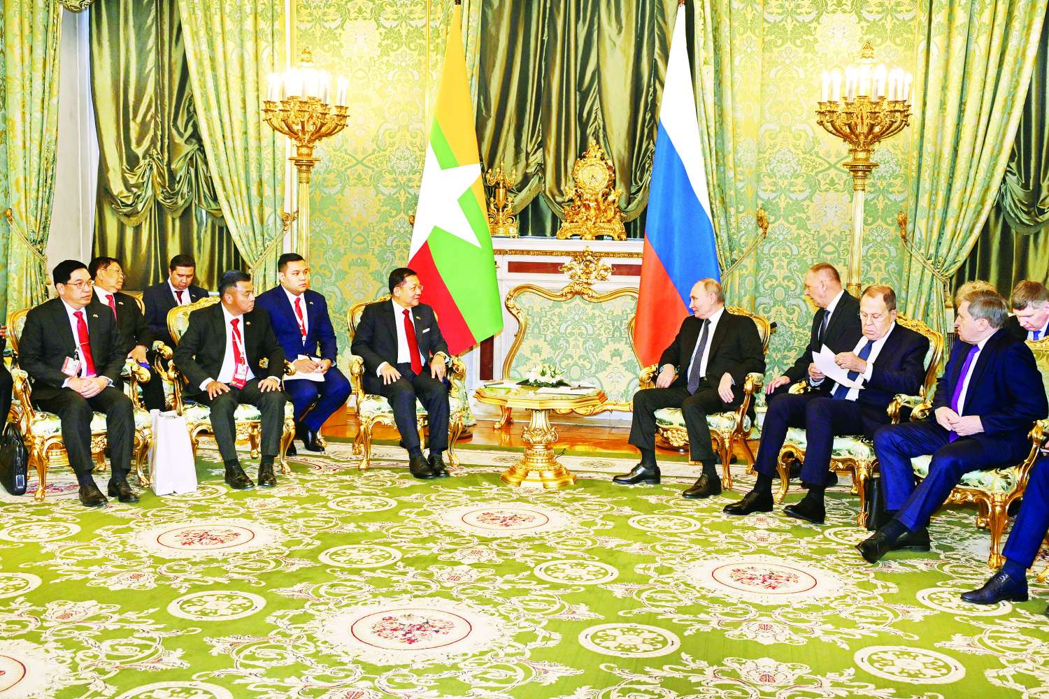 ရုရှားဖက်ဒရေးရှင်းနိုင်ငံသမ္မတ H.E. Vladimir Vladimirovich Putin ၏ ဖိတ်ကြားချက်အရ ရုရှားဖက်ဒရေးရှင်းနိုင်ငံသို့ တရားဝင်ချစ်ကြည်ရေးခရီး ရောက်ရှိနေသည့် နိုင်ငံတော်စီမံအုပ်ချုပ်ရေးကောင်စီဥက္ကဋ္ဌ နိုင်ငံတော်ဝန်ကြီးချုပ် ဗိုလ်ချုပ်မှူးကြီး မင်းအောင်လှိုင်သည် ယနေ့ ဒေသစံတော်ချိန် ညနေပိုင်းတွင် မော်စကိုမြို့၊ ကရင်မလင် နန်းတော်၌ ရုရှားဖက်ဒရေးရှင်းနိုင်ငံသမ္မတ H.E. Vladimir Vladimirovich Putin နှင့်သီးခြား တွေ့ဆုံဆွေးနွေးသည်။