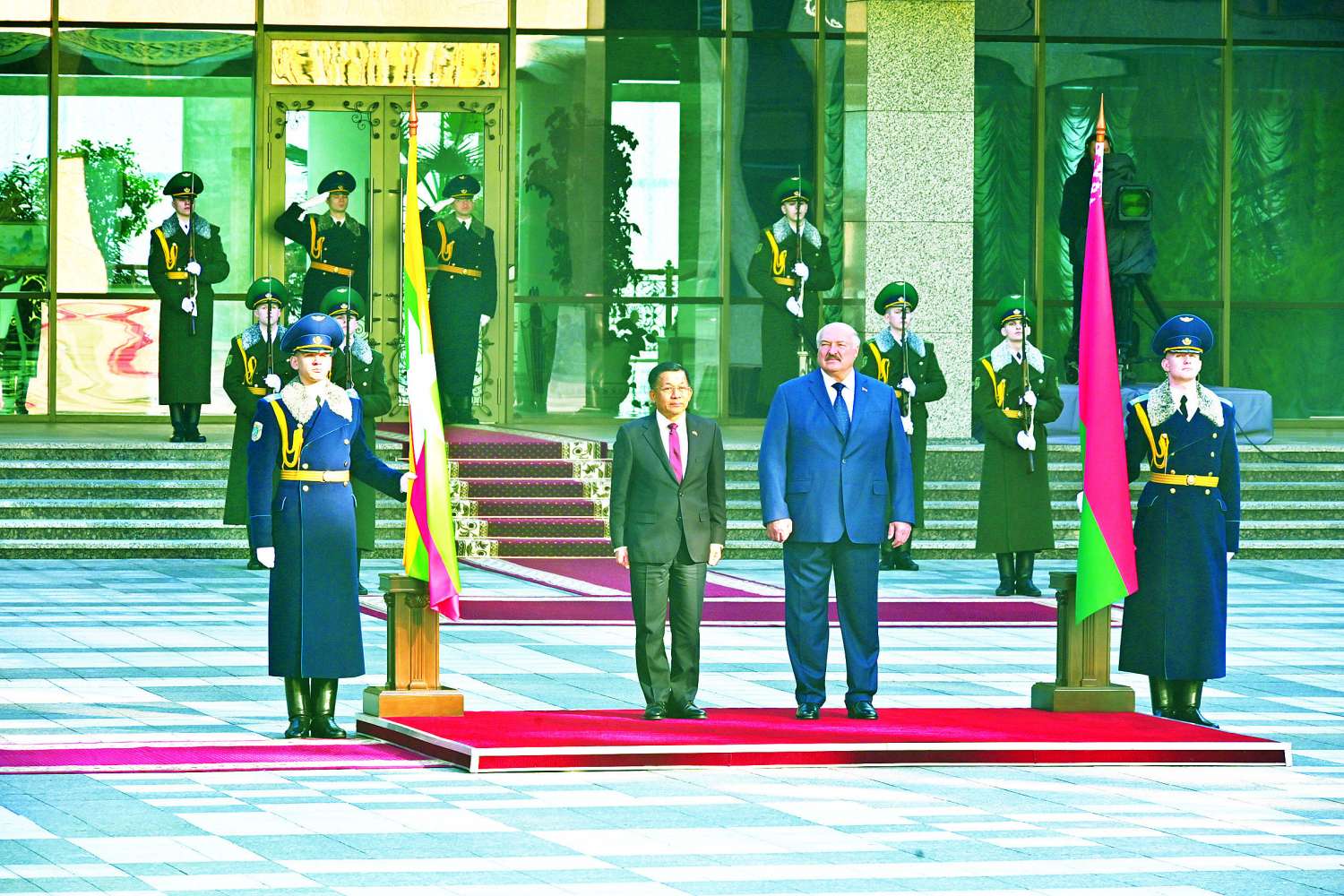 ဘယ်လာရုစ်သမ္မတနိုင်ငံသမ္မတ H.E. Mr. Alexander Gregoryevich Lukashenko ၏ ဖိတ်ကြားချက်အရ ဘယ်လာရုစ်နိုင်ငံသို့ နိုင်ငံတော်အဆင့် (Official State Visit) ချစ်ကြည်ရေးခရီး ရောက်ရှိနေသည့် နိုင်ငံတော်စီမံအုပ်ချုပ်ရေးကောင်စီဥက္ကဋ္ဌ နိုင်ငံတော်ဝန်ကြီးချုပ် ဗိုလ်ချုပ်မှူးကြီး မင်းအောင်လှိုင်အား ယနေ့ဒေသစံတော်ချိန် နံနက်ပိုင်းတွင် ဘယ်လာရုစ်နိုင်ငံသမ္မတက သမ္မတနန်းတော်၌ ဂုဏ်ပြုတပ်ဖွဲ့ဖြင့် ကြိုဆိုသည်။