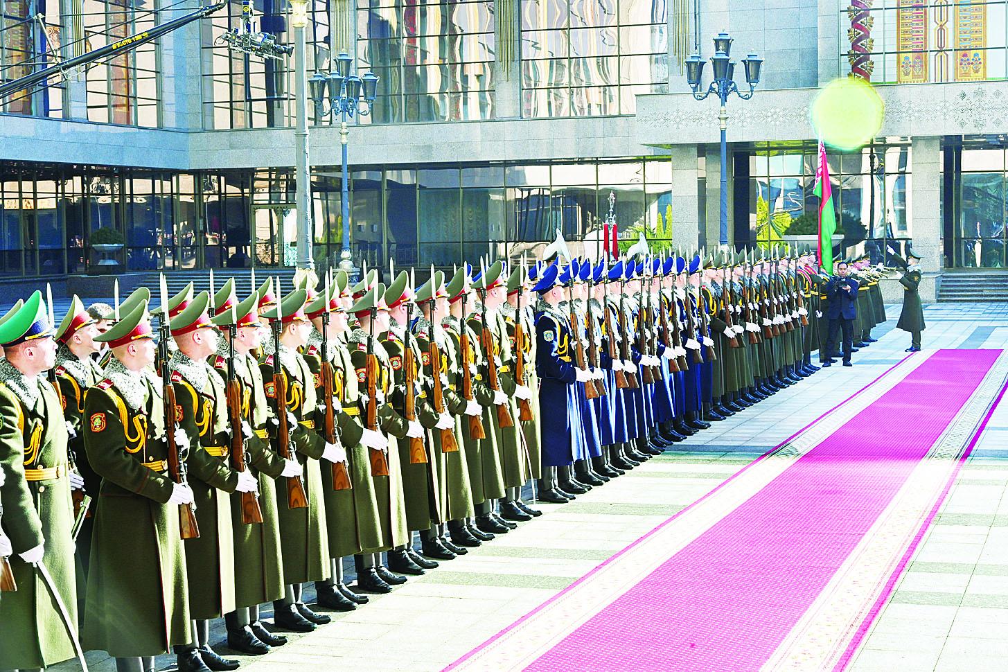 ဆက်လက်၍ နိုင်ငံတော်စီမံအုပ်ချုပ်ရေးကောင်စီဥက္ကဋ္ဌ နိုင်ငံတော်ဝန်ကြီးချုပ်သည် ဂုဏ်ပြုတပ်ဖွဲ့၏ ချီတက်အလေးပြုခြင်းကို ခံယူသည်။ ယင်းနောက် နိုင်ငံတော်စီမံအုပ်ချုပ်ရေးကောင်စီဥက္ကဋ္ဌ နိုင်ငံတော်ဝန်ကြီးချုပ်နှင့် ဘယ်လာရုစ်သမ္မတ နိုင်ငံသမ္မတတို့သည် မှတ်တမ်းတင်ဓာတ်ပုံရိုက်ကြသည်။