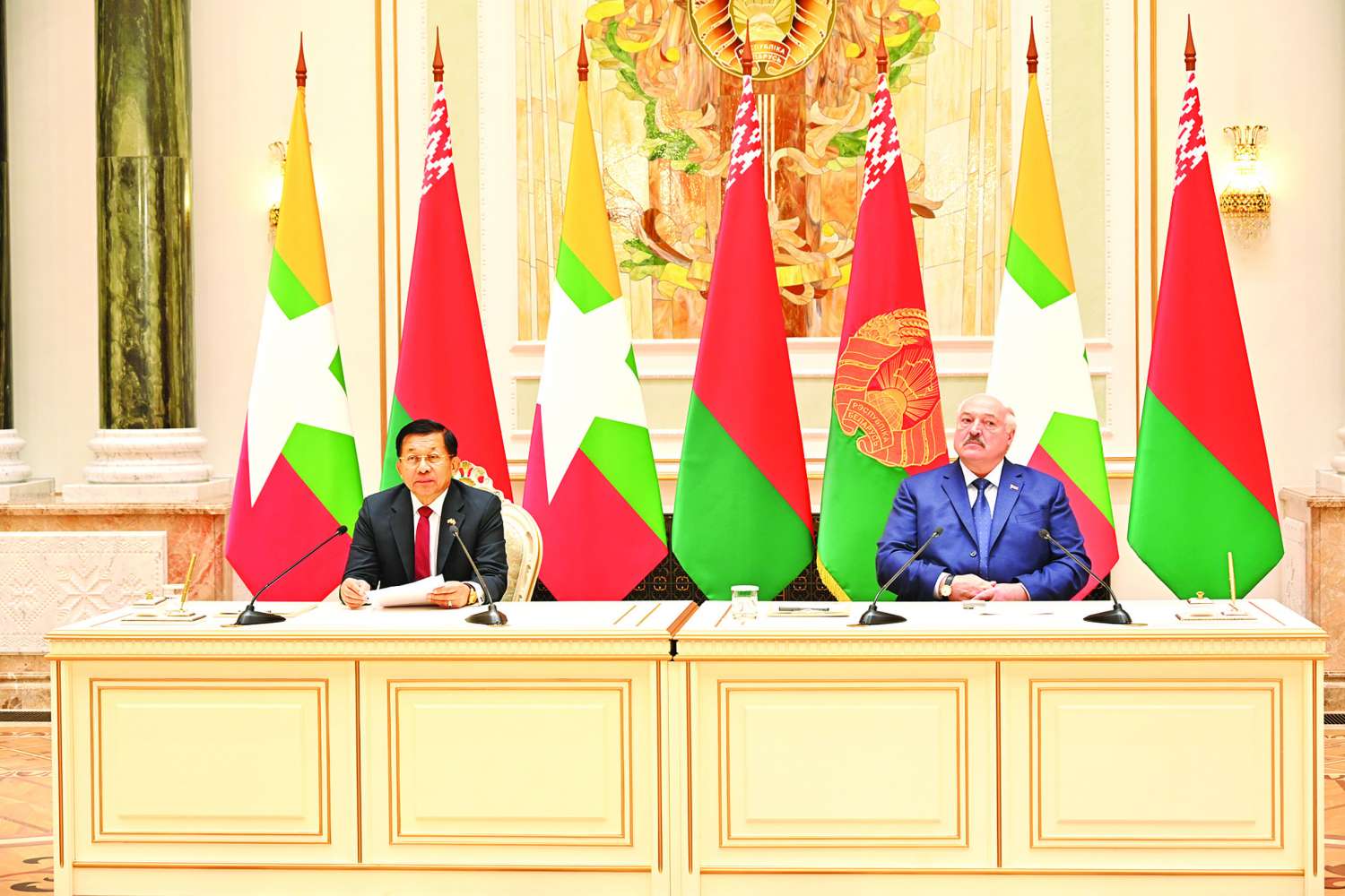 နိုင်ငံတော်စီမံအုပ်ချုပ်ရေးကောင်စီဥက္ကဋ္ဌ နိုင်ငံတော်ဝန်ကြီးချုပ် ဗိုလ်ချုပ်မှူးကြီး မင်းအောင်လှိုင်နှင့် ဘယ်လာရုစ်သမ္မတနိုင်ငံသမ္မတ H.E. Mr. Alexander Gregoryevich Lukashenko တို့ မီဒီယာများနှင့် တွေ့ဆုံစဉ် နှစ်နိုင်ငံအပြန်အလှန်ပူးတွဲကြေညာချက်များနှင့် ပြောကြားချက်များ