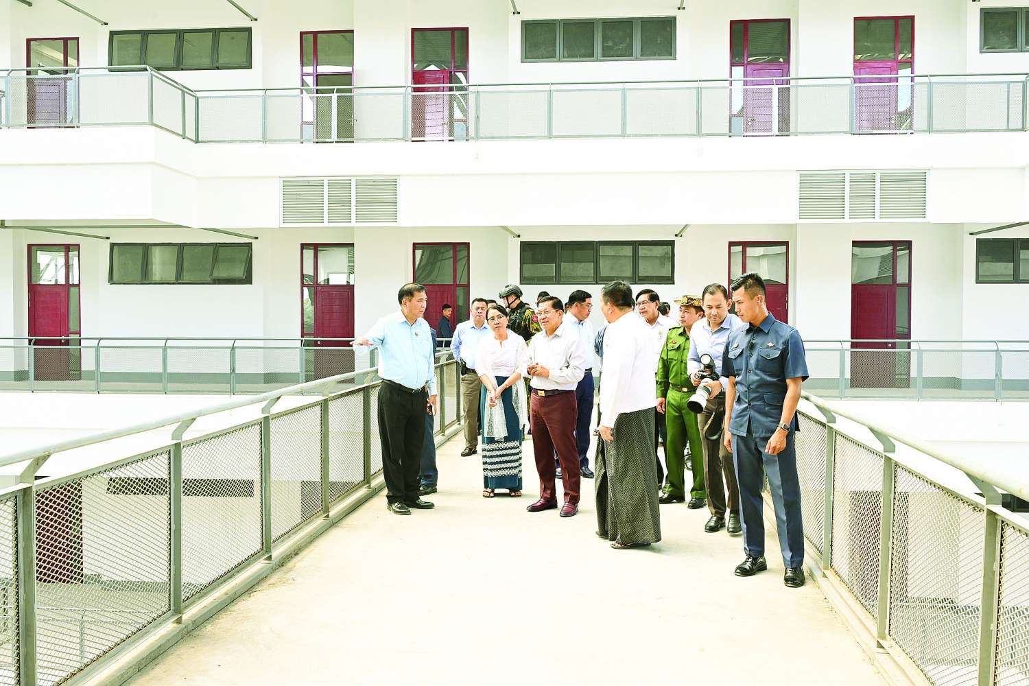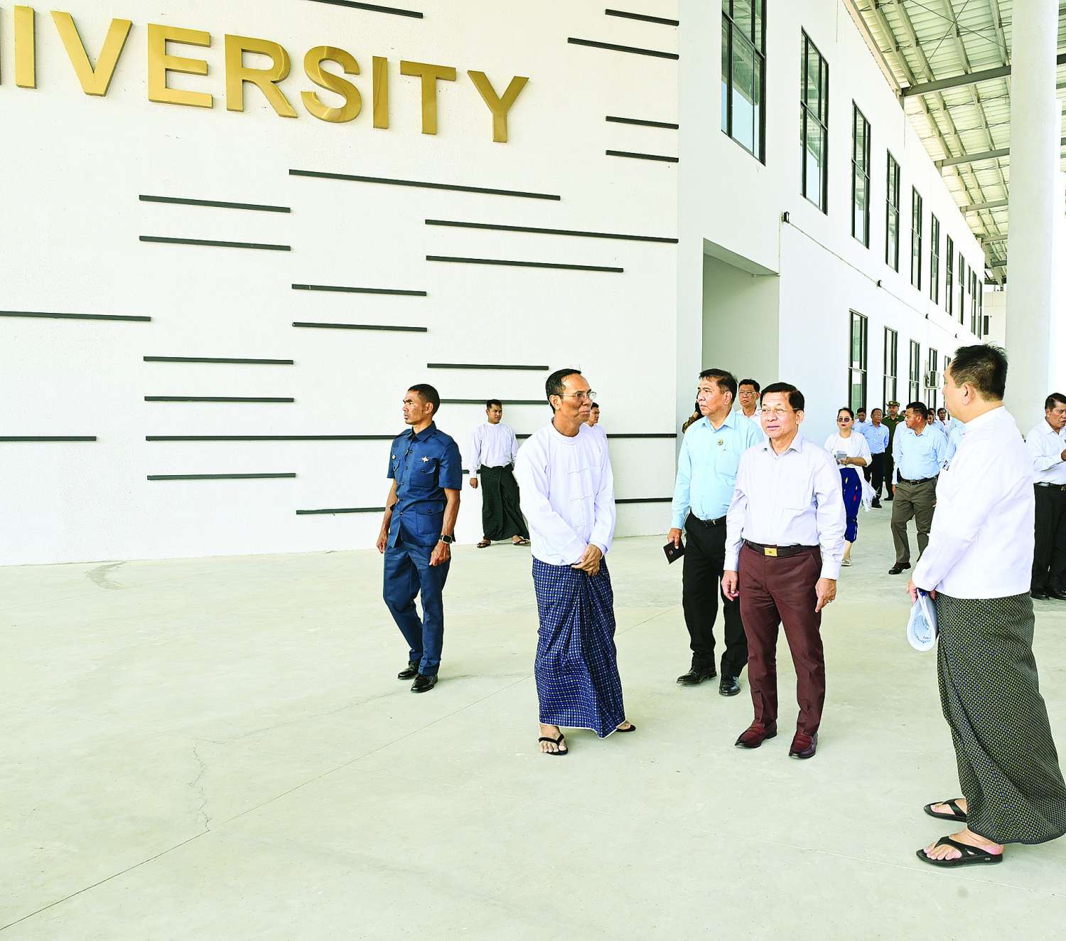 ယင်းနောက် နိုင်ငံတော်စီမံအုပ်ချုပ်ရေးကောင်စီဥက္ကဋ္ဌ နိုင်ငံတော်ဝန်ကြီးချုပ်သည် ပင်မသုံးထပ်စာသင်ဆောင်အသစ် တည်ဆောက်ပြီးစီးမှု အခြေအနေများ၊ ကျောင်းဝင်းအတွင်းရှိ စာသင်ဆောင်များနှင့် ပွဲကြည့်စင်နှင့်ပြေးလမ်းပါဘောလုံးကွင်း တည်ဆောက်နေမှု အခြေအနေများကို လိုက်လံကြည့်ရှုစစ်ဆေးပြီး တာဝန်ရှိသူများ၏ တင်ပြချက်များအပေါ် လိုအပ်သည်များလမ်းညွှန်မှာကြားသည်။