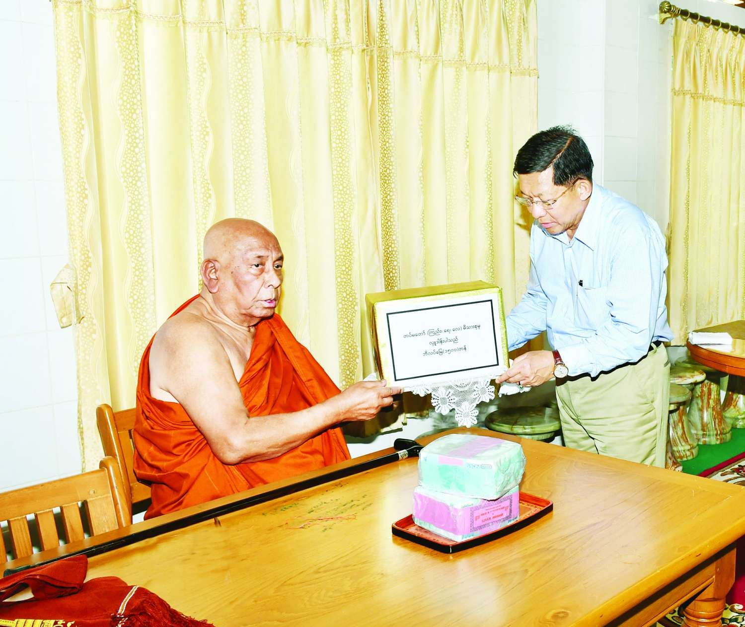 ထို့နောက် နိုင်ငံတော်စီမံအုပ်ချုပ်ရေးကောင်စီဥက္ကဋ္ဌ နိုင်ငံတော်ဝန်ကြီးချုပ်သည် ဇနီး ဒေါ်ကြူကြူလှနှင့် အဖွဲ့ဝင်များ လိုက်ပါ၍ သီတဂူဝိပဿနာကျောင်းတိုက်သို့ ရောက်ရှိပြီး နိုင်ငံတော်ဩဝါဒါစရိယ သောဠသမ ရွှေကျင်သာသနာပိုင် ဆရာတော်၊ သီတဂူ ကမ္ဘာ့ဗုဒ္ဓ တက္ကသိုလ်များ၏ အဓိပတိ အဘိဓဇမဟာရဋ္ဌဂုရု အဘိဓဇ အဂ္ဂမဟာသဒ္ဓမ္မ ဇောတိက ဒေါက်တာ ဘဒ္ဒန္တဉာဏိဿရအား ဖူးမြော်ကြည်ညိုကာ ငလျင်ဘေးဒဏ်ကြောင့် ပြိုကျပျက်စီးမှုများ ဖြစ်ပေါ်ခဲ့ရသည့် မြတ်စွာဘုရားရှင်၏ ဓာတ်တော်မွေတော်များ ကိန်းဝပ်ရာ ဘုရား၊ စေတီပုထိုးများ ပြုပြင်ထိန်းသိမ်းစောင့်ရှောက်ရေးလုပ်ငန်းများတွင် အသုံးပြုရန်အတွက် နိုင်ငံတော်စီမံအုပ်ချုပ်ရေးကောင်စီဥက္ကဋ္ဌ နိုင်ငံတော်ဝန်ကြီးချုပ်နှင့်ဇနီး မိသားစုမှ လှူဒါန်းသည့် အလှူငွေကျပ်သိန်း ၂၀၀ နှင့် တပ်မတော် (ကြည်း၊ရေ၊လေ)မိသားစုများမှ လှူဒါန်းသည့် ဘိလပ်မြေတန်ချိန် ၁၅၀၀ တို့ကို ဆက်ကပ်လှူဒါန်းသည်။ ယင်းနောက် လှူဒါန်းမှုအစုစုတို့အား ငလျင်သဘာဝဘေးကြောင့် အသက်ခန္ဓာဆုံးရှုံးခဲ့ရသည့် ရဟန်းသံဃာများ၊ သာသနာနွယ်ဝင် သီလရှင်များနှင့် ပြည်သူအပေါင်းတို့ ရရှိစေရန် အမျှပေးဝေကြသည်။