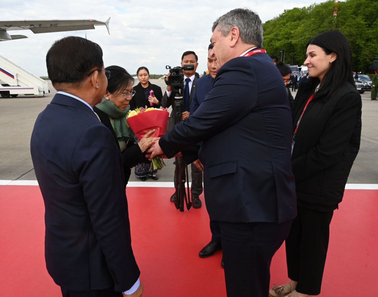 နိုင်ငံတော်စီမံအုပ်ချုပ်ရေးကောင်စီဥက္ကဋ္ဌ နိုင်ငံတော်ဝန်ကြီးချုပ်နှင့် ဇနီး ဦးဆောင်သည့် မြန်မာအဆင့်မြင့်ကိုယ်စားလှယ်အဖွဲ့အား ကောင်စီဒုတိယဥက္ကဋ္ဌ ဒုတိယဝန်ကြီးချုပ် ဒုတိယဗိုလ်ချုပ်မှူးကြီး စိုးဝင်းနှင့် ဇနီး ဒေါ်သန်းသန်းနွယ်၊ ကောင်စီအတွင်းရေးမှူး ဗိုလ်ချုပ်ကြီး အောင်လင်းဒွေးနှင့် ဇနီး၊ ကောင်စီအဖွဲ့ဝင်များ၊ ပြည်ထောင်စုဝန်ကြီးများ၊ နေပြည်တော်ကောင်စီဥက္ကဋ္ဌ၊ ကာကွယ်ရေးဦးစီးချုပ်ရုံးမှ အဆင့်မြင့်တပ်မတော်အရာရှိကြီးများနှင့် ဇနီးများ၊ နေပြည်တော်တိုင်းစစ်ဌာနချုပ် တိုင်းမှူး၊ မြန်မာနိုင်ငံဆိုင်ရာ ရုရှားဖက်ဒရေးရှင်းနိုင်ငံသံရုံး၊ စစ်သံရုံးတို့မှ တာဝန်ရှိသူများက လေဆိပ်၌ ပို့ဆောင်နှုတ်ဆက်ကြသည်။