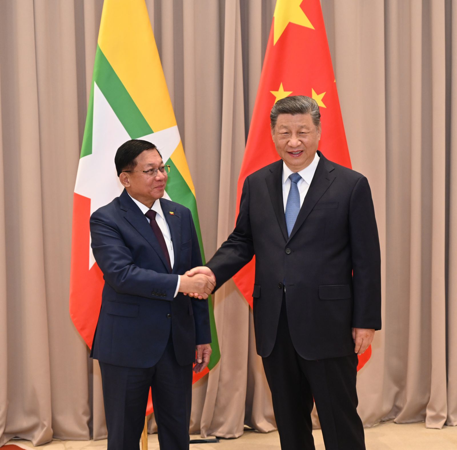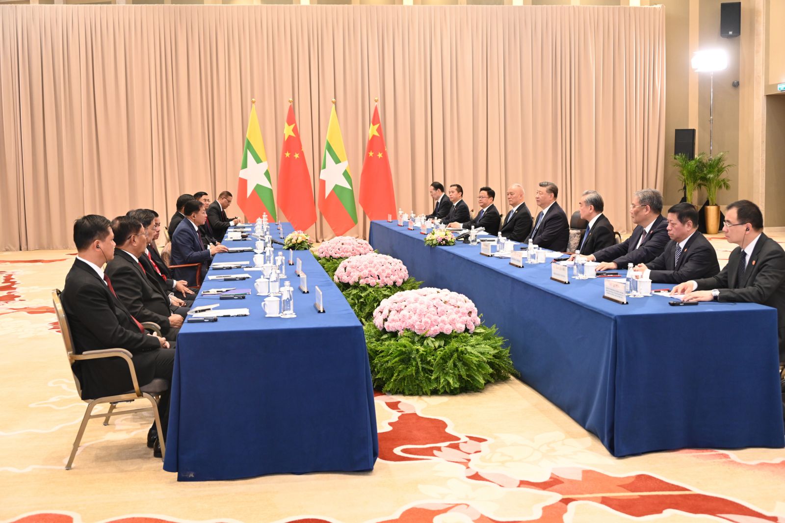 ထို့နောက် နိုင်ငံတော်စီမံအုပ်ချုပ်ရေးကောင်စီဥက္ကဋ္ဌ နိုင်ငံတော်ဝန်ကြီးချုပ်နှင့် တရုတ်ပြည်သူ့သမ္မတနိုင်ငံသမ္မတတို့သည် နှစ်နိုင်ငံဆက်ဆံမှု တိုးမြှင့်ဆောင်ရွက်ရေး၊ ကဏ္ဍပေါင်းစုံတွင် ပူးပေါင်းဆောင်ရွက်မှုများ မြှင့်တင်နိုင်ရေး၊ ဆွေမျိုးပေါက်ဖော် ချစ်ကြည်ရင်းနှီးမှုနှင့် အေးအတူပူအမျှ အသိုက်အဝန်းတည်ဆောက်ရေး၊ ဒေသတွင်း တည်ငြိမ်အေးချမ်းရေးဆိုင်ရာကိစ္စရပ်များတွင် ပူးပေါင်းဆောင်ရွက်ရေးတို့နှင့်ပတ်သက်၍ ခင်မင်ရင်းနှီးစွာ အမြင်ချင်းဖလှယ်ဆွေးနွေးခဲ့ကြသည်။