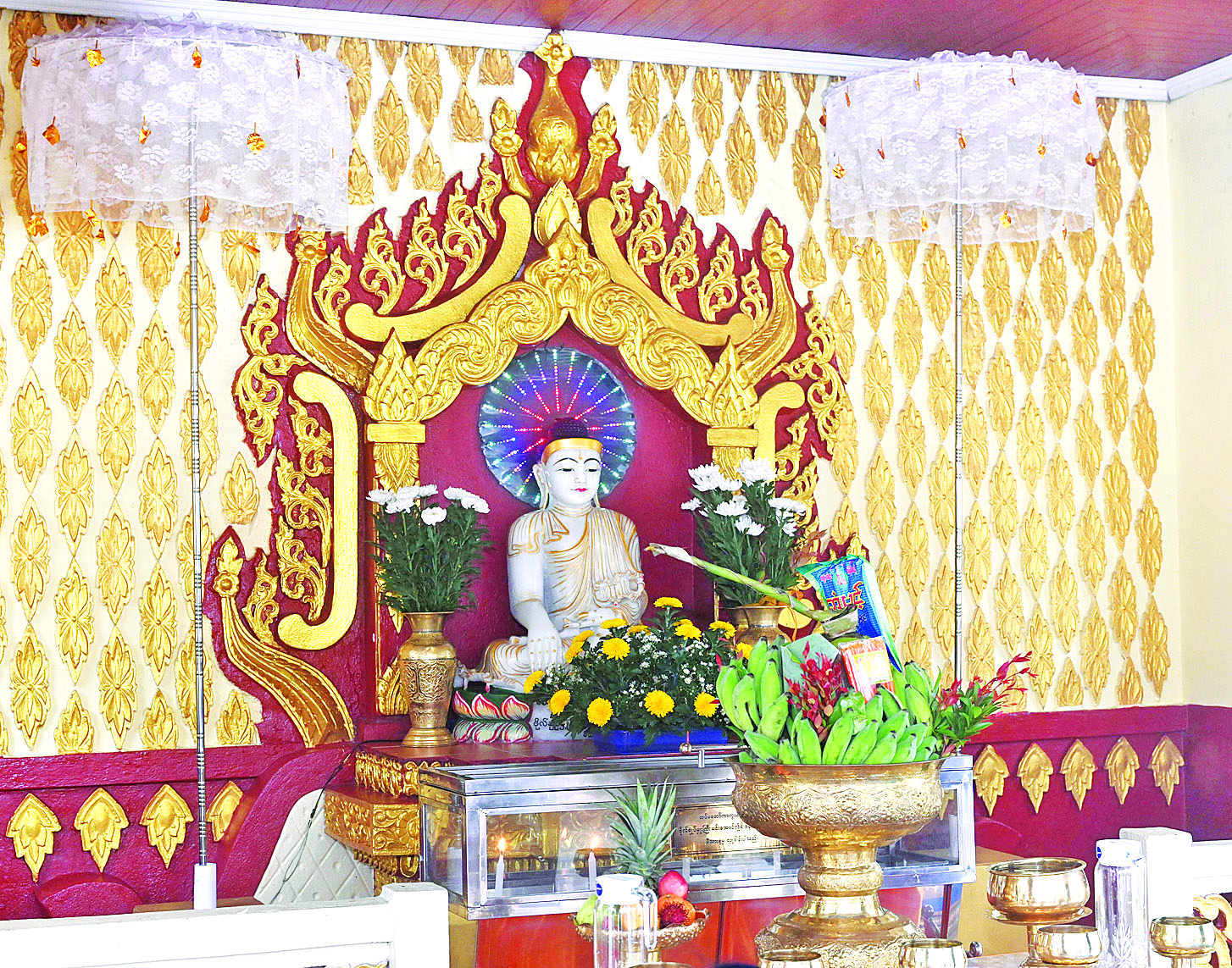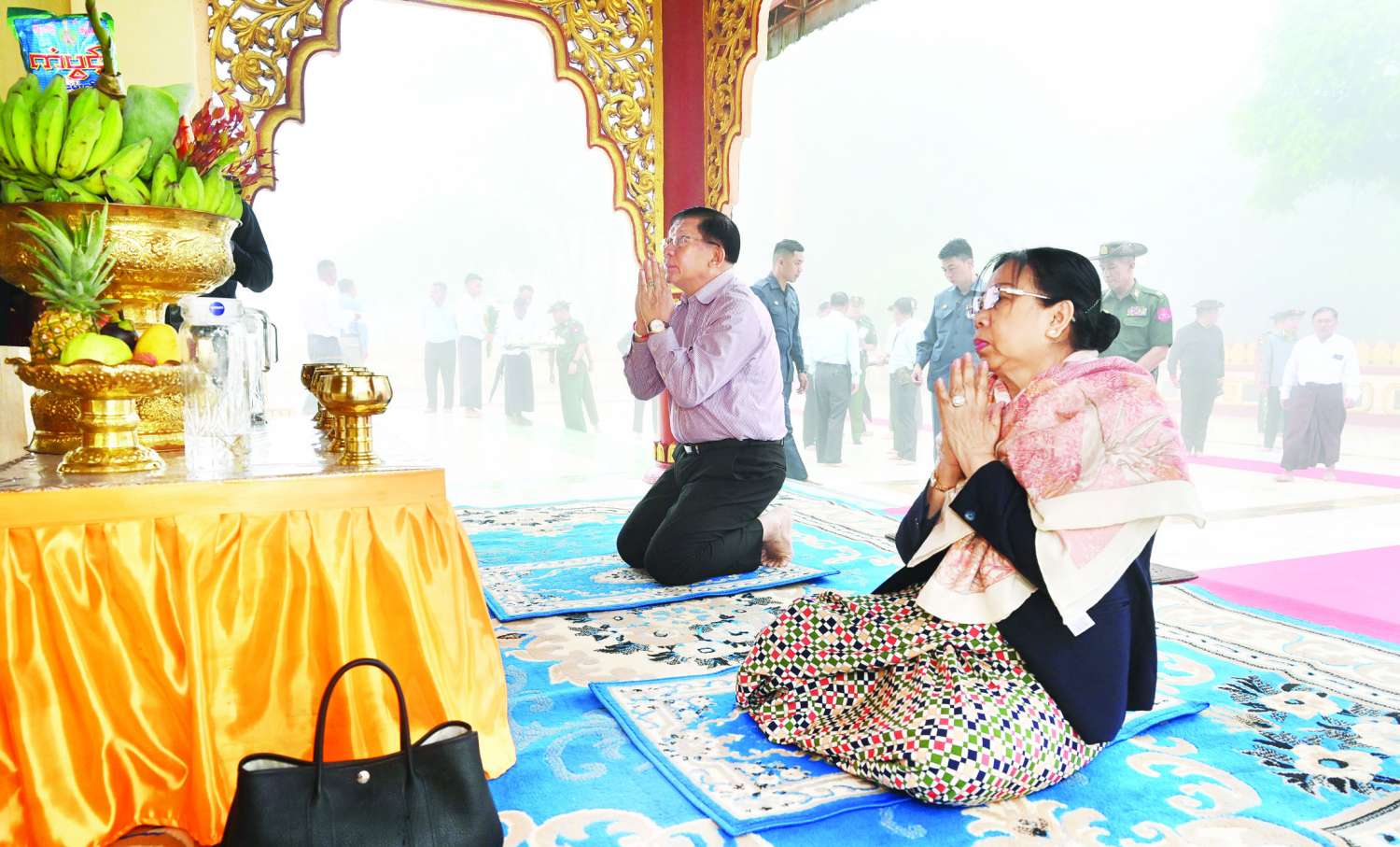 နိုင်ငံတော်စီမံအုပ်ချုပ်ရေးကောင်စီဥက္ကဋ္ဌ နိုင်ငံတော်ဝန်ကြီးချုပ်နှင့် ဇနီး၊ အဖွဲ့ဝင်များသည် လွိုင်မွေတောင်စခန်းမြို့ရှိ စတုရဋ္ဌသုမင်္ဂလစေတီတော်သို့ ရောက်ရှိကြပြီး စေတီတော်မြတ်အား ဖူးမြော်ကြည်ညိုကာ ပန်း၊ ရေချမ်း၊ ဆီမီး ကပ်လှူပူဇော်သည်။ ယင်းနောက် နိုင်ငံတော်စီမံအုပ်ချုပ်ရေးကောင်စီဥက္ကဋ္ဌ နိုင်ငံတော်ဝန်ကြီးချုပ်နှင့် ဇနီးတို့သည် စေတီတော်ဓမ္မာရုံတော်အတွင်းရှိ ဗုဒ္ဓရုပ်ပွားတော်မြတ်အား ဖူးမြော်ကြည်ညိုသည်။
