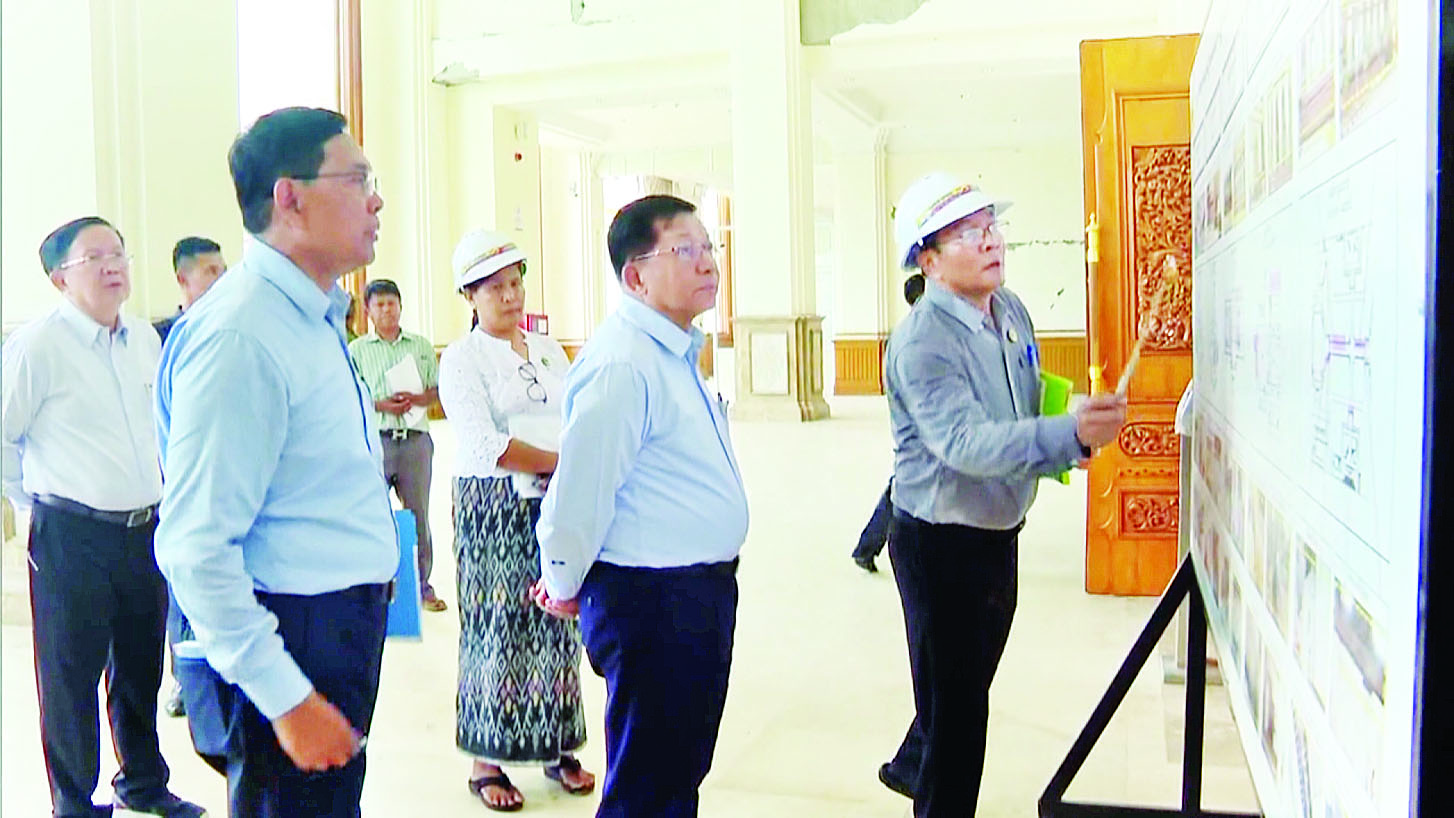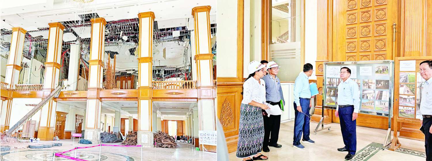 နိုင်ငံတော်စီမံအုပ်ချုပ်ရေးကောင်စီဥက္ကဋ္ဌ နိုင်ငံတော်ဝန်ကြီးချုပ် ဗိုလ်ချုပ်မှူးကြီး မင်းအောင်လှိုင် ငလျင်ဘေးဒဏ်ကြောင့် ထိခိုက်ပျက်စီးမှုများဖြစ်ပေါ်ခဲ့သည့် လွှတ်တော်အဆောက်အဦများအား ပြန်လည်ပြုပြင်ရေးလုပ်ငန်းများ ဆောင်ရွက်နေမှုအခြေအနေများကို သွားရောက်ကြည့်ရှုစစ်ဆေး၊ လိုအပ်သည်များလမ်းညွှန်မှာကြား