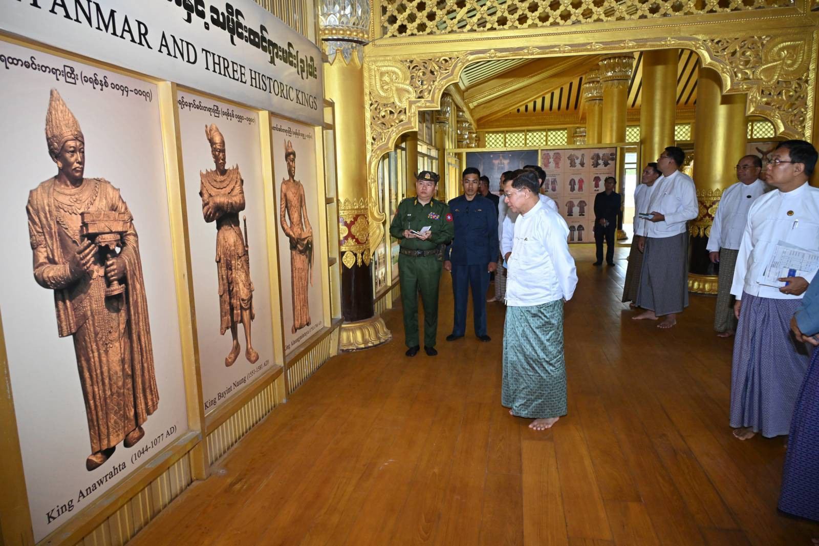 ယင်းနောက် နိုင်ငံတော်စီမံအုပ်ချုပ်ရေးကောင်စီဥက္ကဋ္ဌ နိုင်ငံတော်ဝန်ကြီးချုပ်နှင့်\အဖွဲ့ဝင်များသည် ပဲခူးမြို့၊ ကမ္ဘောဇသာဒီရွှေနန်းတော်သို့ ရောက်ရှိကြပြီး ရွှေနန်းတော်အတွင်း ယခင်မြေနန်း ပြသာဒ်ဆောင်နေရာမှ တူးဖော်ရရှိသည့် ကျွန်းတိုင်များကို ပြသထားရှိမှု၊ နန်းတော်အတွင်း ပြုပြင် ထိန်းသိမ်းခြင်းလုပ်ငန်းများ ဆောင်ရွက်လျက်ရှိမှုအခြေအနေများနှင့် နန်းတော်အတွင်း လှည့်လည် ကြည့်ရှုစစ်ဆေးပြီး တာဝန်ရှိသူများ၏ တင်ပြချက်များအပေါ် ပြုပြင်ထိန်းသိမ်းခြင်းလုပ်ငန်းများကို ဆောင်ရွက်ရာတွင် အဆင့်ဆင့် အသေးစိတ် ပြင်ဆင်ဆောင်ရွက်သွားရန်လိုကြောင်း၊ နန်းတော်အတွင်း အမြဲသန့်ရှင်းသပ်ရပ်စေရေး ဆောင်ရွက်နေရန် လိုကြောင်း၊ ရှေးခေတ်အသုံးအဆောင် ပစ္စည်းများအားပျက်စီးမှု မရှိစေရေး ထိန်းသိမ်းပြသထားရန်လိုကြောင်း၊ နန်းတော်ဝန်းအတွင်း လမ်းများကောင်းမွန်အောင် ပြုပြင်ထိန်းသိမ်းခြင်းလုပ်ငန်းများကိုလည်း ဆောင်ရွက်ရန်လိုကြောင်း၊ ရေဝပ်ဧရိယာများ မရှိစေရေးဆောင်ရွက်ရန်နှင့် ရေနုတ်မြောင်းများ တူးဖော်ခြင်းလုပ်ငန်းများကို ဆောင်ရွက်သွားရန် လိုကြောင်း၊ နန်းတော်ကြီး ရေရှည် တည်တံ့နေစေရေး ပြုပြင်ထိန်းသိမ်းခြင်း လုပ်ငန်းများကို စနစ်တကျဖြင့် ဆောင်ရွက်သွားရန်လိုကြောင်းဖြင့် မှာကြားသည်။