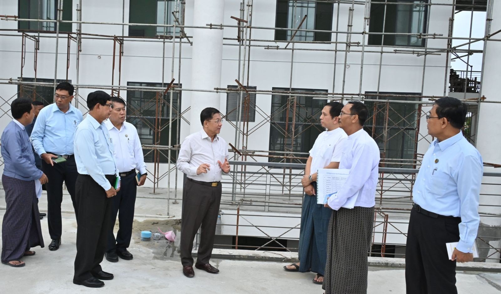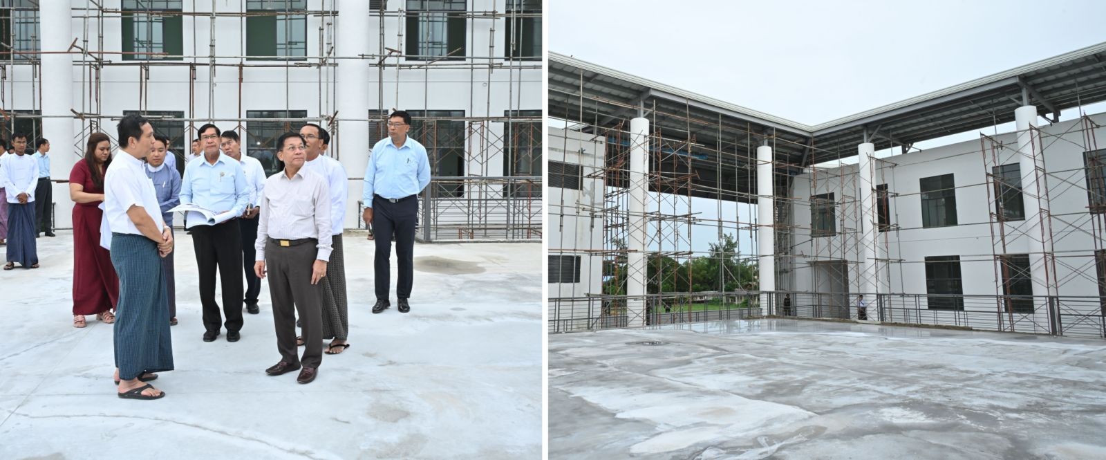 ယင်းနောက် နိုင်ငံတော်စီမံအုပ်ချုပ်ရေးကောင်စီဥက္ကဋ္ဌ နိုင်ငံတော်ဝန်ကြီးချုပ်နှင့်အဖွဲ့ဝင်များသည် ရန်ကုန်အနောက်ပိုင်း နည်းပညာတက္ကသိုလ်သို့ရောက်ရှိကြပြီး တက္ကသိုလ်အတွင်း စာသင်ဆောင်အသစ်ဆောက်လုပ်နေမှုများကို ကြည့်ရှုစစ်ဆေးရာ ပါမောက္ခချုပ် ဒေါက်တာကြည်စိုး၊ ရန်ကုန်တိုင်းဒေသကြီး ဝန်ကြီးချုပ်နှင့် တာဝန်ရှိသူများက စာသင် ဆောင်အသစ် ဆောက်လုပ်နေမှုအခြေအနေများနှင့်ပတ်သက်၍ လိုက်လံရှင်းလင်းတင်ပြကြသည်။