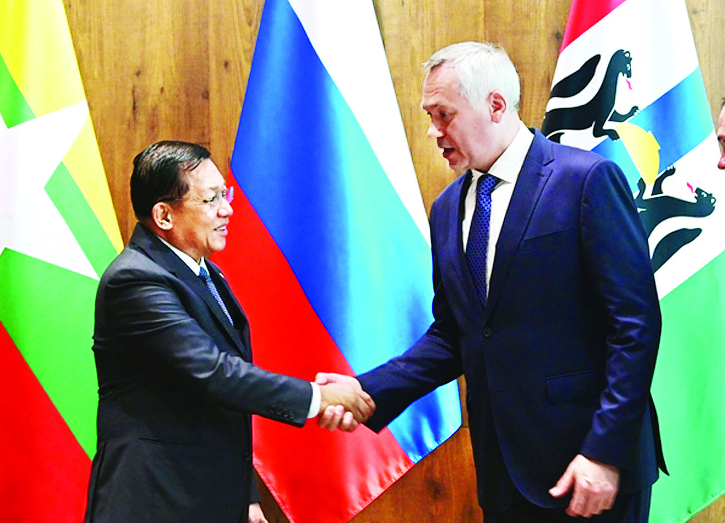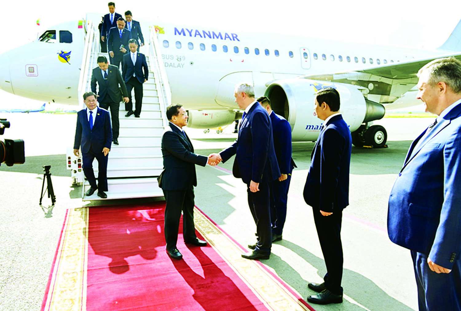 EAEU ၏ အလှည့်ကျဥက္ကဋ္ဌဖြစ်သည့် ဘယ်လာရုစ်သမ္မတ နိုင်ငံသမ္မတ H.E. Mr. Alexander Grigoryevich Lukashenko ၏ ဖိတ်ကြားချက်အရ မင့်စ်မြို့၌ ကျင်းပပြုလုပ်မည့် စတုတ္ထအကြိမ် ဥရောပ-အာရှ စီးပွားရေးဖိုရမ် (EEF 2025)သို့ တက်ရောက်ရန်အတွက် နိုင်ငံတော်စီမံအုပ်ချုပ်ရေးကောင်စီဥက္ကဋ္ဌ နိုင်ငံတော်ဝန်ကြီးချုပ် ဗိုလ်ချုပ်မှူးကြီးမင်းအောင်လှိုင် ဦးဆောင်သည့် မြန်မာအဆင့်မြင့် ကိုယ်စားလှယ်အဖွဲ့သည် ယနေ့နံနက်ပိုင်းတွင် မြန်မာနိုင်ငံမှ အထူးလေယာဉ်ဖြင့် ထွက်ခွာခဲ့ပြီး ညနေပိုင်းတွင် နိုဗာစီဗစ်မြို့ သာမာရှယ်ဗာလေဆိပ်သို့ ရောက်ရှိရာ နိုဗာစီဗစ်ဒေသအုပ်ချုပ်ရေးမှူး Mr. Travnikov Ahdrey Aleksandrovich နှင့် တာဝန်ရှိသူများက လေဆိပ်၌ လှိုက်လှဲနွေးထွေးစွာ ကြိုဆိုနှုတ်ဆက်သည်။