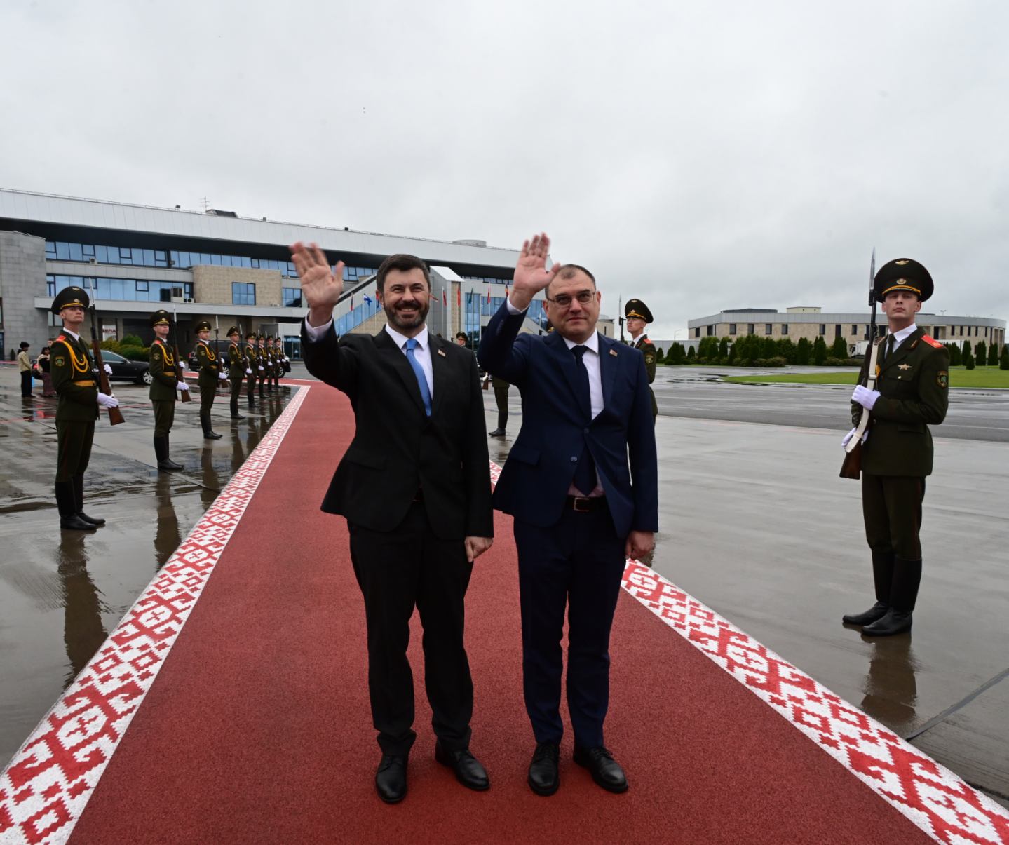 နိုင်ငံတော်စီမံအုပ်ချုပ်ရေးကောင်စီဥက္ကဋ္ဌ နိုင်ငံတော်ဝန်ကြီးချုပ်ဦးဆောင်သည့် မြန်မာအဆင့်မြင့်ကိုယ်စားလှယ်အဖွဲ့အား မင့်စ်မြို့၊ အပြည်ပြည်ဆိုင်ရာလေဆိပ်တွင် ဘယ်လာရုစ်သမ္မတနိုင်ငံ၊ ဒုတိယဝန်ကြီးချုပ် Mr. Yuri Shuleiko နှင့် နိုင်ငံခြားရေးဝန်ကြီး ဘယ်လာရုစ်သမ္မတနိုင်ငံ၊ ဒုတိယဝန်ကြီးချုပ် Mr. Yuri Shuleiko နှင့် နိုင်ငံခြားရေးဝန်ကြီးဌာနမှ ဒုတိယဝန်ကြီးဌာန (၁) Mr. Lukashevich Sergey Vladimirovichı ဘယ်လာရုစ်သမ္မတနိုင်ငံဆိုင်ရာ မြန်မာကောင်စစ်ဝန်ချုပ် ဦးမိုးကျော်သူနှင့် တာဝန်ရှိသူများက ပို့ဆောင်နှုတ်ဆက်ကြသည်။