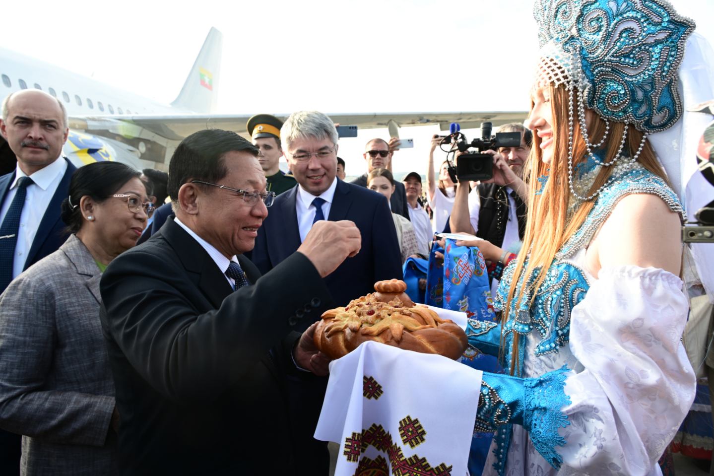 ဦးစွာ နိုင်ငံတော်စီမံအုပ်ချုပ်ရေးကောင်စီဥက္ကဋ္ဌ နိုင်ငံတော်ဝန်ကြီးချုပ် ဗိုလ်ချုပ်မှူးကြီး မင်းအောင်လှိုင်နှင့် ဇနီး ဒေါ်ကြူကြူလှ ဦးဆောင်သော မြန်မာအဆင့်မြင့်ကိုယ်စားလှယ်အဖွဲ့သည် ညစာစားပွဲနေရာသို့ ရောက်ရှိကြရာ Buryatia ပြည်နယ်၊ ပြည်နယ်အကြီးအကဲ၊ ဒုတိယပြည်နယ်အကြီးအကဲနှင့် တာဝန်ရှိသူများက လှိုက်လှဲနွေးထွေးစွာ ကြိုဆိုနှုတ်ဆက်ကြသည်။