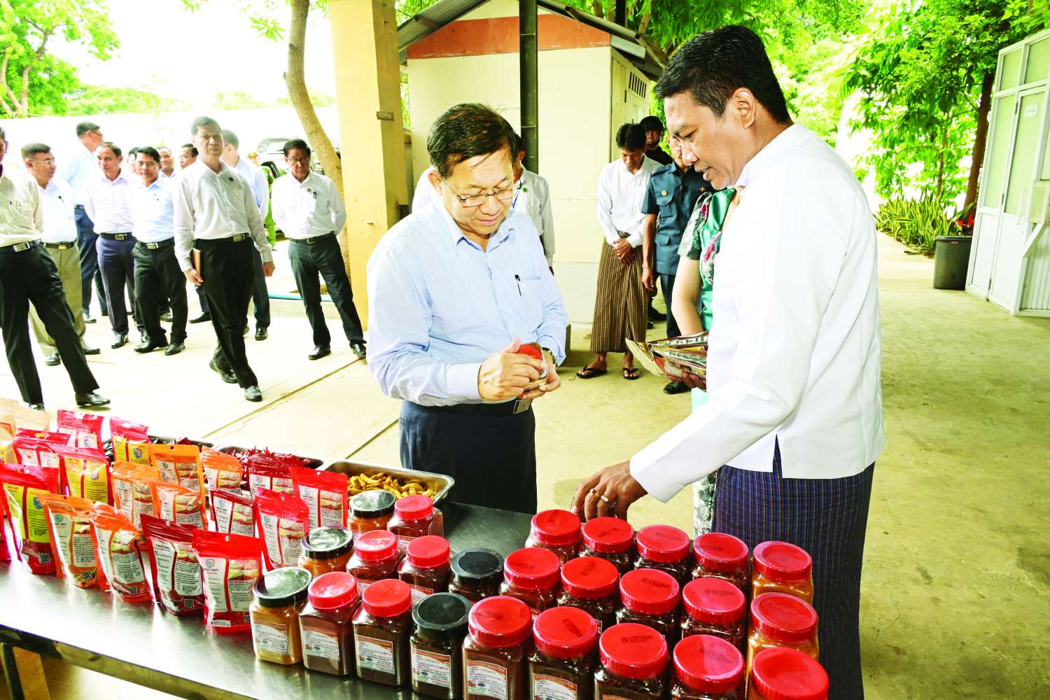 ထို့နောက် နိုင်ငံတော်စီမံအုပ်ချုပ်ရေးကောင်စီဥက္ကဋ္ဌ နိုင်ငံတော်ဝန်ကြီးချုပ်သည် ခရီးစဉ်တွင် လိုက်လာသည့် အဖွဲ့ဝင်များနှင့်အတူ မိတ္ထီလာမြို့ဝမ်းတော်ပြည့် တိုးချဲ့နယ်မြေ(၈)ကျီတော်ကုန်းရပ်ကွက်ရှိ သိန်းမင်းအမှတ်တံဆိပ် ငရုတ်သီးမှုန့်ထုတ်လုပ်ရေးလုပ်ငန်းသို့ ရောက်ရှိကြရာ လုပ်ငန်းရှင်ဦးတင့်နိုင်ဝင်းနှင့် ဒေါ်သန္တာမျိုးတို့က ကြိုဆိုနှုတ်ဆက်ကြသည်။ ယင်းနောက်လုပ်ငန်းမှထုတ်လုပ် လျက်ရှိသည့် ငရုတ်သီးမှုန့် ထုတ်ကုန်များထုတ်လုပ်ထားရှိမှု၊ ပိုးသတ်ပြီး ငရုတ်သီးများအား နေရောင်ခြည်စွမ်းအင်သုံးအခြောက်ခံစက် (Solar Dryer Domes) အတွင်း၌ ငရုတ်သီးအမျိုးအစားအလိုက် Moisture (၈ မှ ၁၀) အထိ ကျအောင်အခြောက်ခံထားရှိမှု၊ ငရုတ်ခြောက်များအား အညှာခြွေသန့်စင်မှု၊ သန့်စင်ပြီး ငရုတ်ခြောက်များအား မှိုဝင်မှုမရှိစေရေး Moisture ၅ အထိ ကျအောင်အခြောက်ခံ၍ ကြိတ်ခွဲနေမှု၊ ထွက်ရှိလာသည့် ကုန်ချောများကို Packing ထုပ်ပိုးနေမှု စသည်ဖြင့် လုပ်ငန်းဆောင်ရွက်နေမှုအဆင့်ဆင့်အား လိုက်လံကြည့်ရှုပြီး လုပ်ငန်းရှင်များ၏ ရှင်းလင်းတင်ပြမှုများအပေါ် သိရှိလိုသည်များ ပြန်လည်မေးမြန်း ဆွေးနွေးကာ အားပေးစကားပြောကြားသည်။