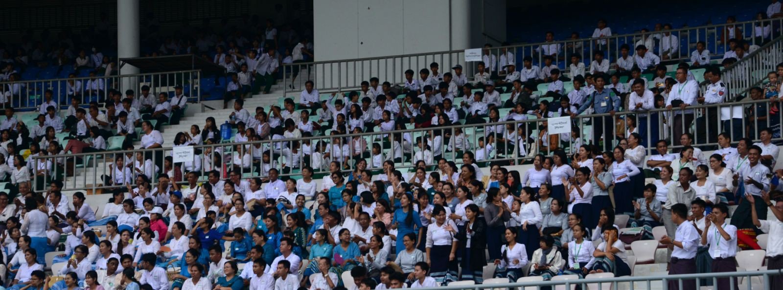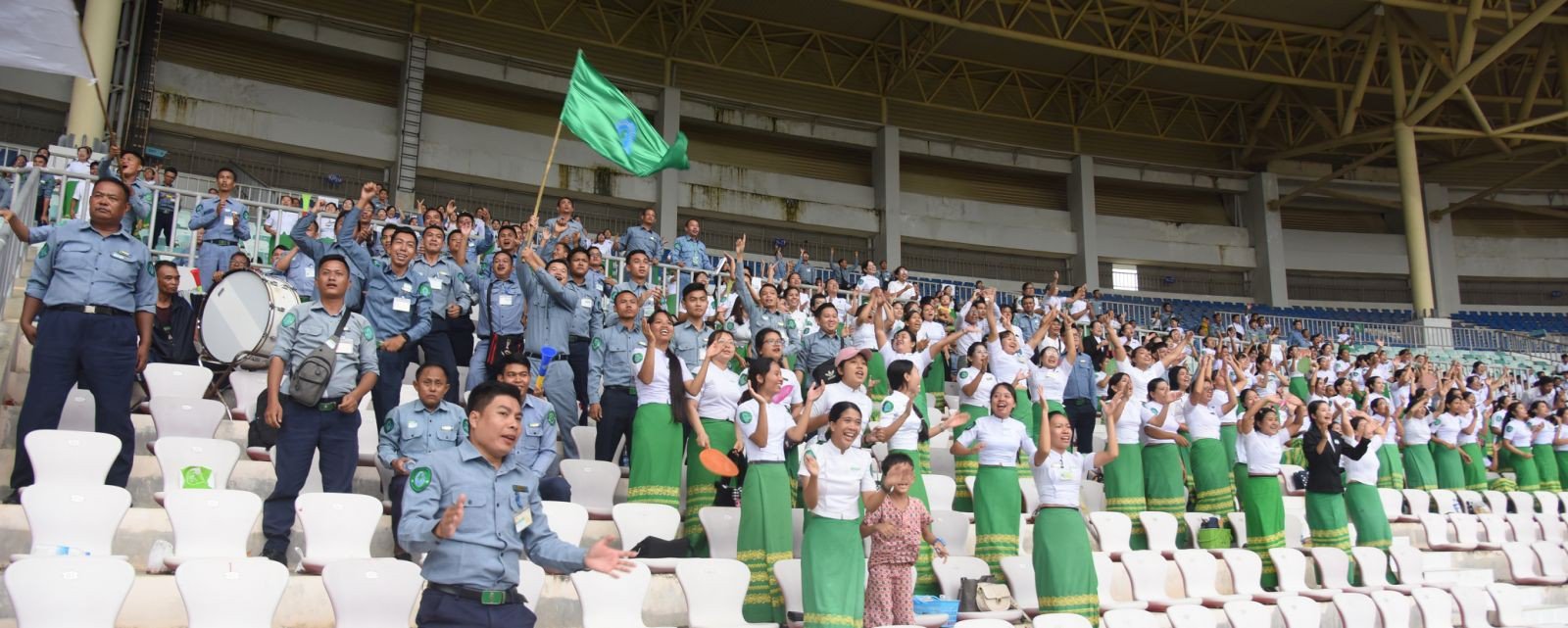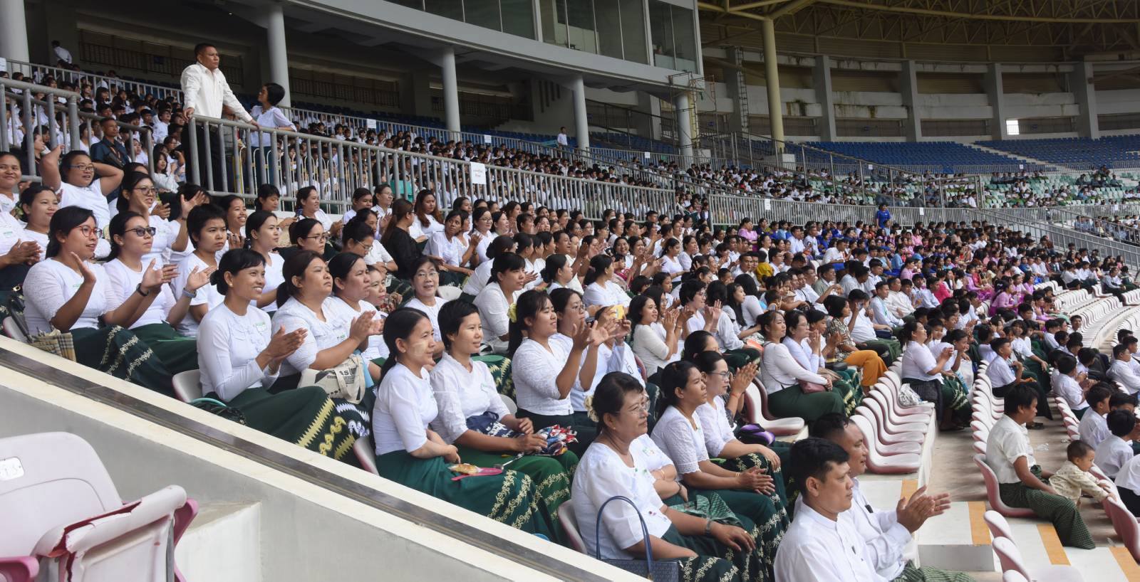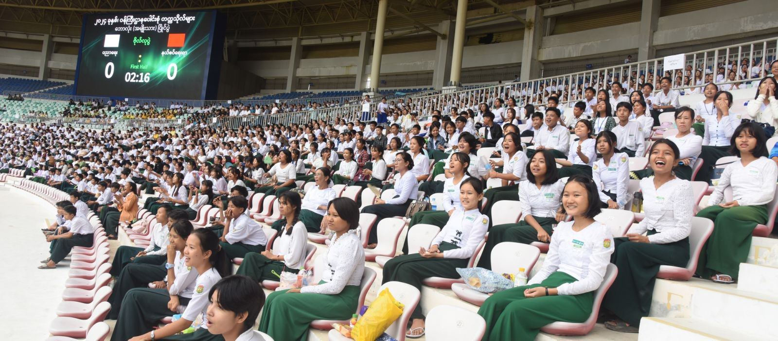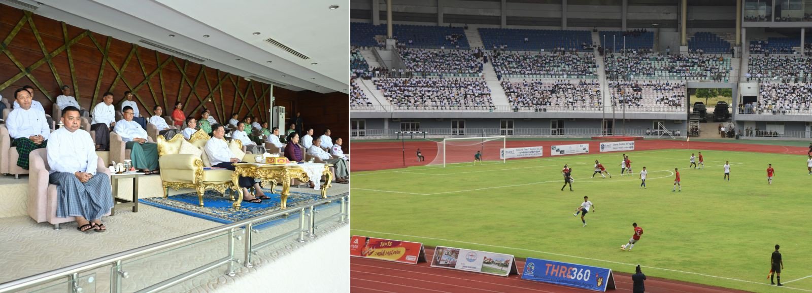 ဦးစွာ နိုင်ငံတော်စီမံအုပ်ချုပ်ရေးကောင်စီဥက္ကဋ္ဌ နိုင်ငံတော်ဝန်ကြီးချုပ်နှင့် တက်ရောက်လာကြသူများသည် ၂၀၂၄ ခုနှစ်၊ ဝန်ကြီးဌာနပေါင်းစုံတက္ကသိုလ်များ ဘောလုံးပြိုင်ပွဲ ဗိုလ်လုပွဲအဖြစ် ပညာရေးဝန်ကြီးဌာန ကိုယ်စားပြုအသင်းနှင့် နယ်စပ်ရေးရာဝန်ကြီးဌာန ကိုယ်စားပြုအသင်းတို့ ယှဉ်ပြိုင်ကစားမှုကို ကြည့်ရှုအားပေးသည်။