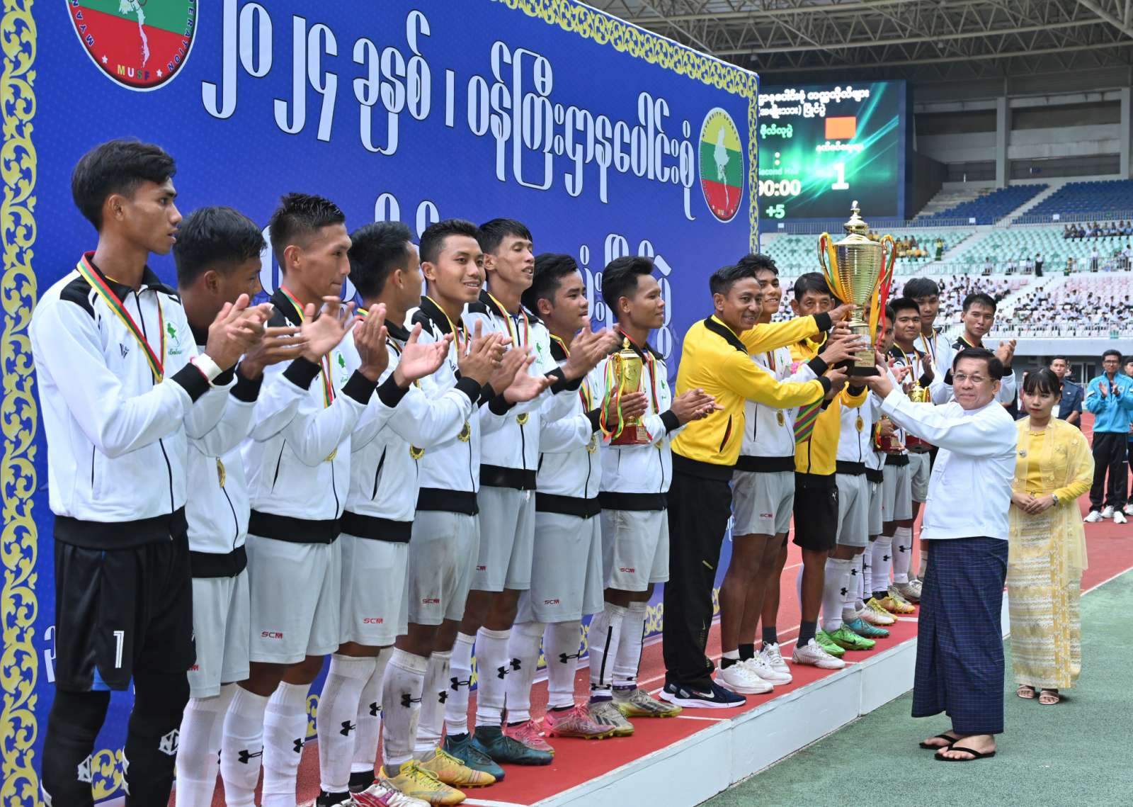 နိုင်ငံတော်စီမံအုပ်ချုပ်ရေးကောင်စီဥက္ကဋ္ဌ နိုင်ငံတော်ဝန်ကြီးချုပ် ဗိုလ်ချုပ်မှူးကြီး မင်းအောင်လှိုင် ၂ဝ၂၄ ခုနှစ်၊ဝန်ကြီးဌာနပေါင်းစုံ တက္ကသိုလ်များ ဘောလုံးပြိုင်ပွဲ ဗိုလ်လုပွဲသို့ တက်ရောက်ကြည့်ရှုအားပေးပြီး ဆုများပေးအပ်ချီးမြှင့်