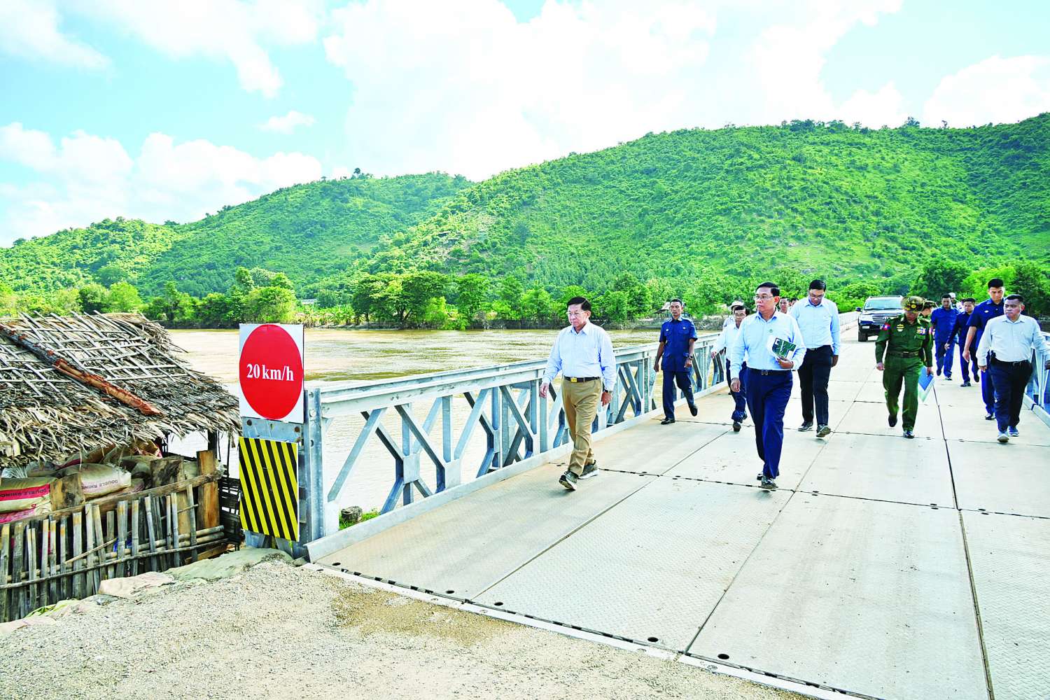 ယင်းနောက် နိုင်ငံတော်စီမံအုပ်ချုပ်ရေးကောင်စီဥက္ကဋ္ဌ နိုင်ငံတော်ဝန်ကြီးချုပ်နှင့် အဖွဲ့ဝင်များသည် နဝင်းချောင်းတံတား (အဆုံ) နေရာသို့ ရောက်ရှိကြပြီး ရေတိုက်စားမှုကြောင့် တံတားချဉ်းကပ်လမ်း ပြိုကျပျက်စီးခဲ့မှုအား ယာယီဘေလီတံတား တည်ဆောက်ပြုပြင်ပြီးစီးမှုနှင့် တံတားချဉ်းကပ်လမ်း ကမ်းကပ်ခုံအား ပြန်လည်ပြုပြင် ဆောင်ရွက်နေမှု အခြေအနေများကို ကြည့်ရှုစစ်ဆေးပြီး တာဝန်ရှိသူများ၏ တင်ပြချက်များအပေါ် လိုအပ်သည်များ မှာကြားခဲ့ကြောင်း သတင်းရရှိသည်။