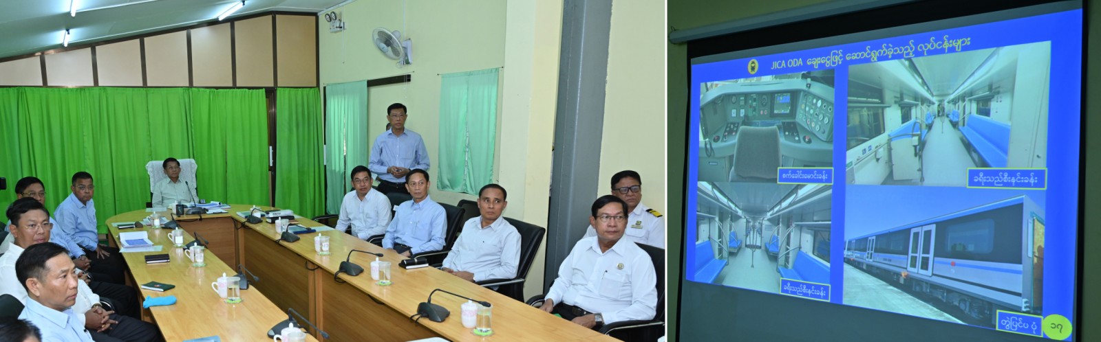 ဦးစွာ နိုင်ငံတော်စီမံအုပ်ချုပ်ရေးကောင်စီဥက္ကဋ္ဌ နိုင်ငံတော်ဝန်ကြီးချုပ်အား စက်ရုံအစည်းအဝေးခန်းမတွင် နိုင်ငံတော်စီမံအုပ်ချုပ်ရေးကောင်စီဝင်၊ ပို့ဆောင်ရေးနှင့် ဆက်သွယ်ရေးဝန်ကြီးဌာန၊ ပြည်ထောင်စုဝန်ကြီး ဗိုလ်ချုပ်ကြီး မြထွန်းဦးက ရန်ကုန်မြို့ပတ်လမ်း အဆင့်မြှင့်တင်ရေးစီမံကိန်း၏ လုပ်ငန်းဆောင်ရွက်မှုအခြေအနေများပတ်သက်၍ မြို့ပတ်ဒီဇယ်စက်ခေါင်းရုံ(အင်းစိန်)၏ သမိုင်းအကျဉ်းနှင့် အချက်အလက်များ၊ မြို့ပတ်ရထားလမ်း၏ သမိုင်းကြောင်းနှင့် အဆင့်မြှင့်တင်ရေးစီမံကိန်း၏ သမိုင်းကြောင်းများ၊ မြို့ပတ်ရထားများ ပြေးဆွဲသွားမည့်အစီအစဉ်များနှင့် ရထားလမ်းဆိုင်ရာ အဆောက်အဦများ၊ ရထားလမ်းတစ်လျှောက် ဘေးအန္တရာယ်ကင်းရှင်းရေးဆိုင်ရာ ဆောင်ရွက်ထားရှိမှုများကိုလည်းကောင်း၊ ရန်ကုန်မြို့ပတ်ရထားလမ်းတစ်လျှောက် လျှပ်စစ်ရထားပြေးဆွဲနိုင်ရေးအတွက် ဆောင်ရွက်ထားရှိမှုအခြေအနေများနှင့်ပတ်သက်၍ လုပ်ငန်းဆောင်ရွက်ခဲ့မှုအခြေအနေများနှင့် လေ့လာရေးအဖွဲ့၏တွေ့ရှိချက်များ၊ မြို့ပတ်လျှပ်စစ်ရထားအတွက် သုံးသပ်တင်ပြချက်များကိုလည်းကောင်း၊ ဒုတိယဝန်ကြီး ဦးအောင်မြိုင်က အဓိကမီးရထားလမ်းပိုင်းများ၌ မြန်နှုန်းမြှင့်တင်မောင်းနှင်နိုင်ရေး ဆောင်ရွက်လျက်ရှိမှုအခြေအနေများနှင့်ပတ်သက်၍ မြန်မာ့မီးရထား၏ နောက်ခံအခြေအနေ၊ လမ်းပိုင်းဆိုင်ရာအချက်အလက်များနှင့် လိုအပ်ချက်များ၊ စက်ခေါင်း၊ တွဲနှင့် DEMU (Rolling Stock) များ၏ စက်မှုပိုင်းဆိုင်ရာ လိုအပ်ချက်များ၊ အချက်ပြနှင့် သွားလာရေးစနစ်ဆိုင်ရာ လိုအပ်ချက်များနှင့် သုံးသပ်ချက်များလည်းကောင်း၊ မြန်မာ့မီးရထား၊ တိုင်းအသီးသီးရှိ လမ်းပိုင်းများတွင် ကွန်ကရစ်ဇလီဖားတုံးများ ထုတ်လုပ်၊ လဲလှယ်နိုင်ရေး ဆောင်ရွက်မည့်အစီအမံနှင့်ပတ်သက်၍ ကွန်ကရစ်ဇလီဖားစက်ရုံများနှင့် ထုတ်လုပ်နိုင်မှုနှင့် ဖြန့်ဝေနိုင်မှု၊ လမ်းပိုင်းများ၌ ကွန်ကရစ်ဇလီဖားတုံးများ ထည့်သွင်းထားရှိမှု၊ လမ်းပိုင်းများအားလုံးတွင် သံလမ်းတစ်ဆက်လျင် ကွန်ကရစ်ဇလီဖားတုံး ၂၁ တုံး အပြည့်ဖြည့်တင်းနိုင်ရေးအတွက် ထပ်မံလိုအပ်ချက်များကိုလည်းကောင်း အသီးသီးရှင်းလင်းတင်ပြကြသည်။