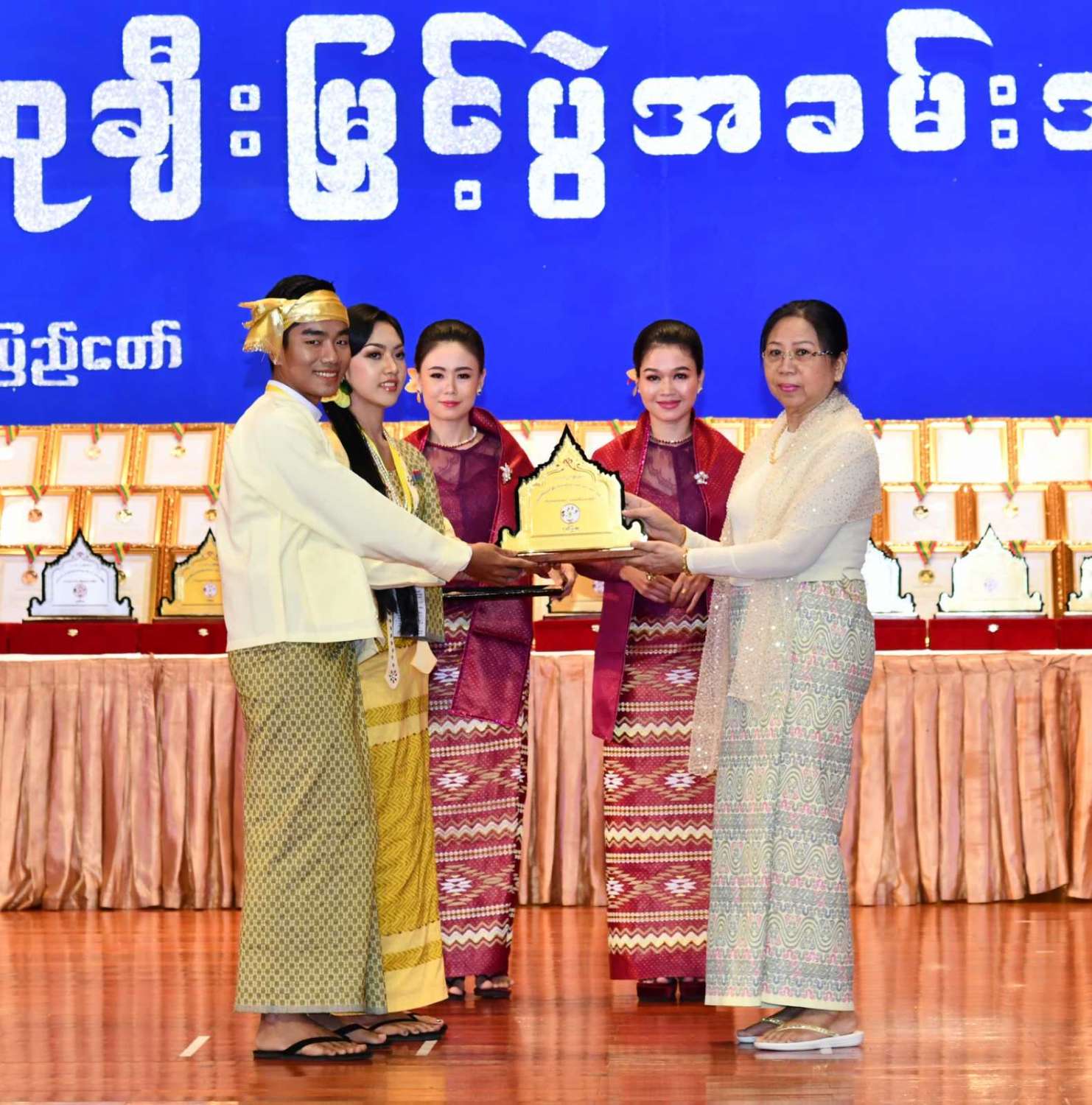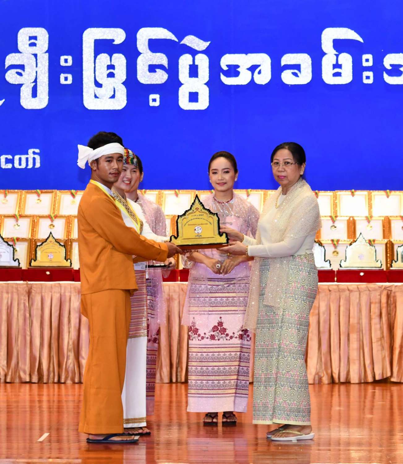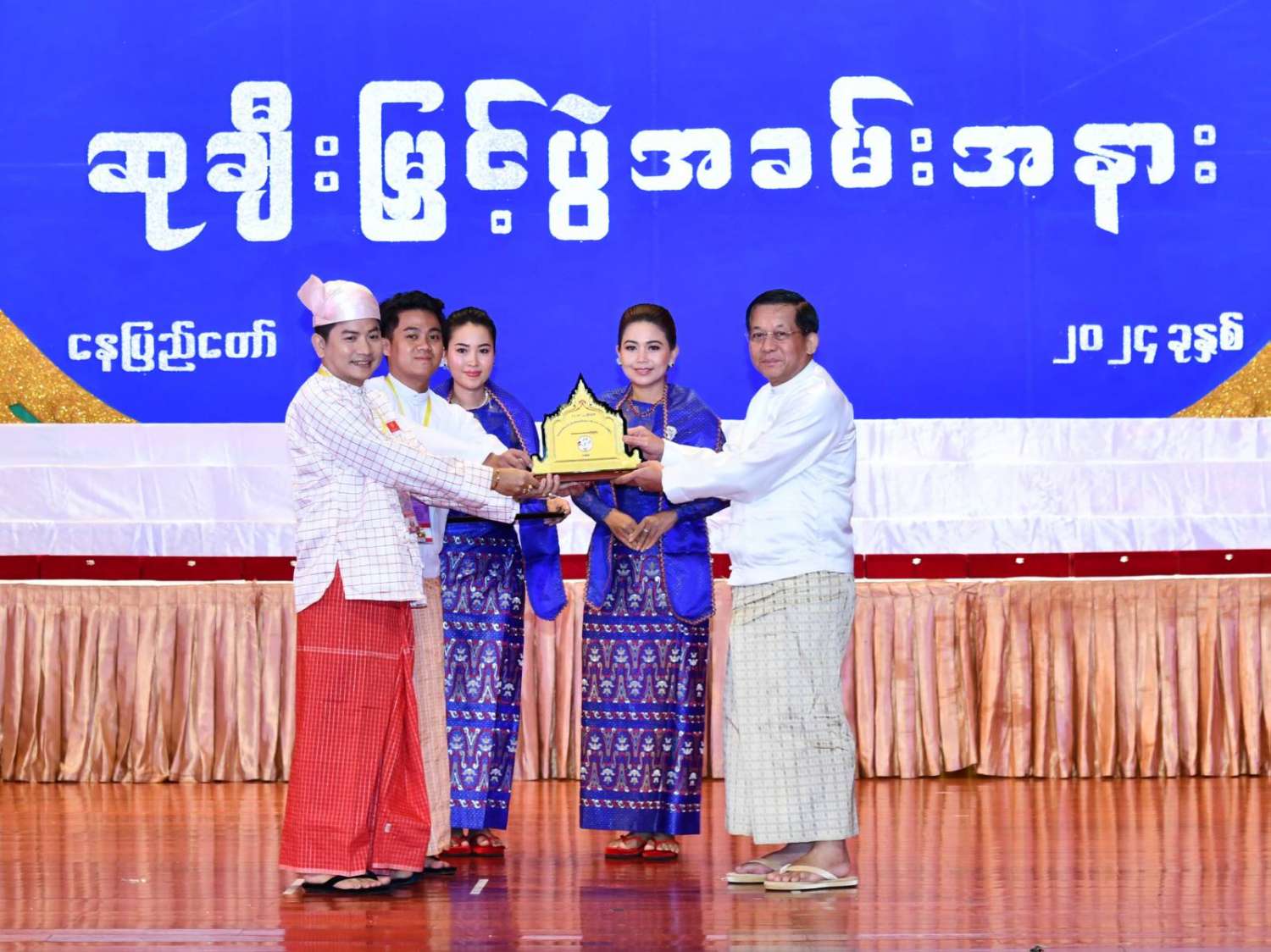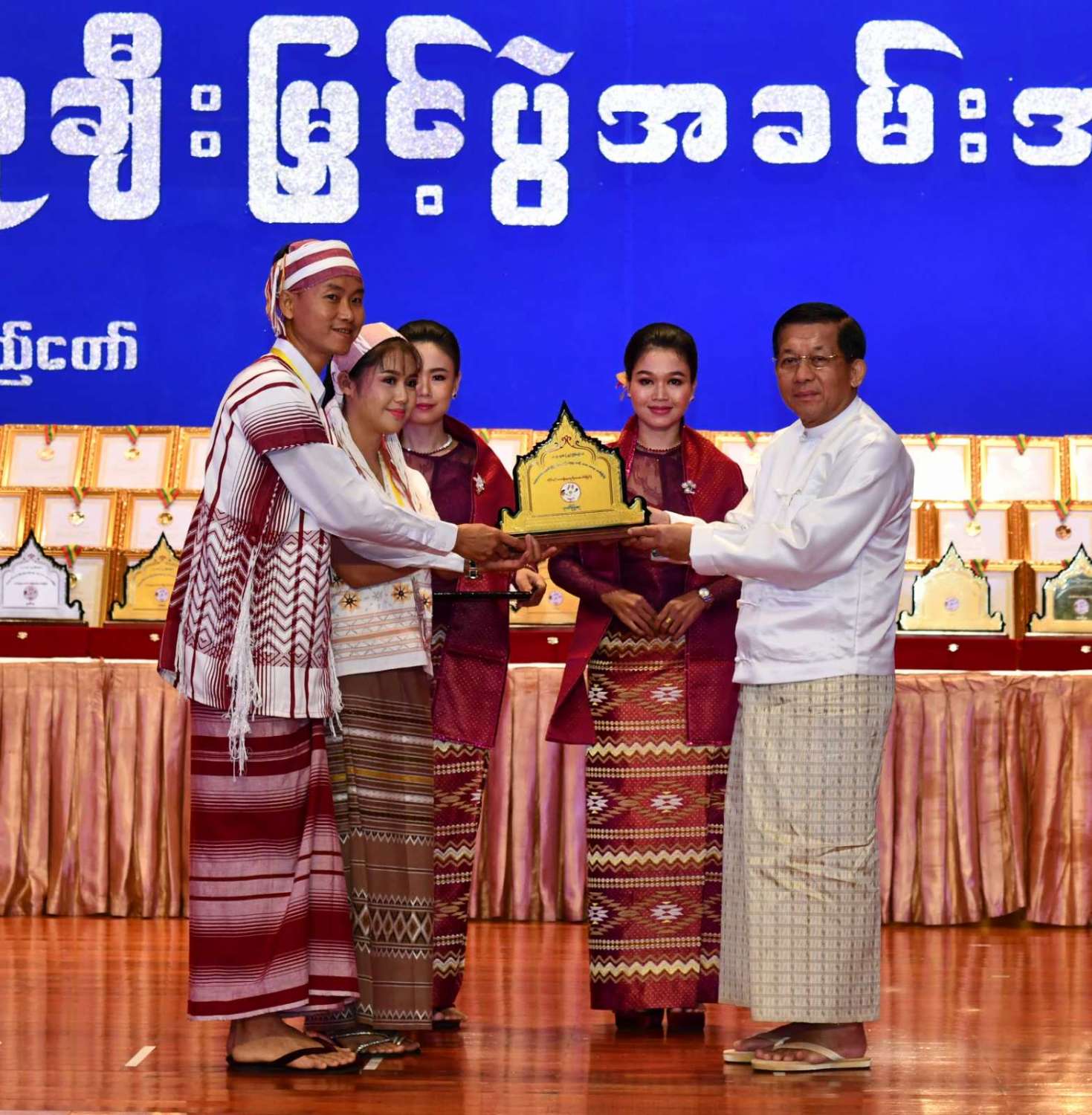 ထို့နောက် ဆုများပေးအပ်ချီးမြှင့်ရာ နိုင်ငံတော်စီမံအုပ်ချုပ်ရေးကောင်စီဥက္ကဋ္ဌ နိုင်ငံတာ်ဝန်ကြီးချုပ်က ကချင်၊ ကယား၊ ကရင်၊ ချင်း၊ မွန်၊ ရခိုင်နှင့် ရှမ်းပြည်နယ်တို့မှ တိုင်းရင်းသားရိုးရာ အကအဖွဲ့များကိုလည်းကောင်း၊ နိုင်ငံတော်စီမံအုပ်ချုပ်ရေးကောင်စီဥက္ကဋ္ဌ နိုင်ငံတာ်ဝန်ကြီးချုပ်၏ ဇနီးက စစ်ကိုင်းတိုင်းဒေသကြီး၊ တနင်္သာရီတိုင်းဒေသကြီး၊ ပဲခူးတိုင်းဒေသကြီး၊ မကွေးတိုင်းဒေသကြီး၊ မန္တလေးတိုင်းဒေသကြီး၊ ရန်ကုန်တိုင်းဒေသကြီးနှင့် ဧရာဝတီတိုင်းဒေသကြီးတို့မှ ကျေးလက်ရိုးရာယဉ်ကျေးမှုအဖွဲ့များကိုလည်းကောင်း ဂုဏ်ပြုဆုများ ပေးအပ်ချီးမြှင့်သည်။