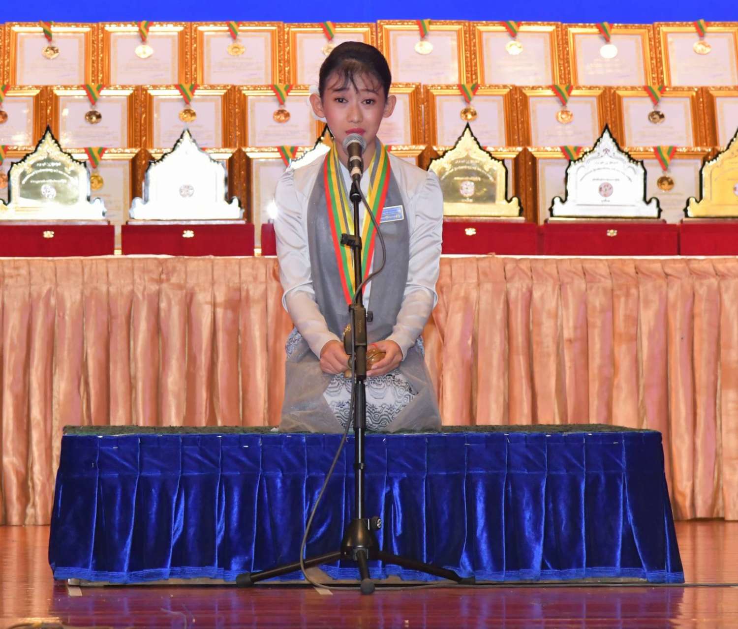 ထိုသို့ ဂုဏ်ပြုဆုများပေးအပ်စဉ် အရေးပြိုင်ပွဲတွင် ဆုရရှိသူများအား ဂုဏ်ပြုဆုတံဆိပ်များနှင့် ဂုဏ်ပြုမှတ်တမ်းလွှာများ ချီးမြှင့်ပေးအပ်အပြီး၌ အရေးပြိုင်ပွဲ၊ အခြေခံပညာအဆင့်(အသက် ၁၅ နှစ်မှ ၂၀ နှစ်အတွင်း) ရွှေတံဆိပ်ဆုရရှိသည့် ရန်ကုန်တိုင်းဒေသကြီးမှ မအိန္ဒြေမြင့်မိုရ်က “လူငယ်အားမာန် အမြဲရှင်သန်” တေးသီချင်းဖြင့်လည်းကောင်း၊ အတီးပြိုင်ပွဲတွင် ဆုရရှိသူများအား ဂုဏ်ပြုဆုတံဆိပ်များနှင့် ဂုဏ်ပြုမှတ်တမ်းလွှာများ ချီးမြှင့်ပေးအပ်အပြီး၌ အတီး(ဒုံမင်း)ပြိုင်ပွဲ၊ အခြေခံပညာအဆင့် (အသက် ၁၅ နှစ်မှ ၂၀ နှစ်အတွင်း)တွင် ရွှေတံဆိပ်ဆုရရှိသည့် ပဲခူးတိုင်းဒေသကြီးမှ မောင်ဟိန်းထက်ပိုင်က “ရွှေမင်းဂံ” သီချင်းဖြင့်လည်းကောင်း သီဆိုတီးခတ်ဖျော်ဖြေတင်ဆက်ကြသည်။