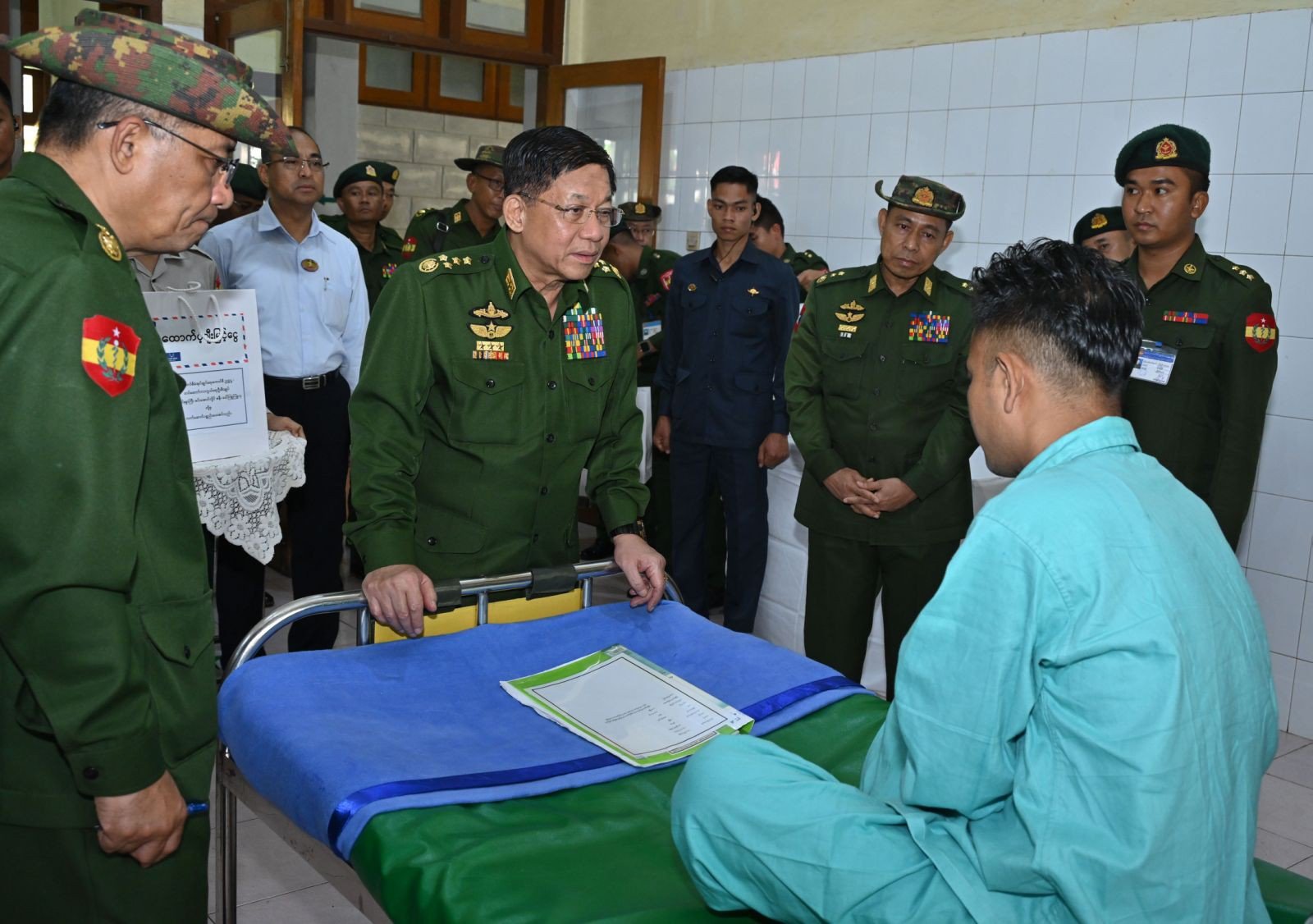 ထို့နောက် နိုင်ငံတော်စီမံအုပ်ချုပ်ရေးကောင်စီဥက္ကဋ္ဌ တပ်မတော်ကာကွယ်ရေးဦးစီးချုပ်နှင့် အဖွဲ့ဝင်များ သည် ကျန်းမာရေးဝန်ကြီးဌာန ပြည်ထောင်စုဝန်ကြီး ဒေါက်တာ သက်ခိုင်ဝင်းနှင့် ရှမ်းပြည်နယ်ဝန်ကြီးချုပ် ဦးအောင်အောင်တို့လိုက်ပါ၍ အောင်ပန်းမြို့ရှိ နယ်မြေခံ တပ်မတော်ဆေးရုံသို့ သွားရောက် ၍ ဆေးရုံတက်ရောက် ကုသမှုခံယူလျက်ရှိသည့် နိုင်ငံတော်ကာကွယ်ရေးနှင့်လုံခြုံရေးတာဝန်များ ထမ်းဆောင်စဉ် ထိခိုက်ဒဏ်ရာရရှိခဲ့သော အရာရှိ၊ စစ်သည်များအား ထိခိုက်ဒဏ်ရာရရှိခဲ့မှု အခြေအနေများ၊ ရောဂါကုသပျောက်ကင်းမှုအခြေအနေများကို တစ်ဦးချင်း လိုက်လံတွေ့ဆုံ၍ ရင်းနှီးနွေးထွေးစွာ မေးမြန်းအားပေးစကား ပြောကြားပြီး အရာရှိ၊ စစ်သည်များ၏ တင်ပြချက်များအပေါ် လိုအပ်သည်များ ဖြည့်ဆည်းဆောင်ရွက်ပေးသည်။