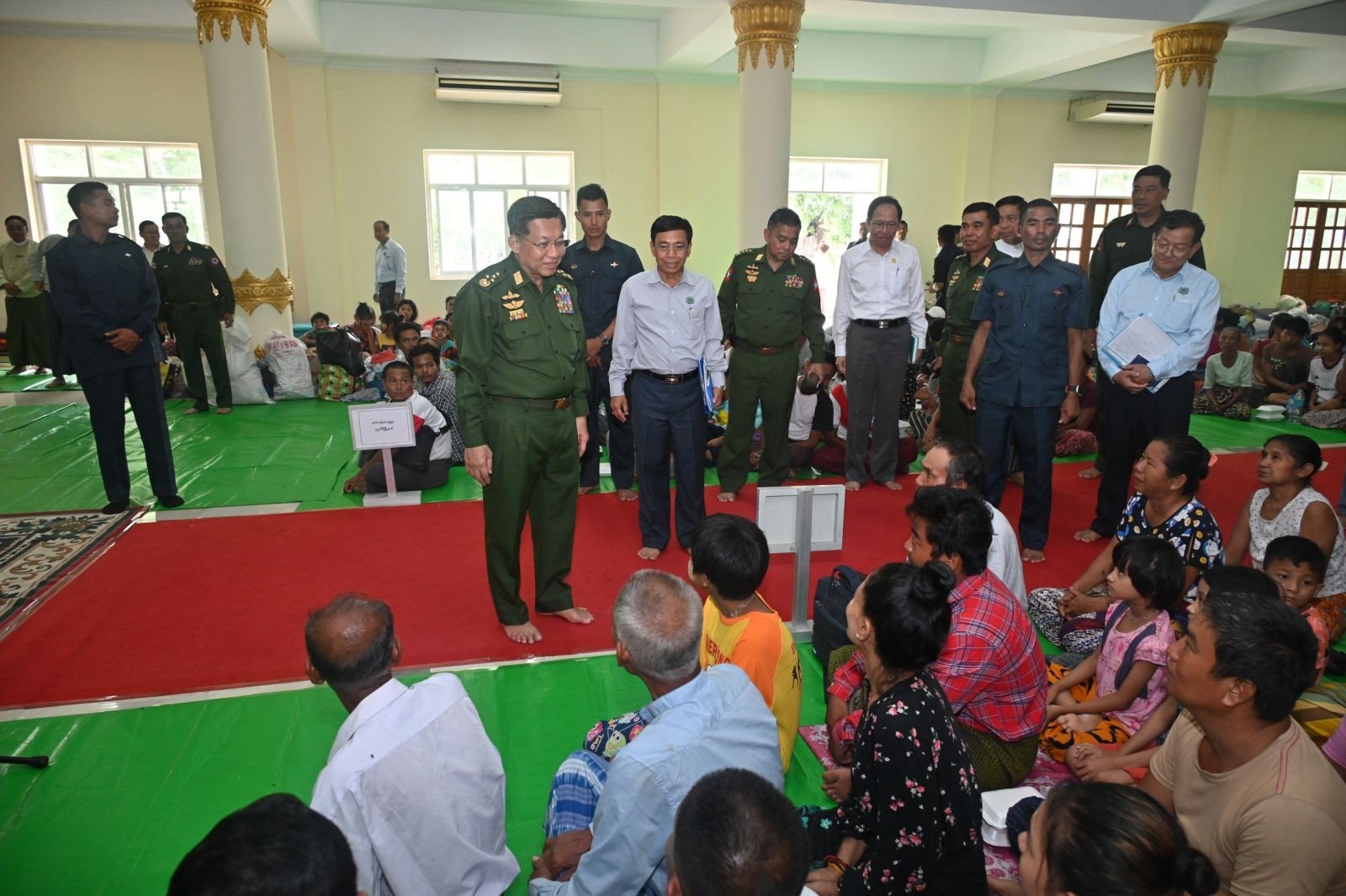 ထို့နောက် နိုင်ငံတော်စီမံအုပ်ချုပ်ရေးကောင်စီဥက္ကဋ္ဌ တပ်မတော်ကာကွယ်ရေးဦးစီးချုပ်က ဆက်လက်ပြောကြားရာတွင် “သဘာဝဘေးအန္တရာယ်ဆိုတာက ရှောင်ရှားလို့ မရဘူးပေါ့ဗျာ၊ တကယ်တော့ စိတ်မကောင်းဘူးပေါ့လေ၊ နိုင်ငံတော်ရဲ့ ဆုံးရှုံးမှုဆိုတဲ့ဟာထဲမှာလည်း ခင်ဗျားတို့ရဲ့ ပိုင်ဆိုင်မှုများပါသလို၊ နိုင်ငံတော်က တည်ဆောက်ထားတဲ့ လမ်းတို့၊ တံတားတို့ အဆောက်အဦတွေ၊ စက်ရုံအလုပ်ရုံတွေ၊ လျှပ်စစ်ဓာတ်ပေးဝေရေးလုပ်ငန်းတွေ၊ ဆက်သွယ်ရေးလုပ်ငန်း၊ ဒါတွေလည်း နိုင်ငံတော်ရဲ့ဆုံးရှုံးသွားတာပဲ၊ ခင်ဗျားတို့လည်း ခင်ဗျားတို့ ပိုင်ဆိုင်မှုတွေ ဆုံးရှုံးသွားတာပဲ၊ ခုနက ကျွန်တော်မေးတယ်၊ ဘာတွေရခဲ့လဲဆိုတော့ အဝတ်တစ်ထည်ကိုယ်တစ်ခုတည်းလို့ ဖြေတဲ့သူလဲ ပါတယ်၊ တချို့လည်း ရတဲ့ဟာတွေ ကောက်ဆွဲလာရတာတွေပါတယ်၊ တချို့လည်း နောက်ဆုံးတော့ သွားနေကျ ဈေးခြင်းလေးပါလာတယ်၊ ဘာပစ္စည်းမှမပါဘူး၊ လူက အဲ့အချိန်မှာ ထူပူနေကြပြီကိုး၊ ဆွဲမိဆွဲရာဆွဲလာတာပေါ့၊ တော်သေးတယ်၊ ကလေးတွေ ပါလာလို့၊ ကျွန်တော်တို့ ဟိုဘက်မှာဆို ကလေးတွေပါသွားတာ ရှိပါတယ်၊ စိတ်လည်း မကောင်းပါဘူး၊ အတတ်နိုင်ဆုံး ခင်ဗျားတို့ မူလ အခြေအနေအတိုင်းဖြစ်အောင်တော့ ကျွန်တော်တို့ ကူညီပေးပါမယ်၊ သေဆုံးမှုအတွက်လည်း လူမှုဝန်ထမ်းဝန်ကြီးဌာနကနေပြီးတော့ လျော်ကြေးတွေပေးတယ်၊ နောက်ဒဏ်ရာရတဲ့သူတွေကိုလည်း၊ နောက်တစ်ခါဆေးကုသမှုအတွက် ထောက်ပံ့ကြေးတွေ ပေးသလို၊ ပျက်စီးသွားတဲ့ အဆောက်အဦတွေအတွက်လည်း အခုကျွန်တော်တို့ တွက်နေပါတယ်၊ လုံးဝပျက်သွားတဲ့ အိမ်တွေဆိုရင် ဘယ်လိုပေးမလဲ၊ တစ်စိတ်တစ်ပိုင်းပျက်သွားတဲ့ အိမ်တွေဆိုရင် ဘယ်လိုပေးမလဲ၊ လုံးဝပျက်သွားတဲ့အိမ်မှာမှ တဲဆိုရင် ဘယ်လောက်ပေးမလဲ၊ ရိုးရိုး အိမ်ဆိုရင် ဘယ်လောက်ပေးမလဲ၊ တစ်ထပ်အိမ်ဆိုရင် ဘယ်လောက်ပေးမလဲ၊ နှစ်ထပ်အိမ်ဆိုရင် ဘယ်လောက်ပေးမလဲ၊ တတ်နိုင်သလောက် ကျွန်တော်တို့ ပေးပါမယ်၊ ဖြစ်နိုင်သလောက် ဒေသနဲ့ကိုက်ညီတဲ့ဟာမျိုးတော့ ကျွန်တော်တို့ စဉ်းစားပါတယ်၊ နောက် ကျောင်းနဲ့ပတ်သက်တာပေါ့၊ ဒီလကုန်အထိ ကျောင်းတွေဖွင့်ဖို့ ကြိုစားနေပါတယ်၊ အကြောင်းကြောင်းကြောင့် ကျောင်းတွေ ပိတ်ရတယ်ဆိုရင်လည်း စနေ၊ တနင်္ဂနွေမှာ အစားထိုး ပြန်တက်ဖို့၊ သီတင်းကျွတ်ပြီးသွားရင်တော့ စနေ၊ တနင်္ဂနွေဖြစ်မှာပေါ့၊ ဝါမကျွတ်ခင်ကတော့ တနင်္ဂနွေပိတ်ရက်ရှိတယ်၊ ဒီတနင်္ဂနွေပိတ်ရက်ကိုတော့ ကလေးတွေ ကျောင်းတက်ကောင်းတက်ရလိမ့်မယ်၊ သို့သော် စာမေးပွဲဖြေရမယ့်အချိန်မှာ သူသင်ပြီးတဲ့ ဘာသာရပ်အတိုင်းပဲ ကျွန်တော်တို့ စာမေးပွဲစစ်ပေးပါမယ်၊ ကျန်တဲ့အချိန်တွေမှာတော့ ကျောင်းတော့ ပြန်တက်ရမယ်လို့ သဘာဝဘေးအန္တရာယ်ကြောင့် ပိတ်ထားရတဲ့ကျောင်းတွေကို ဒီလို စ