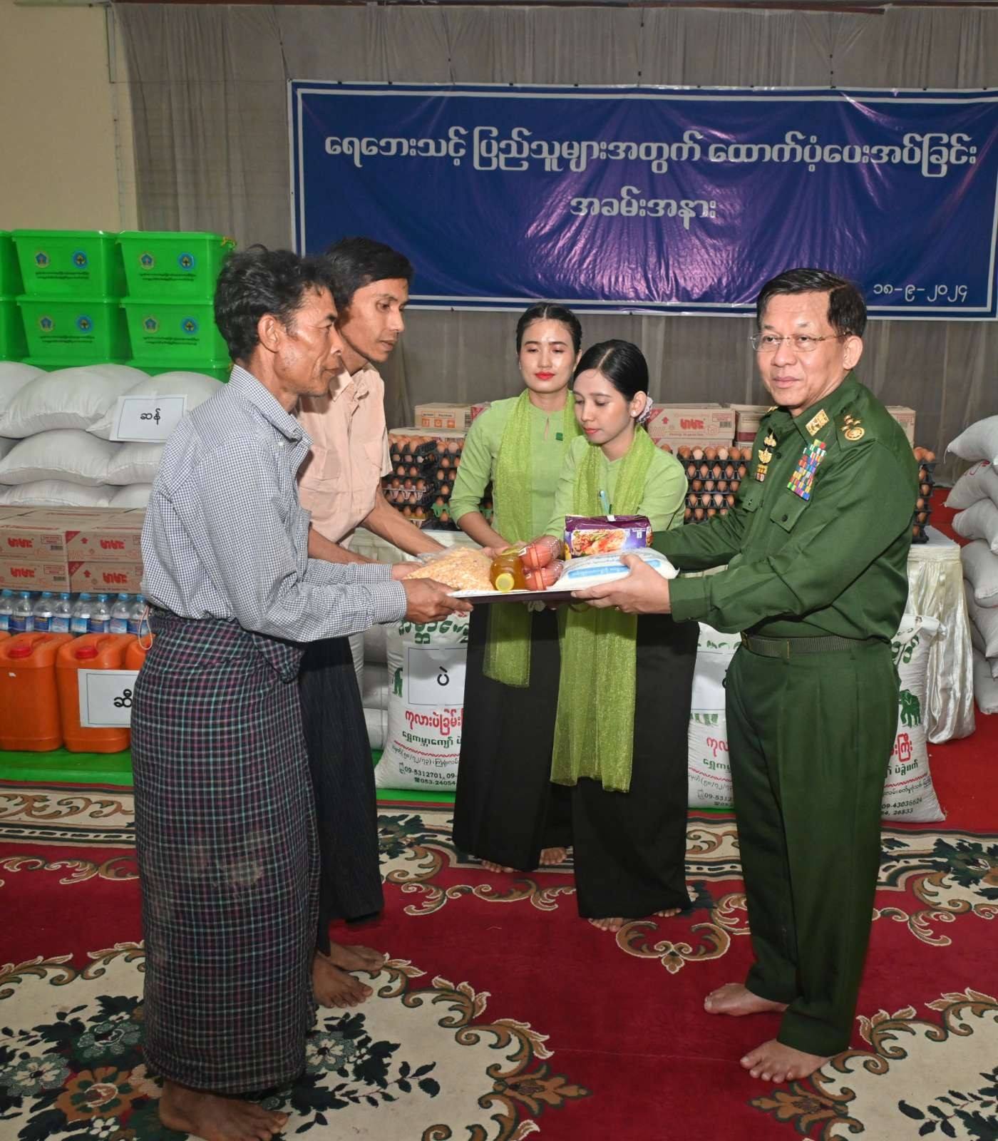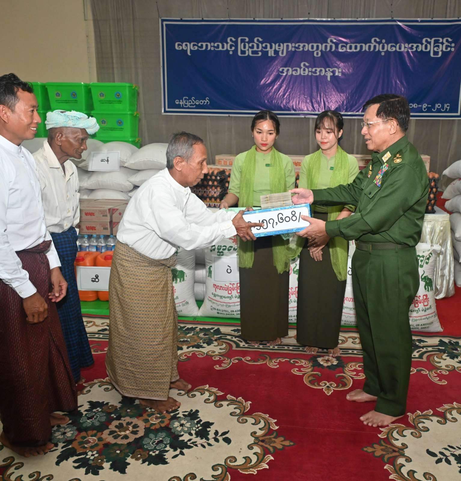 ထို့နောက် နိုင်ငံတော်စီမံအုပ်ချုပ်ရေးကောင်စီဥက္ကဋ္ဌ တပ်မတော်ကာကွယ်ရေးဦးစီးချုပ်က ရေဘေးသင့်ပြည်သူများအတွက် ထောက်ပံ့ငွေနှင့် စားသောက်ဖွယ်ရာပစ္စည်းများကို ပေးအပ်ရာ ရေဘေးသင့်ပြည်သူများကိုယ်စား ကိုယ်စားလှယ်များက လက်ခံရယူသည်။