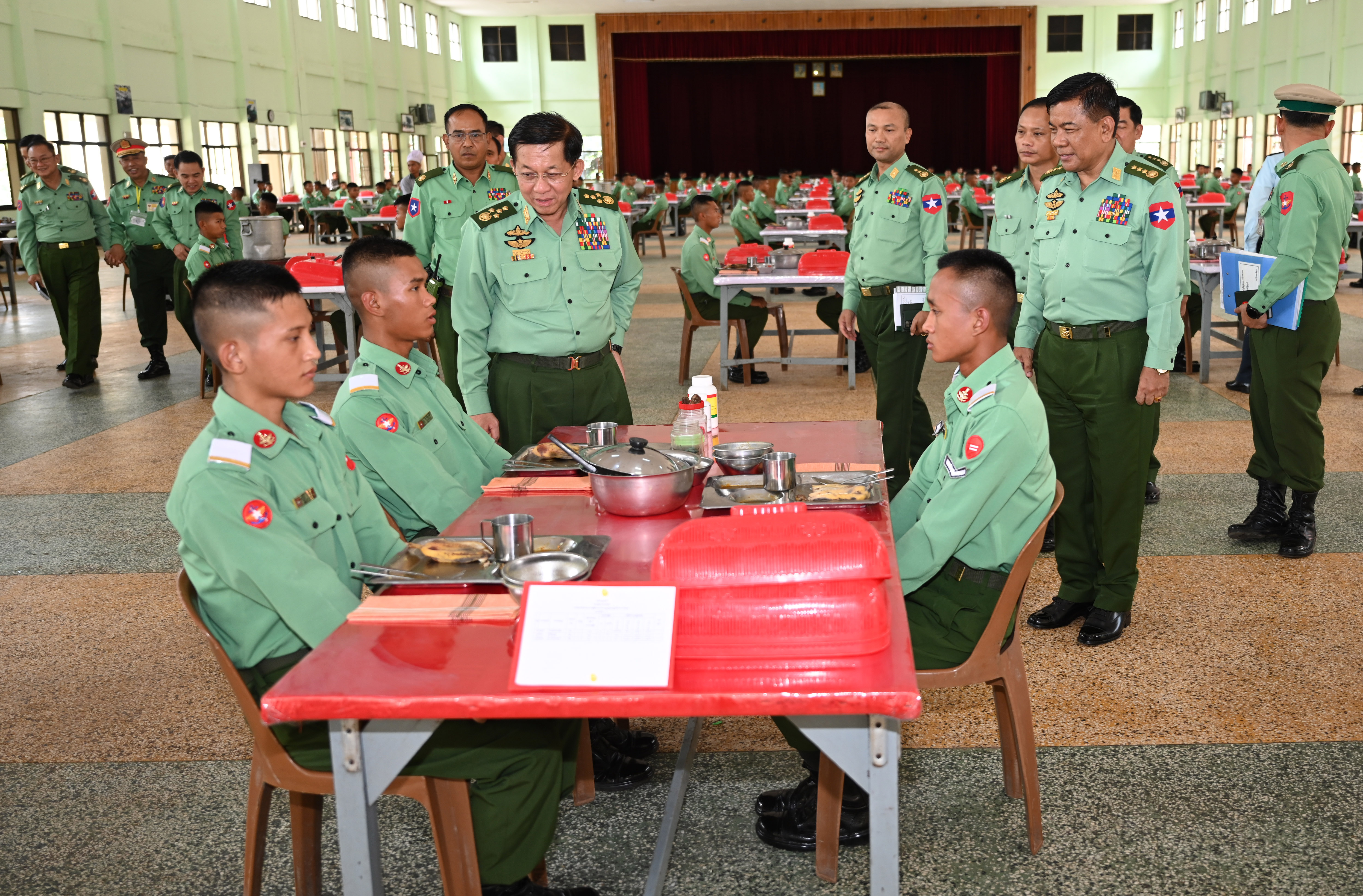 မွန်းလွဲပိုင်းတွင် နိုင်ငံတော်စီမံအုပ်ချုပ်ရေးကောင်စီဥက္ကဋ္ဌ တပ်မတော်ကာကွယ်ရေးဦးစီးချုပ်နှင့် အဖွဲ့ဝင်များသည် စစ်တက္ကသိုလ် အနော်ရထာတပ်ရင်း ဗိုလ်လောင်းစားရိပ်သာနှင့် တပ်မတော်နည်းပညာတက္ကသိုလ် ပညာတန်ဆောင် ဗိုလ်လောင်းစားရိပ်သာတို့၌ သင်တန်းသားဗိုလ်လောင်းများနှင့်အတူ နေ့လယ်စာ အတူတကွ သုံးဆောင်ကြပြီး ဗိုလ်လောင်းများအား ရင်းရင်းနှီးနှီး လိုက်လံနှုတ်ဆက်၍ လိုအပ်ချက်များအား မေးမြန်းဖြည့်ဆည်းပေးသည်။