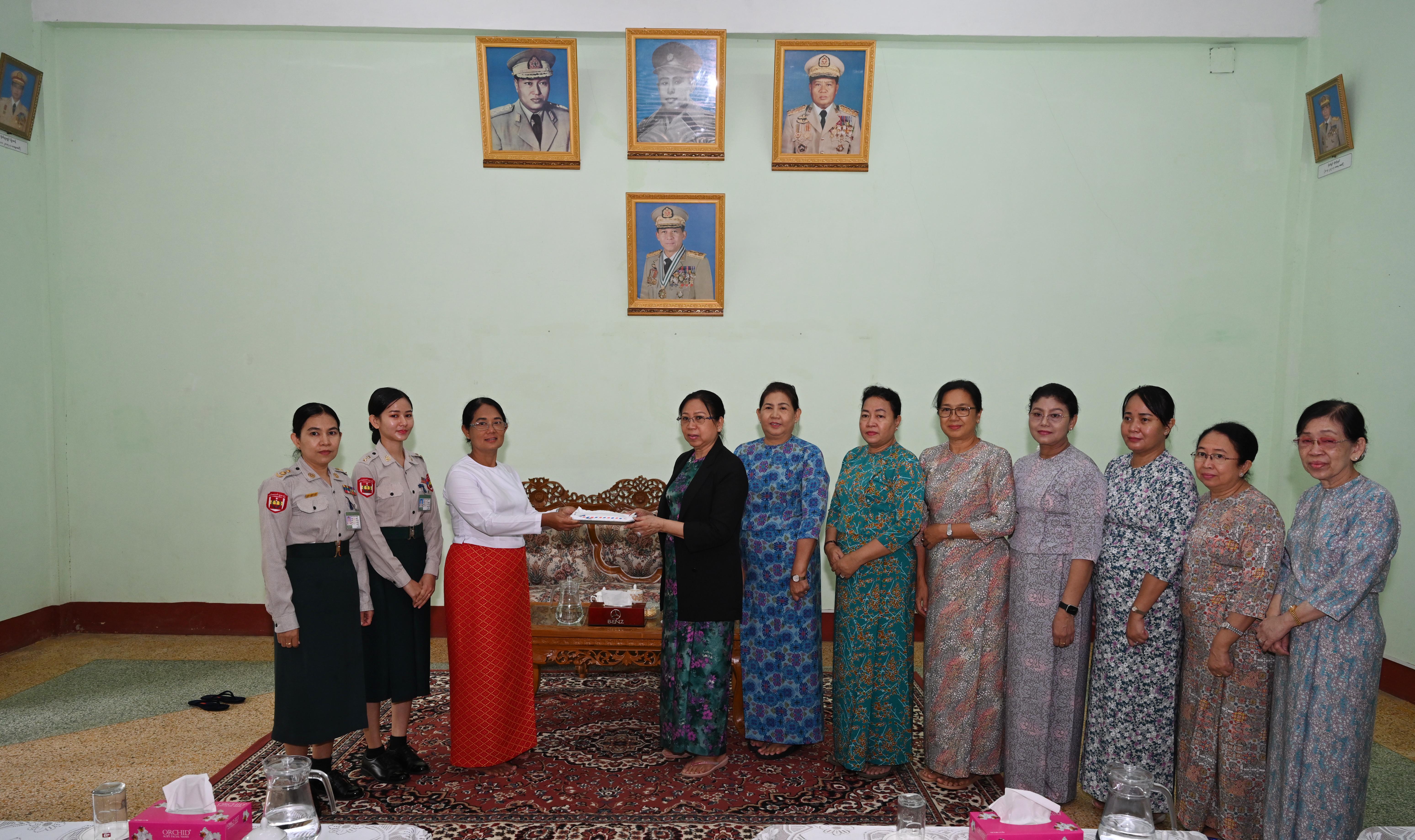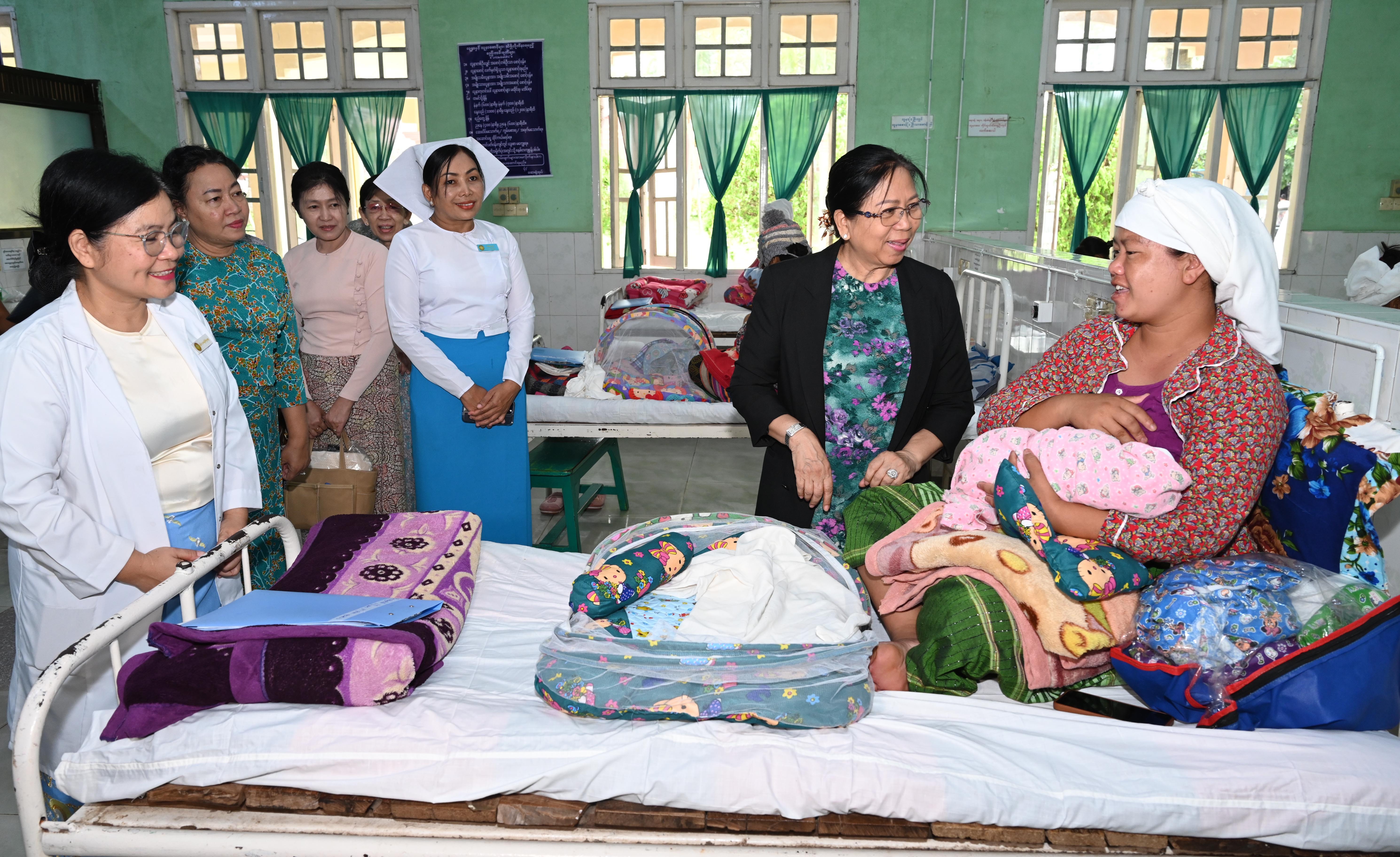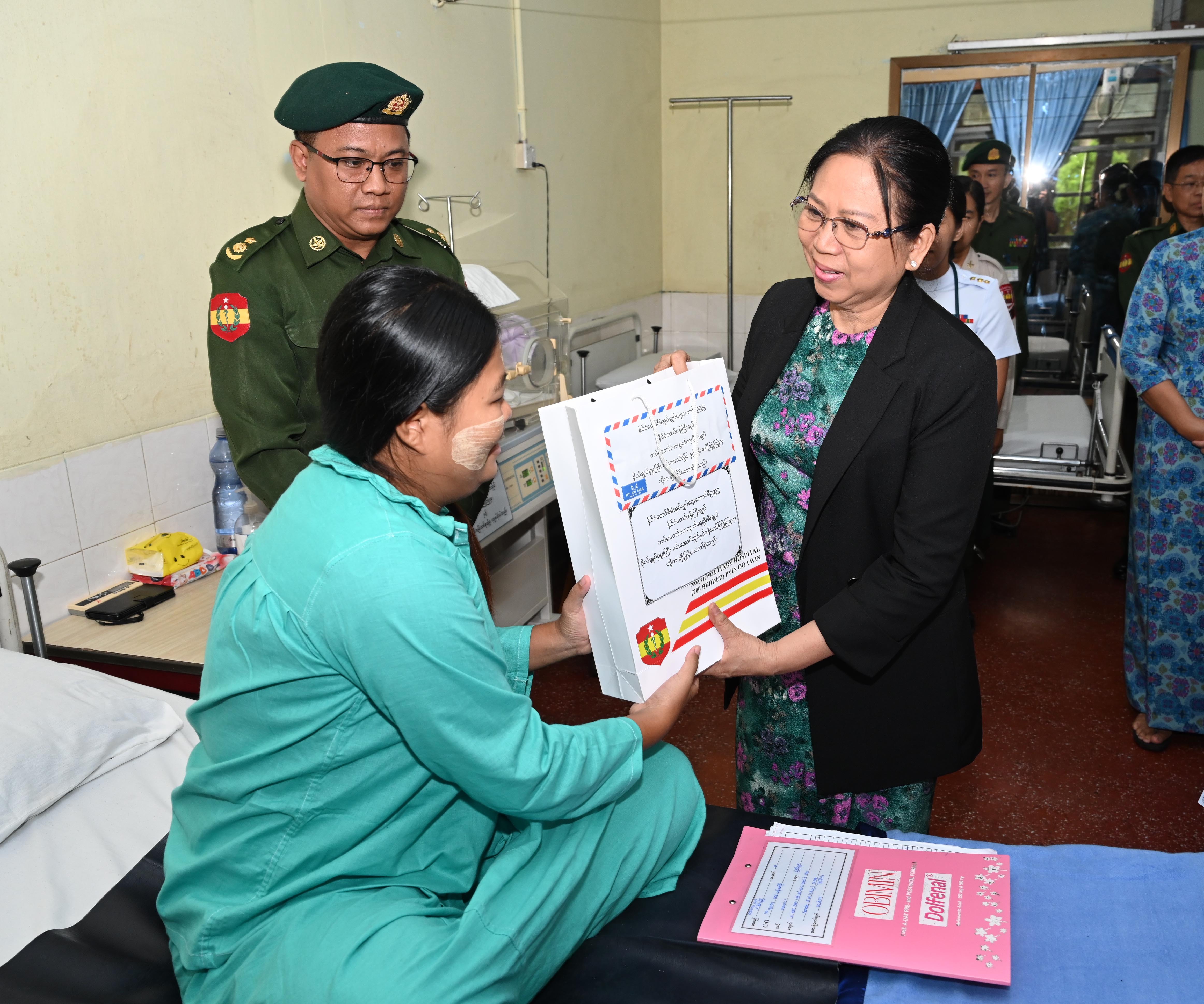 ဆက်လက်ပြီး နိုင်ငံတော်စီမံအုပ်ချုပ်ရေးကောင်စီဥက္ကဋ္ဌ တပ်မတော်ကာကွယ်ရေးဦးစီးချုပ်၏ ဇနီးနှင့် အဖွဲ့ဝင်များသည် ပြင်ဦးလွင်မြို့၊ နယ်မြေခံတပ်မတော်ဆေးရုံသို့ ရောက်ရှိပြီး သားဖွားမီးယပ်နှင့် ကလေးကုသဆောင်ရှိ ဆေးရုံတက်ရောက်ကုသမှုခံယူနေသူများအား ရင်းရင်းနှီးနှီး မေးမြန်းအားပေးစကား ပြောကြားကာ စားသောက်ဖွယ်ရာပစ္စည်းများ ပေးအပ်သည်။ ထို့နောက် နိုင်ငံတော်စီမံအုပ်ချုပ်ရေးကောင်စီဥက္ကဋ္ဌ တပ်မတော်ကာကွယ်ရေးဦးစီးချုပ်၏ ဇနီးက ဆေးရုံ၌ တက်ရောက်ဆေးကုသမှု ခံယူလျက်ရှိသည့် အရာရှိ၊ စစ်သည်၊ မိသားစုဝင်များအတွက် နေ့လယ်စာအာဟာရနှင့် ဆေးရုံအတွက် လှူဒါန်းငွေများကို ပေးအပ်ရာ ဆေးရုံအုပ်ကြီးက လက်ခံရယူခဲ့ကြောင်းနှင့် အာဟာရဌာနခွဲ၌ အရာရှိ၊ စစ်သည်များ၏ နေ့လယ်စာအာဟာရ သုံးဆောင်နေမှုအား လိုက်လံကြည့်ရှုအားပေးခဲ့ကြောင်း သတင်းရရှိသည်။