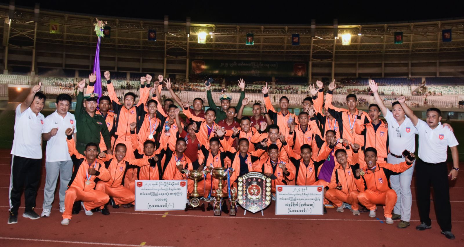 ဆက်လက်၍ နိုင်ငံတော်စီမံအုပ်ချုပ်ရေးကောင်စီဒုတိယဥက္ကဋ္ဌ ဒုတိယတပ်မတော်ကာကွယ်ရေးဦးစီးချုပ် ကာကွယ်ရေးဦးစီးချုပ် (ကြည်း) ဒုတိယဗိုလ်ချုပ်မှူးကြီး စိုးဝင်းက ၂၀၂၄ ခုနှစ်၊ တပ်မတော် (ကြည်း၊ ရေ၊ လေ) အားကစားပြိုင်ပွဲများတွင် ဆုတံဆိပ်ဒုတိယအများဆုံးရရှိသည့် ရန်ကုန်တိုင်းစစ်ဌာနချုပ် ကိုယ်စားပြုအသင်းအား တပ်မတော်ကာကွယ်ရေးဦးစီးချုပ်၏ တံခွန်စိုက်ဒိုင်း (ဒုတိယ) ဆုနှင့် ငွေသားဆုများကို ပေးအပ်ချီးမြှင့်သည်။