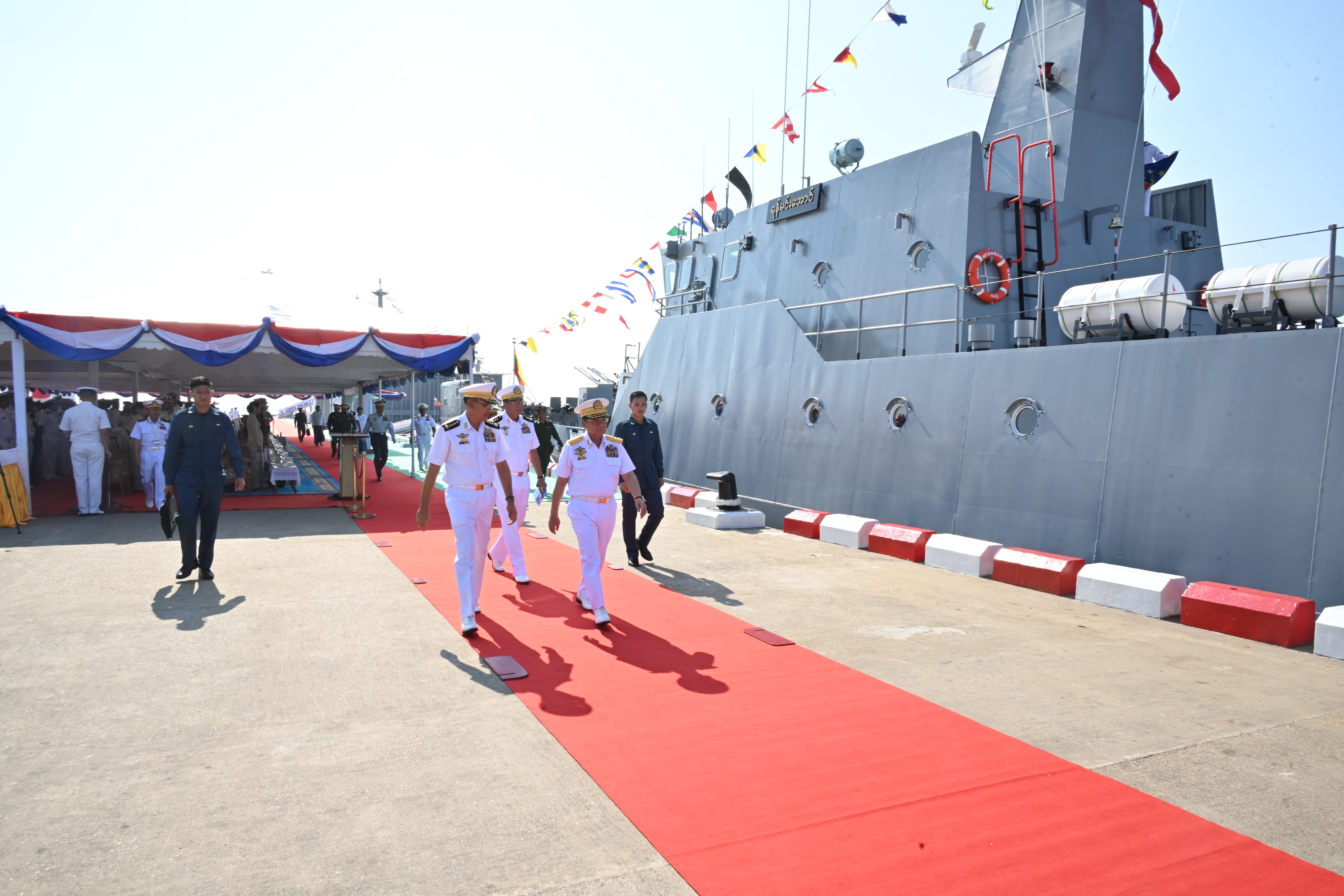 ပြည်ထောင်စုသမ္မတမြန်မာနိုင်ငံတော်၊ တပ်မတော် (ရေ) ၏ (၇၇) နှစ်မြောက် တပ်မတော် (ရေ) နှစ်ပတ်လည်နေ့တွင် နိုင်ငံတော်၏ရေကြောင်းဆိုင်ရာ အကျိုးစီးပွားများနှင့် မြန်မာ့ ပင်လယ်ပြင်သီးသန့်စီးပွားရေးဇုန်အား အပြည့်အဝကာကွယ်စောင့်ရှောက်နိုင်ရန်အတွက် စစ်ရေယာဉ်များ တပ်တော်ဝင်ခြင်းအခမ်းအနားကို ရန်ကုန်မြို့ရှိ အမှတ် (၃) ရေတပ်ဆိပ်ခံတံတား၌ ကျင်းပပြုလုပ်ရာ နိုင်ငံတော်စီမံအုပ်ချုပ်ရေးကောင်စီဥက္ကဋ္ဌ တပ်မတော်ကာကွယ်ရေးဦးစီးချုပ် ဗိုလ်ချုပ်မှူးကြီး မင်းအောင်လှိုင် တက်ရောက်ဂုဏ်ပြုချီးမြှင့်သည်။