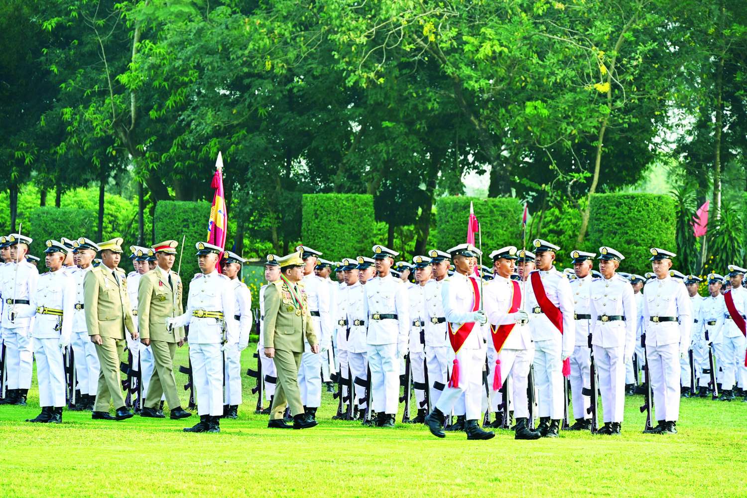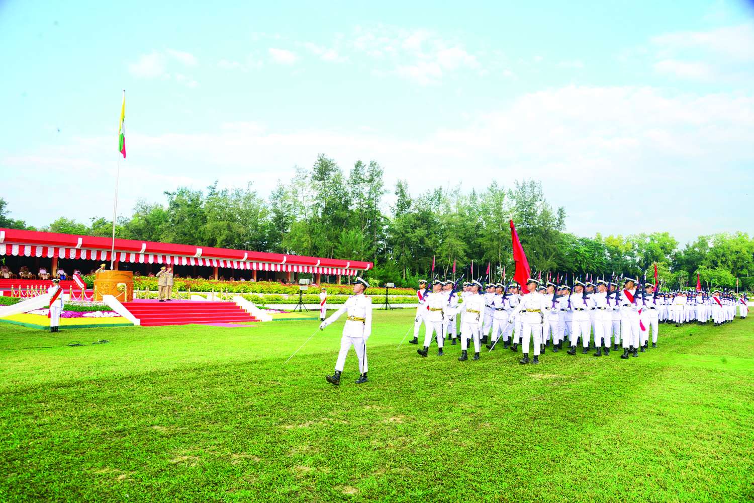 ယင်းနောက် နိုင်ငံတော်လုံခြုံရေးနှင့်အေးချမ်းသာယာရေးကော်မရှင်ဥက္ကဋ္ဌ တပ်မတော်ကာကွယ်ရေးဦးစီးချုပ် ဗိုလ်ချုပ်မှူးကြီး သတိုးမဟာသရေစည်သူ သတိုးသီရိသုဓမ္မ မင်းအောင်လှိုင်သည် ဗိုလ်လောင်းတပ်ခွဲများ၏ အလေးပြုခြင်းကိုခံယူပြီး စစ်ရေးပြအခမ်းအနားမှ ပြန်လည်ထွက်ခွာသည်။
