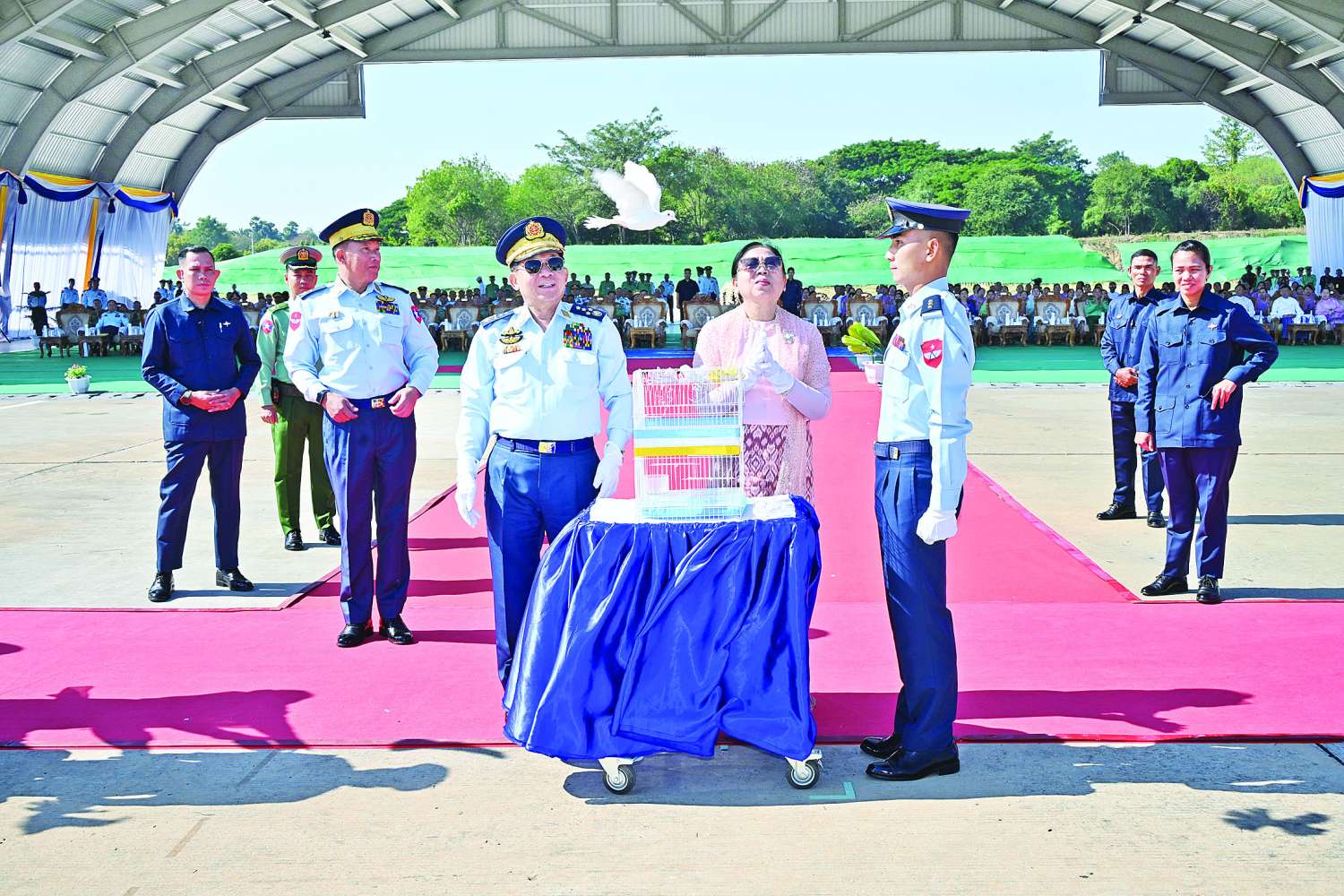 အဆိုပါအခမ်းအနားသို့ နိုင်ငံတော်လုံခြုံရေးနှင့်အေးချမ်းသာယာရေးကော်မရှင်ဥက္ကဋ္ဌ တပ်မတော်ကာကွယ်ရေးဦးစီးချုပ် ဗိုလ်ချုပ်မှူးကြီး မင်းအောင်လှိုင်နှင့်ဇနီး ဒေါ်ကြူကြူလှ၊ ကော်မရှင်အဖွဲ့ဝင် နိုင်ငံတော်ဝန်ကြီးချုပ် ဦးညိုစောနှင့်ဇနီး၊ ကော်မရှင်အတွင်းရေးမှူး ဗိုလ်ချုပ်ကြီး ရဲဝင်းဦးနှင့်ဇနီး၊ ကော်မရှင်အဖွဲ့ဝင် ညှိနှိုင်းကွပ်ကဲရေးမှူး(ကြည်း၊ ရေ၊ လေ) ဗိုလ်ချုပ်ကြီး ကျော်စွာလင်းနှင့်ဇနီး၊ အငြိမ်းစားကာကွယ်ရေးဦးစီးချုပ်(လေ)များနှင့်ဇနီးများ၊ ကာကွယ်ရေးဦးစီးချုပ်(ရေ) ဗိုလ်ချုပ်ကြီး ထိန်ဝင်းနှင့်ဇနီး၊ ကာကွယ်ရေးဦးစီးချုပ်(လေ) ဗိုလ်ချုပ်ကြီး ထွန်းအောင်နှင့်ဇနီး၊ ပြည်ထောင်စုအဆင့်ပုဂ္ဂိုလ်များနှင့်ဇနီးများ၊ ကာကွယ်ရေးဦးစီးချုပ်ရုံးမှ အဆင့်မြင့်တပ်မတော်အရာရှိကြီးများနှင့်ဇနီးများ၊ နေပြည်တော်တိုင်းစစ်ဌာနချုပ်တိုင်းမှူး၊ လေတပ်စခန်းဌာနချုပ်မှူးများ၊ တပ်မတော်(လေ)မှ အရာရှိ၊ စစ်သည်များနှင့် တာဝန်ရှိသူများ၊ ဖိတ်ကြားထားသည့်ဧည့်သည်တော်ကြီးများ တက်ရောက်ကြသည်။