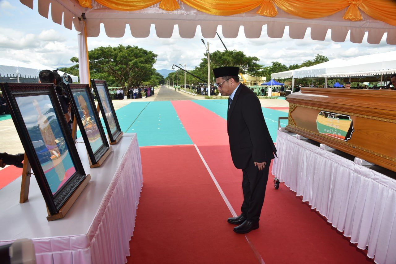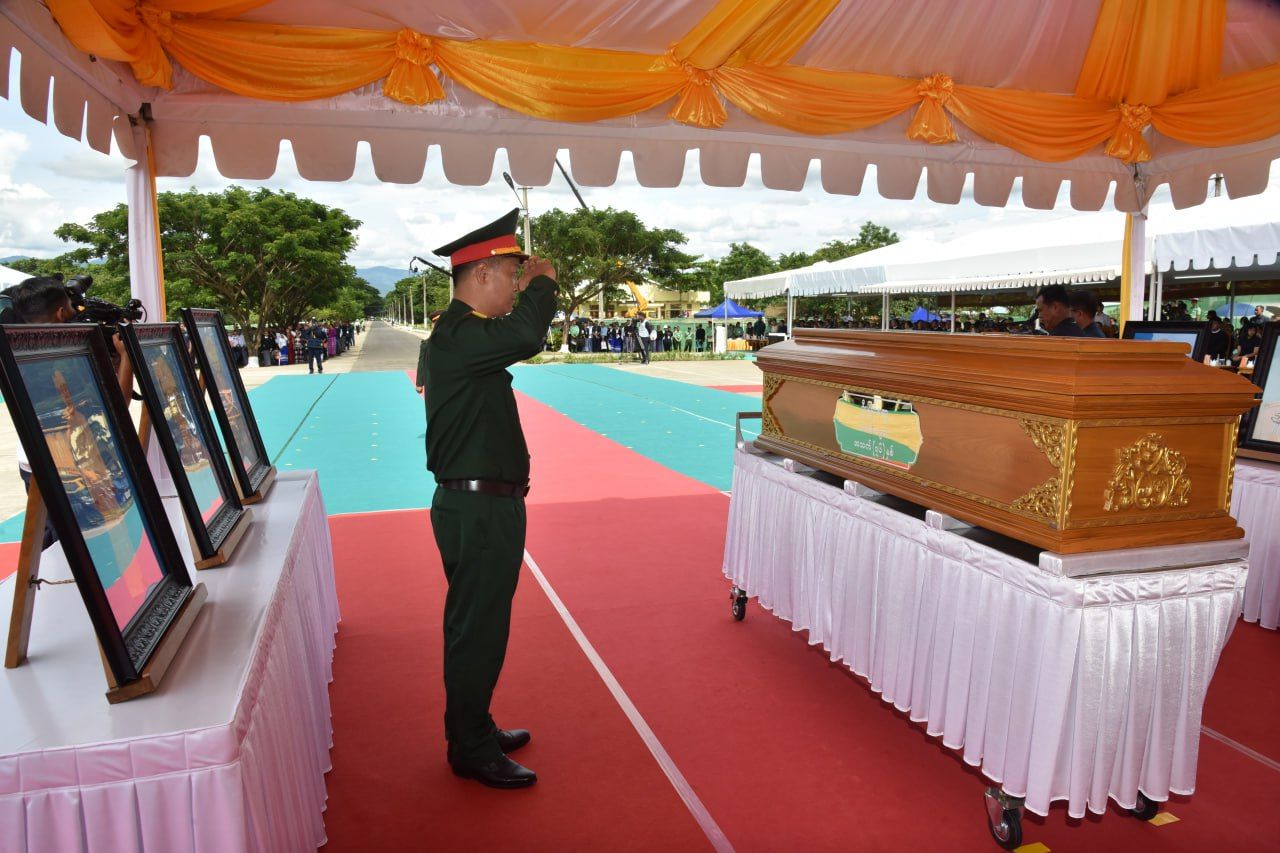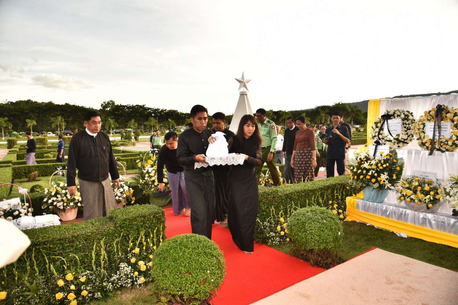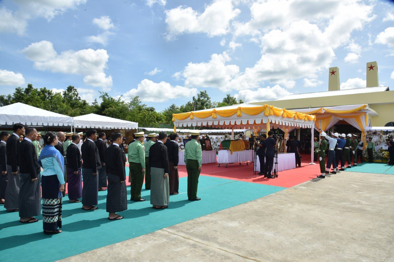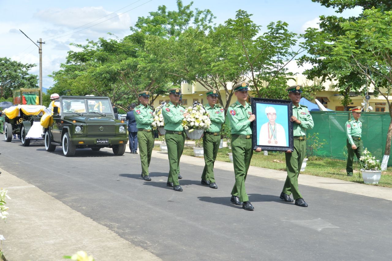 ယင်းနောက် နိုင်ငံတော်လုံခြုံရေးနှင့် အေးချမ်းသာယာရေးကော်မရှင်ဥက္ကဋ္ဌ၊ ကော်မရှင်ဒုတိယဥက္ကဋ္ဌနှင့် ပြည်ထောင်စုအဆင့်ပုဂ္ဂိုလ်များ၊ ကာကွယ်ရေးဦးစီးချုပ်ရုံးမှ အဆင့်မြင့်တပ်မတော်အရာရှိကြီးများက နေရာယူကြပြီး တပ်မတော်ဂုဏ်ပြု သေနတ်ပစ်အဖွဲ့က ဂုဏ်ပြုစစ်ရေးပြအစီအစဉ်အတိုင်းဆောင်ရွက်ကာ သေနတ်မြေစိုက် ဦးခိုက်အလေးပြုကြပြီး သေနတ်မြှောက်အလေးပြုကြသည်။