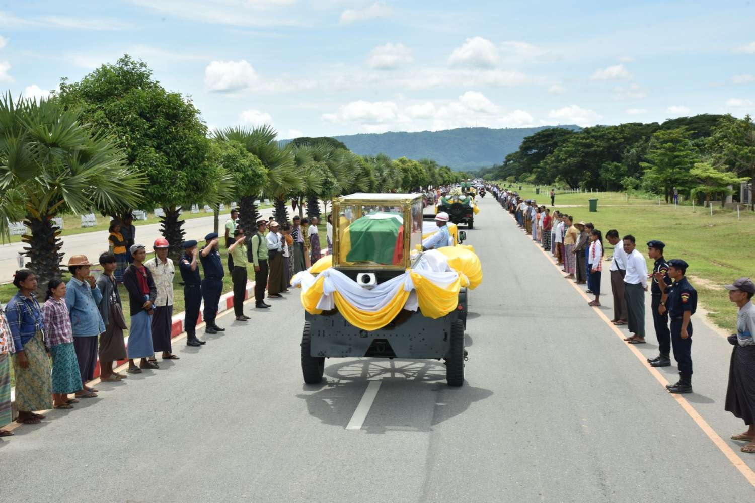 ယာယီသမ္မတဦးမြင့်ဆွေ၏ ရုပ်ကလာပ်ကိုတင်ဆောင်ထားသည့် အမြောက်တင်ယာဉ်နှင့် နိုင်ငံတော်ဈာပနယာဉ်တန်းသည် နေပြည်တော် တပ်မတော်ဆေးရုံကြီးရှိ ငြိမ်းအေးဇရပ်မှ ပုဗ္ဗသီရိမြို့ပတ်လမ်းအတိုင်း တပ်မတော်စစ်သင်္ချိုင်း (နေပြည်တော်) သို့ မောင်းနှင်လာရာ လမ်းတစ်လျှောက်၌ တပ်မတော်(ကြည်း၊ ရေ၊ လေ) မှ တပ်မတော်သားများနှင့် မိသားစုဝင်များ၊ ဌာနဆိုင်ရာဝန်ထမ်းများနှင့် ပြည်သူလူထုများက ဝမ်းနည်းခြင်းအထိမ်းအမှတ်ဖြင့် ဂါရဝပြုဦးညွှတ်နှုတ်ဆက်ကြသည်။