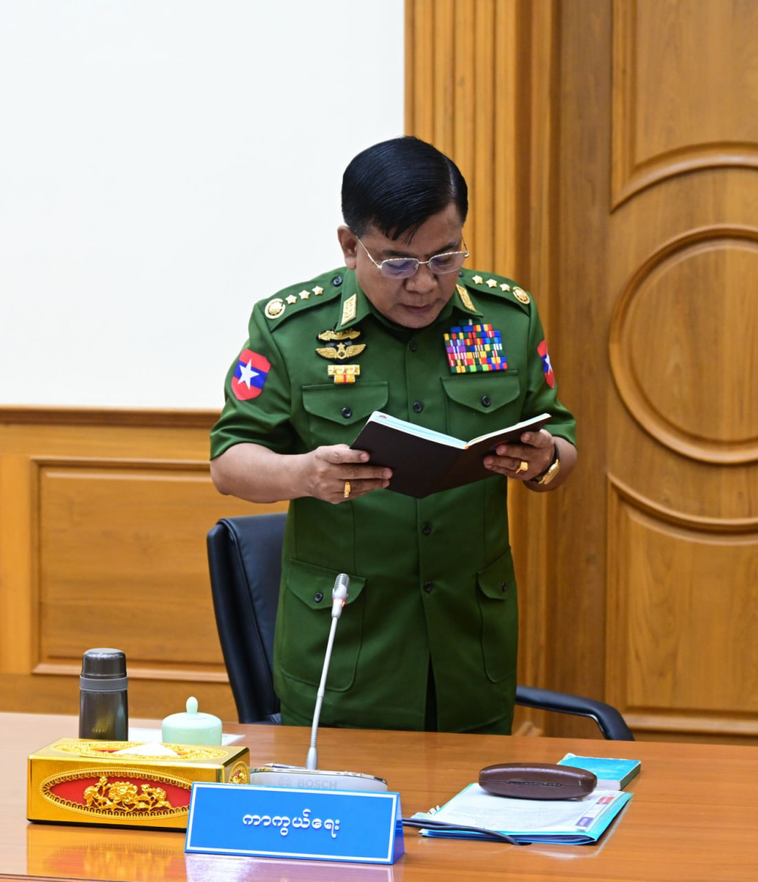 ရှေ့လုပ်ငန်းစဉ် ၅ ရပ်၏ ပထမဆုံးအချက်ဖြစ်သည့် လွတ်လပ်ပြီးတရားမျှတသော ပါတီစုံဒီမိုကရေစီအထွေထွေရွေးကောက်ပွဲ အောင်မြင်စွာကျင်းပနိုင်ရေး ပြည်ထောင်စုတစ်ဝန်းလုံးတည်ငြိမ်အေးချမ်း၍ တရားဥပဒေစိုးမိုးရေး အပြည့်အဝ ရရှိလာအောင် အလေးထားဆောင်ရွက်သွားမည် ဆိုသည့်အချက်နှင့် ပတ်သက်ပြီး အကောင်အထည် ဖော်ဆောင်ရွက်မှုကို ဦးစွာတင်ပြလိုကြောင်း၊ ၂၀၂၀ ပြည့်နှစ် ပါတီစုံဒီမိုကရေစီအထွေထွေရွေးကောက်ပွဲတွင် အဆိုပါအချိန်က အာဏာရပါတီသည် မဲမသမာမှုများကို ကျူးလွန်ခဲ့ကြကြောင်း၊ ဥပဒေနဲ့အညီ ဖြေရှင်းဆောင်ရွက်ပေးမှုမရှိဘဲ နိုင်ငံတော်အာဏာကို အတင်းအဓမ္မရယူရန် ကြိုးစားခဲ့သည့်အတွက် ဖွဲ့စည်းပုံအခြေခံဥပဒေနှင့်အညီ နိုင်ငံတော်ကို အရေးပေါ်အခြေအနေကြေညာခဲ့ရပြီး မိမိတို့အစိုးရက တာဝန်ယူထိန်းသိမ်းခဲ့ရခြင်းဖြစ်ကြောင်း၊ အဆိုပါအချိန်က အာဏာရပါတီကို ထောက်ခံသူများသည် အရေးပေါ်အခြေအနေအရ အပြောင်းအလဲဖြစ်မှုများကို မကျေနပ်မှုမှ အစပြုပြီး ဆူပူဆန္ဒပြမှုများကနေ အကြမ်းဖက်တိုက်ခိုက်မှုများ နည်းလမ်းပေါင်းစုံဖြင့် ပြုလုပ်ခဲ့ကြကြောင်း၊ အလားတူမိမိတို့နိုင်ငံတွင် ယခင်ကတည်းကရှိနေသည့် ပြည်တွင်းလက်နက်ကိုင်သောင်းကျန်းသူအဖွဲ့အစည်းများ သည်လည်း အဆိုပါ နိုင်ငံရေးဖြစ်စဉ်ကို အခွင့်ကောင်းယူပြီး အမြတ်ထုတ်နိုင်ရန် လက်နက်ကိုင်အကြမ်းဖက်မှုများ လုပ်ဆောင်ခဲ့ကြသည့်အတွက်ကြောင့် နိုင်ငံတော်တွင် ဗူးလေးရာဖရုံဆင့် ဖြစ်ခဲ့ရကြောင်း။