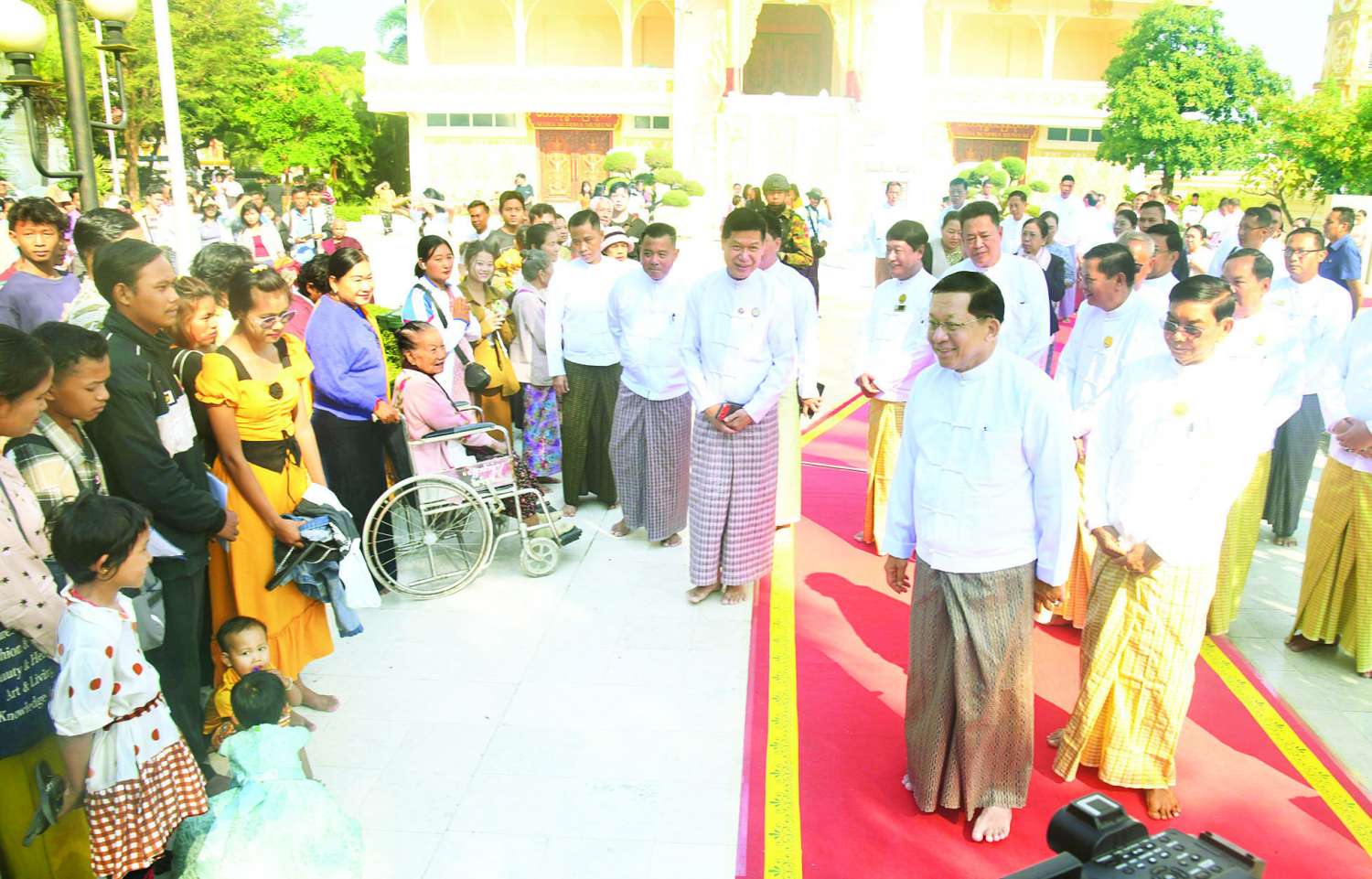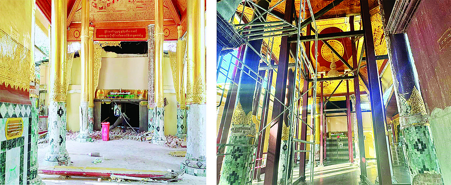 ပြည်ထောင်စုသမ္မတမြန်မာနိုင်ငံတော်ယာယီသမ္မတ နိုင်ငံတော်လုံခြုံရေးနှင့်အေးချမ်းသာယာရေးကော်မရှင်ဥက္ကဋ္ဌ ဗိုလ်ချုပ်မှူးကြီး မင်းအောင်လှိုင်သည် ဇနီး ဒေါ်ကြူကြူလှ၊ ကော်မရှင်အတွင်းရေးမှူး တွဲဖက်အမှုဆောင်ချုပ် ဗိုလ်ချုပ်ကြီး ရဲဝင်းဦးနှင့် ဇနီး၊ ခရီးစဉ်တွင်လိုက်ပါလာသည့် အဖွဲ့ဝင်များ၊ မန္တလေးတိုင်းဒေသကြီးဝန်ကြီးချုပ်၊ ကာကွယ်ရေးဦးစီးချုပ်ရုံးမှ အဆင့်မြင့်တပ်မတော်အရာရှိကြီးများ၊ အလယ်ပိုင်းတိုင်းစစ်ဌာနချုပ်တိုင်းမှူးနှင့် အဖွဲ့ဝင်များလိုက်ပါ၍ ယနေ့နံနက်ပိုင်းတွင် မန္တလေးမြို့ မဟာမြတ်မုနိဘုရားကြီးသို့ သွားရောက်ဖူးမြော်ကြည်ညိုပြီး ငလျင်ဒဏ်ကြောင့် ထိခိုက်ပျက်စီးခဲ့ရသည့် သာသနိကအဆောက်အဦများအား ရှေးမူမပျက် ပြန်လည်တည်ဆောက်ပြုပြင်မွမ်းမံနေမှု အခြေအနေများကို ကြည့်ရှုစစ်ဆေးသည်။