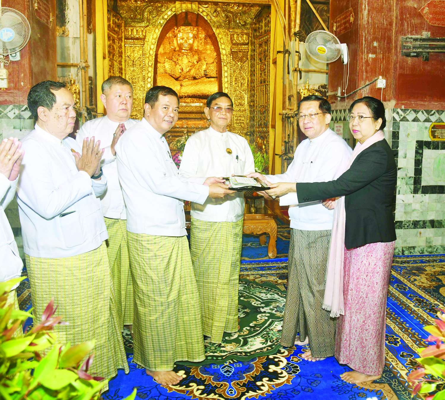 ဆက်လက်၍ နိုင်ငံတော်ယာယီသမ္မတ နိုင်ငံတော်လုံခြုံရေးနှင့်အေးချမ်းသာယာရေးကော်မရှင်ဥက္ကဋ္ဌနှင့်ဇနီးတို့က ဘုရားကြီး ဘက်စုံပြုပြင်မွမ်းမံရန်အတွက် စုပေါင်းအလှူတော်ငွေများကို ပေးအပ်လှူဒါန်းရာ ဂေါပကအဖွဲ့မှ တာဝန်ရှိသူများက လက်ခံရယူကြသည်။