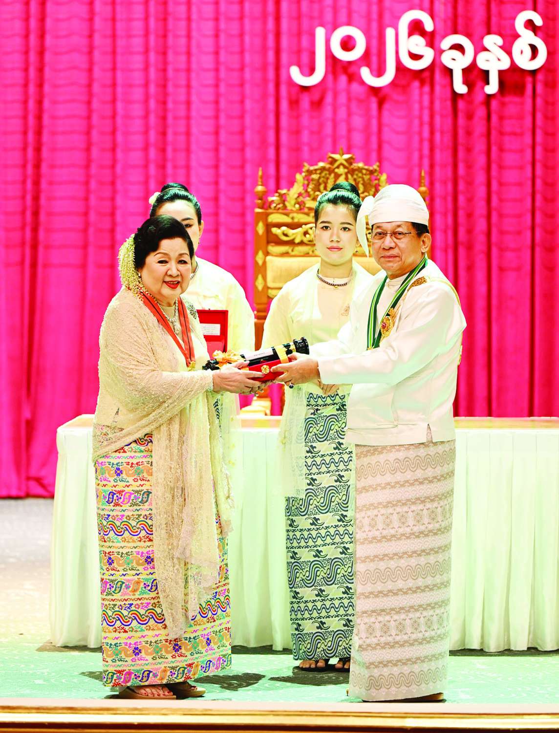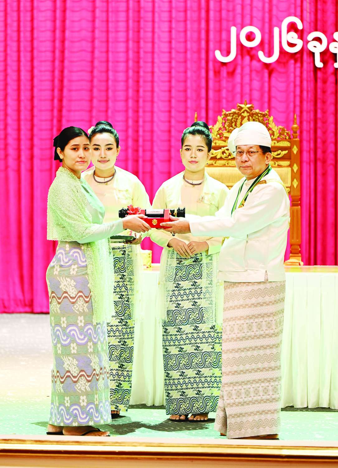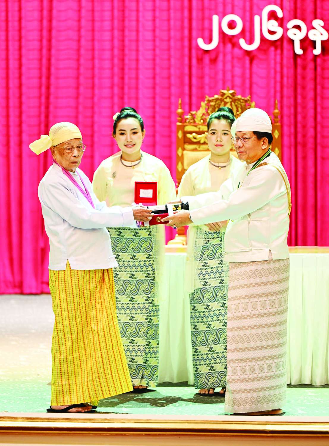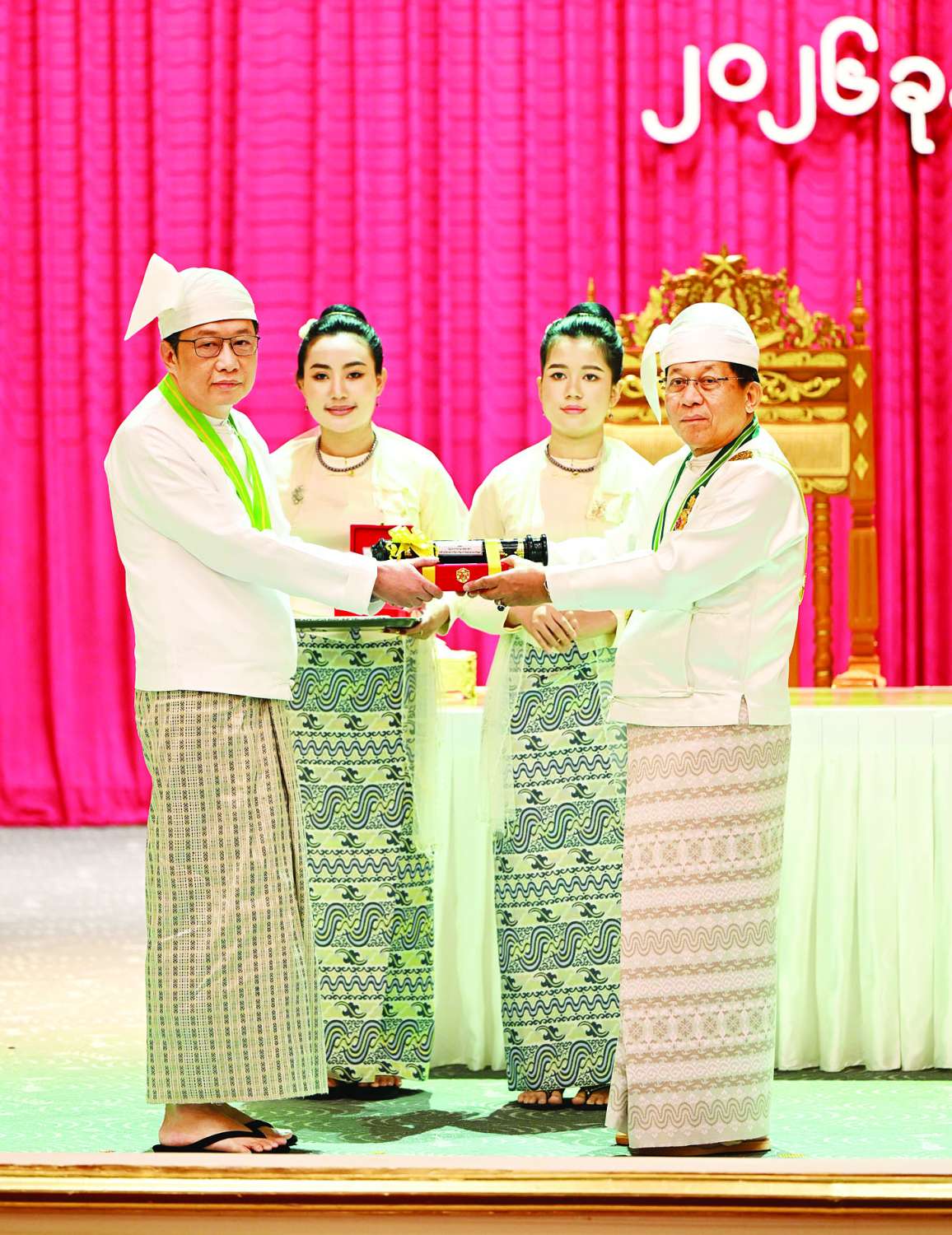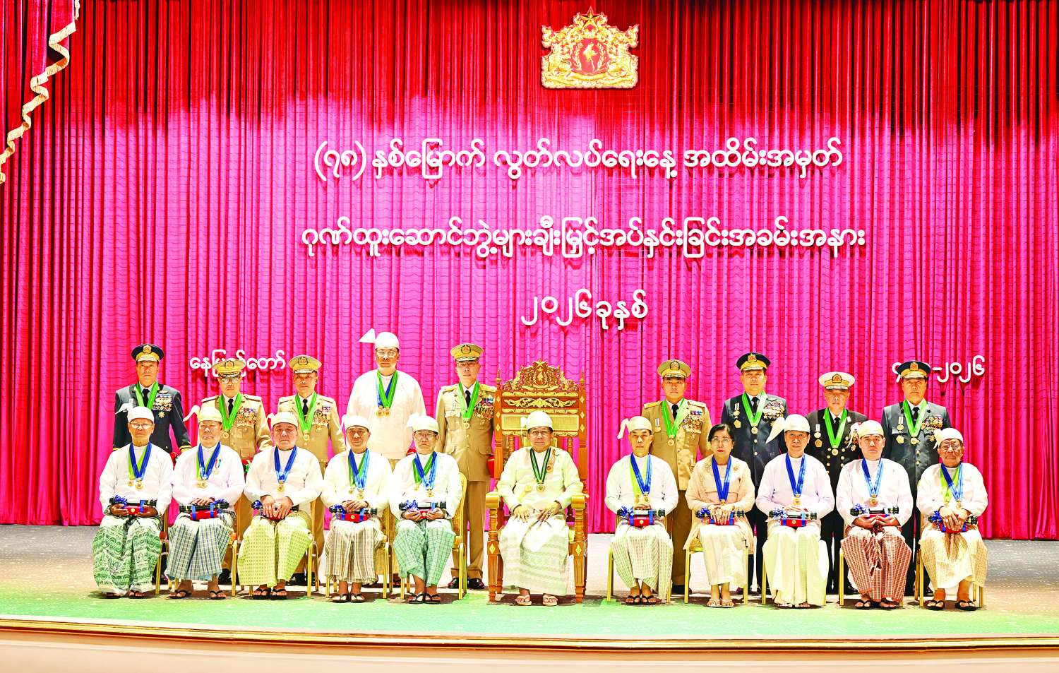 ပြည်ထောင်စုသမ္မတမြန်မာနိုင်ငံတော်ယာယီသမ္မတ နိုင်ငံတော်လုံခြုံရေးနှင့်အေးချမ်းသာယာရေးကော်မရှင်ဥက္ကဋ္ဌ ဗိုလ်ချုပ်မှူးကြီး သတိုးမဟာသရေစည်သူ သတိုးသီရိသုဓမ္မ မင်းအောင်လှိုင် (၇၈) နှစ်မြောက် လွတ်လပ်ရေးနေ့အထိမ်းအမှတ် ဂုဏ်ထူးဆောင်ဘွဲ့များ ချီးမြှင့်အပ်နှင်းခြင်းအခမ်းအနားသို့ တက်ရောက်ချီးမြှင့်