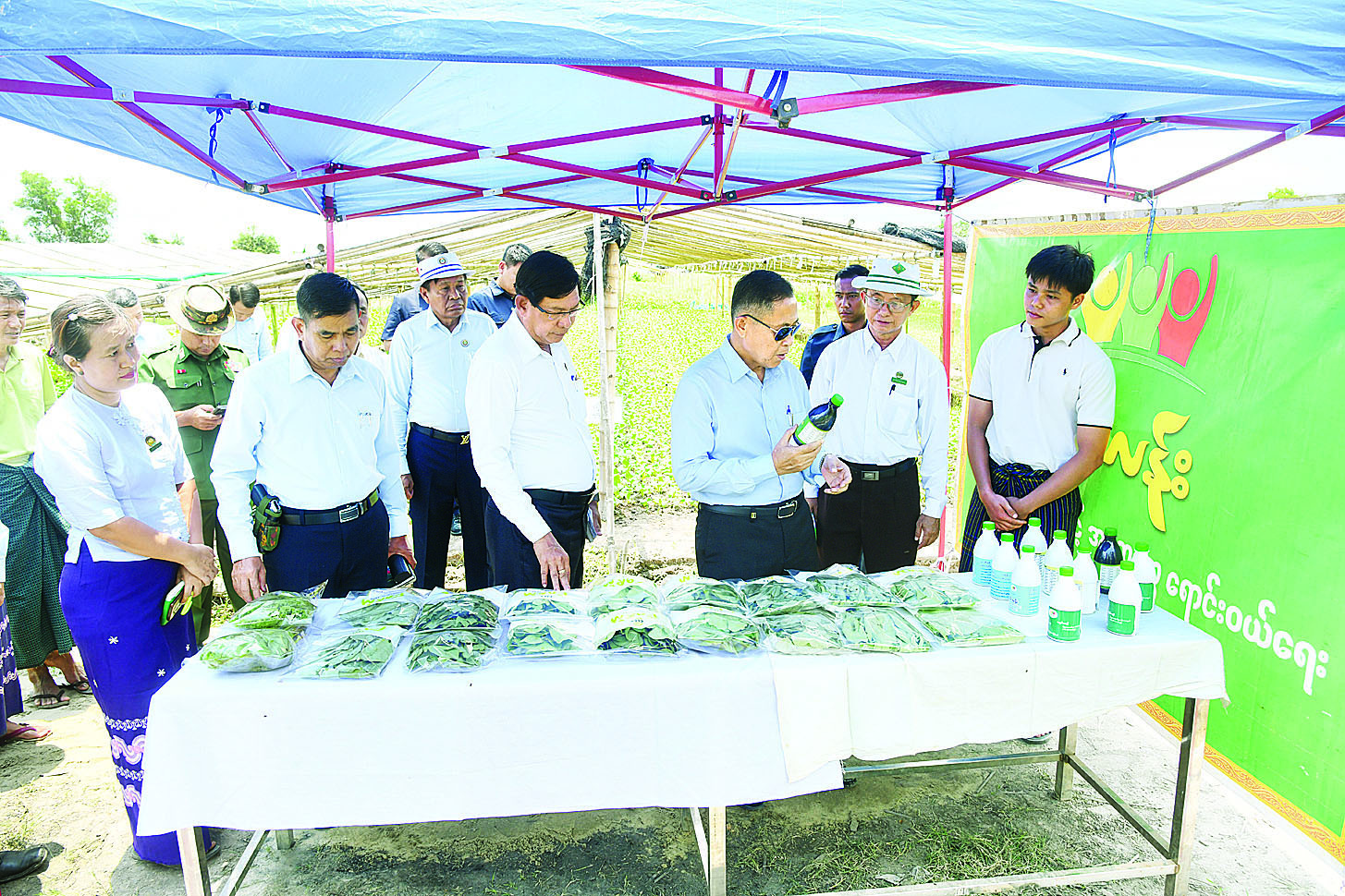 ဦးစွာ နိုင်ငံတော်စီမံအုပ်ချုပ်ရေးကောင်စီဒုတိယဥက္ကဋ္ဌ ဒုတိယဝန်ကြီးချုပ်နှင့်အဖွဲ့ဝင်များသည် ညောင်နှစ်ပင်စိုက်ပျိုးမွေးမြူရေးအထူးဇုန်ရှိ စိမ်းလန်းစိုက်ပျိုးထုတ်လုပ်ရေးနှင့် အထွေထွေရောင်းဝယ်ရေး သမဝါယမအသင်းလီမိတက်အသင်းနှင့် “ထွန်း” ဓာတုကင်းလွတ်သမဝါယမအသင်း စိုက်ပျိုးရေးခြံများသို့ ရောက်ရှိပြီး မုန်ညင်း စိမ်း/ ဖြူ၊ ယုဆိုင်၊ ထိုင်ဝမ်မုန်ညင်း၊ ဆလပ်၊ ချဉ်ပေါင်၊ မုန်လာ၊ ဖက်ဖယ်၊ ကင်ပွန်းချဉ်၊ ဆူးပုပ်၊ နံနံပင်နှင့် အခြားရာသီပေါ်သီးနှံများ စိုက်ပျိုးထားရှိမှု၊ ခြံထွက်ဟင်းသီးဟင်းရွက်များ၊ ဈေးကွက်တင်ပို့မှုနှင့် အပင်စွန့်ပစ်ပစ္စည်းနှင့် အီးအမ်ဘိုကာရှီ ရောစပ်ထားသည့် ရွက်ဖျန်းအားတိုးဆေး၊ ကာကွယ်ဆေးများ အသုံးပြုမှုတို့ကို လိုက်လံကြည့်ရှုပြီး သိရှိလိုသည်များကို မေးမြန်းဆွေးနွေးသည်။