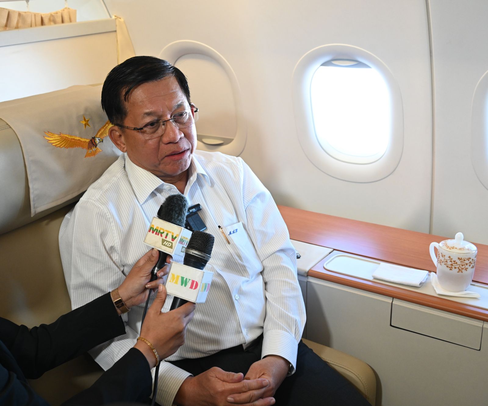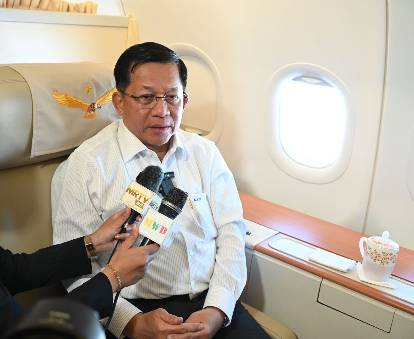 ထိုသို့အထူးလေယာဉ်ဖြင့် ပြန်လည်ထွက်ခွာလာစဉ် အထူးလေယာဉ်ပေါ်၌ နိုင်ငံတော်စီမံအုပ်ချုပ်ရေးကောင်စီဥက္ကဋ္ဌ နိုင်ငံတော်ဝန်ကြီးချုပ်သည် မီဒီယာများ၏သိရှိလိုသည့်မေးမြန်းမှုများကို လက်ခံဖြေကြားခဲ့ပြီး မေးမြန်းဖြေကြားမှု အပြည့်အစုံကို ဖော်ပြလိုက်ရပါသည်။
