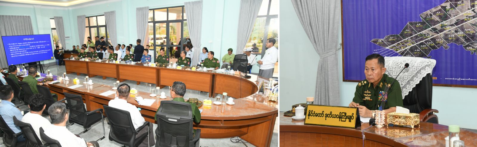 ဆက်လက်၍ နိုင်ငံတော်စီမံအုပ်ချုပ်ရေးကောင်စီ ဒုတိယဥက္ကဋ္ဌ ဒုတိယဝန်ကြီးချုပ်နှင့် အဖွဲ့ဝင်များသည် ရန်ကုန်တိုင်းစစ်ဌာနချုပ် အမှတ် (၄) စိုက်ပျိုး/မွေးမြူရေးစခန်းသို့ ရောက်ရှိ ကြရာ ရှင်းလင်းဆောင်၌ တိုင်းမှူးက တိုင်းစစ်ဌာနချုပ်ရှိ ဘက်စုံစိုက်ပျိုး/ မွေးမြူရေးစခန်းများဆိုင်ရာ အချက်အလက်များ၊ အကြီးအကဲ၏ လမ်းညွှန်ချက်များအပေါ် လိုက်နာအကောင်အထည် ဖော်ဆောင်ရွက်ပြီးစီးသည့် အခြေအနေများ၊ ရန်ကုန်တိုင်းစစ်ဌာနချုပ် စိုက်ပျိုးမွေးမြူ ရေးစခန်းများနှင့်ခြံများတွင် စိုက်ပျိုးမွေးမြူရေးလုပ်ငန်းများ ဆောင်ရွက်ထားရှိမှု၊ ထွက်ရှိလာသည့် အသား၊ ငါး၊ ဟင်းသီးဟင်းရွက်၊ ကြက်ဥနှင့် နွားနို့များကို အရာရှိ၊ စစ်သည် မိသားစုများနှင့် စစ်မှုထမ်းဟောင်းအဖွဲ့ဝင်များ၊ ရဲတပ်ဖွဲ့ဝင်များ၊ မိသားစုဝင်များနှင့် ဒေသခံပြည်သူများအား သက်သာသောဈေးနှုန်းများဖြင့် ရောင်းချပေးလျက်ရှိသည့် အခြေအနေများကို ရှင်းလင်းတင်ပြရာ ဒုတိယဝန်ကြီးချုပ်က ဘက်စုံစိုက်ပျိုး/ မွေးမြူရေးစခန်းများမှထွက်ရှိသည့် စားသောက် ကုန်ပစ္စည်းများသည် လတ်ဆတ်ပြီး အာဟာရပြည့်ဝမှုရှိရန်လိုကြောင်း၊ ဘက်စုံစိုက်ပျိုးမွေးမြူရေး လုပ်ငန်းများဆောင်ရွက်ခြင်းသည် တပ်မတော်သားများအပြင် နိုင်ငံ့ဝန်ထမ်းများအား ပြင်ပပေါက်ဈေးထက် သက်သာစွာရောင်းချပေးနိုင်ရန် ရည်ရွယ်ဆောင်ရွက်ခြင်းဖြစ်ကြောင်း၊ အမြတ်ကို အဓိကမထားဘဲ သက်သာချောင်ချိရေးကို ဦးစားပေးဆောင်ရွက်ကြရန်လိုကြောင်း၊ မွေးမြူထားသည့် တိရစ္ဆာန်များကိုလည်း တိရစ္ဆာန်အစာများ စနစ်တကျကျွေးမွေးရန်နှင့် ကူးစက်ရောဂါဖြစ်ပွားမှုမရှိစေရေး ကြိုတင်ကာကွယ်ဆောင်ရွက်သွားကြရန်လိုကြောင်း၊ မွေးမြူရေးဆောင်ရွက်ရာတွင် ကုသရေးပိုင်းနှင့် မွေးမြူရေးပညာရှင်များနှင့် တိုင်ပင်ဆွေးနွေး၍ ကျန်းမာရေးနှင့်ညီညွတ်သည့် ထုတ်ကုန်များရရှိအောင် ဆောင်ရွက်ကြရန်နှင့် တိုင်းစစ်ဌာနချုပ် အတွင်းရှိ တပ်မတော်သားများ၊ မိသားစုများအားလုံး စားရေရိက္ခာလုံလောက်မှု ဖူလုံသည်အထိ၊ ၎င်းမှတစ်ဆင့် ပိုလျှံသည်အထိ ပိုမိုတိုးမြှင့်ထုတ်လုပ်နိုင်ရေး ကာလအလိုက်၊ အပိုင်းအလိုက် စီမံချက်များ စနစ်တကျ ရေးဆွဲဆောင်ရွက်သွားရန်လိုကြောင်းနှင့် အခြားလိုအပ်သည်များကို လမ်းညွှန်မှာကြားသည်။