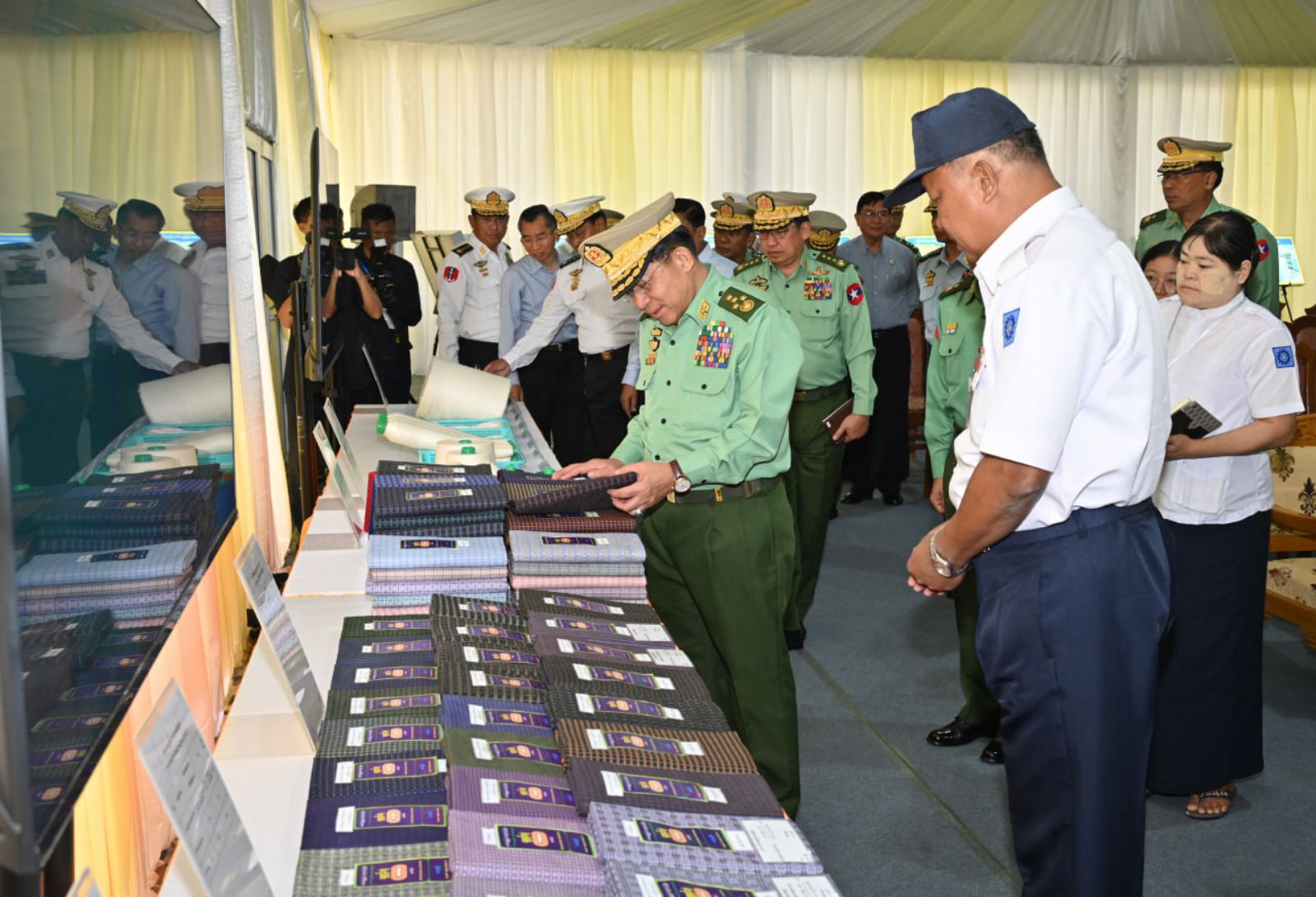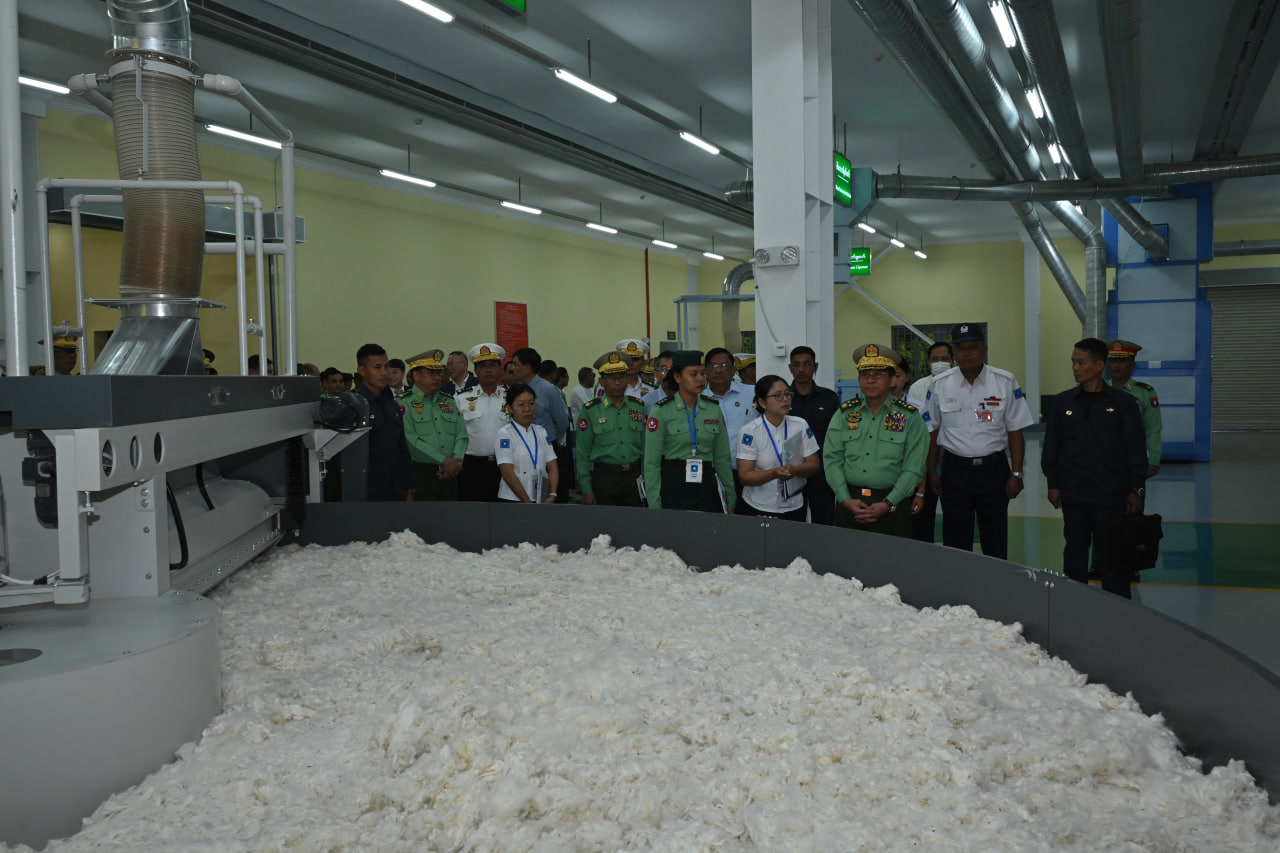 ၎င်းနောက် နိုင်ငံတော်စီမံအုပ်ချုပ်ရေးကောင်စီဥက္ကဋ္ဌ တပ်မတော်ကာကွယ်ရေးဦးစီးချုပ်နှင့် အဖွဲ့ဝင်များသည် ဝါစိုက်ပျိုးထုတ်လုပ်မှုနှင့် ချည်မျှင်ထုတ်လုပ်မှု အဆင့်ဆင့် ပြကွက်များနှင့် တပ်မတော်ချည်မျှင်နှင့်အထည်စက်ရုံ (မိတ္ထီလာ)၊ ၂/၈၀ ချည်ချော စက်ရုံခွဲမှ ထုတ်လုပ်ထားသည့် ချည်ထည်ပစ္စည်းများကို လှည့်လည်ကြည့်ရှုကြသည်။