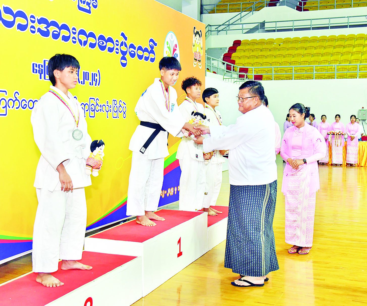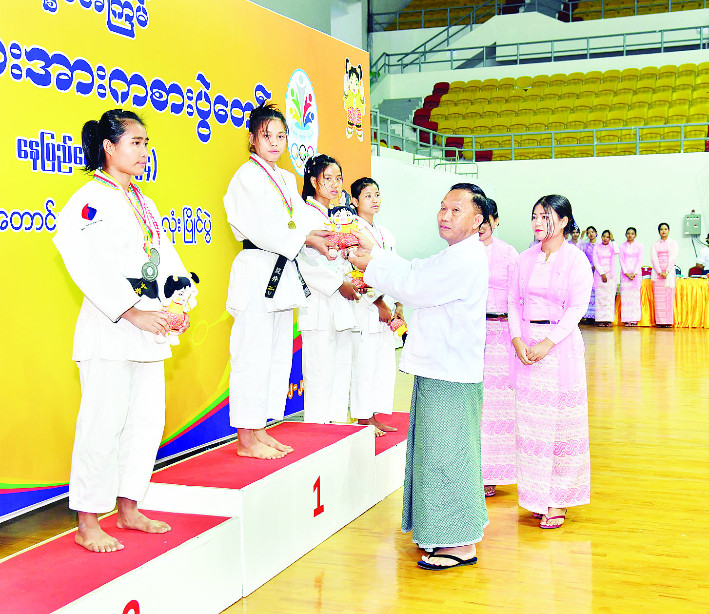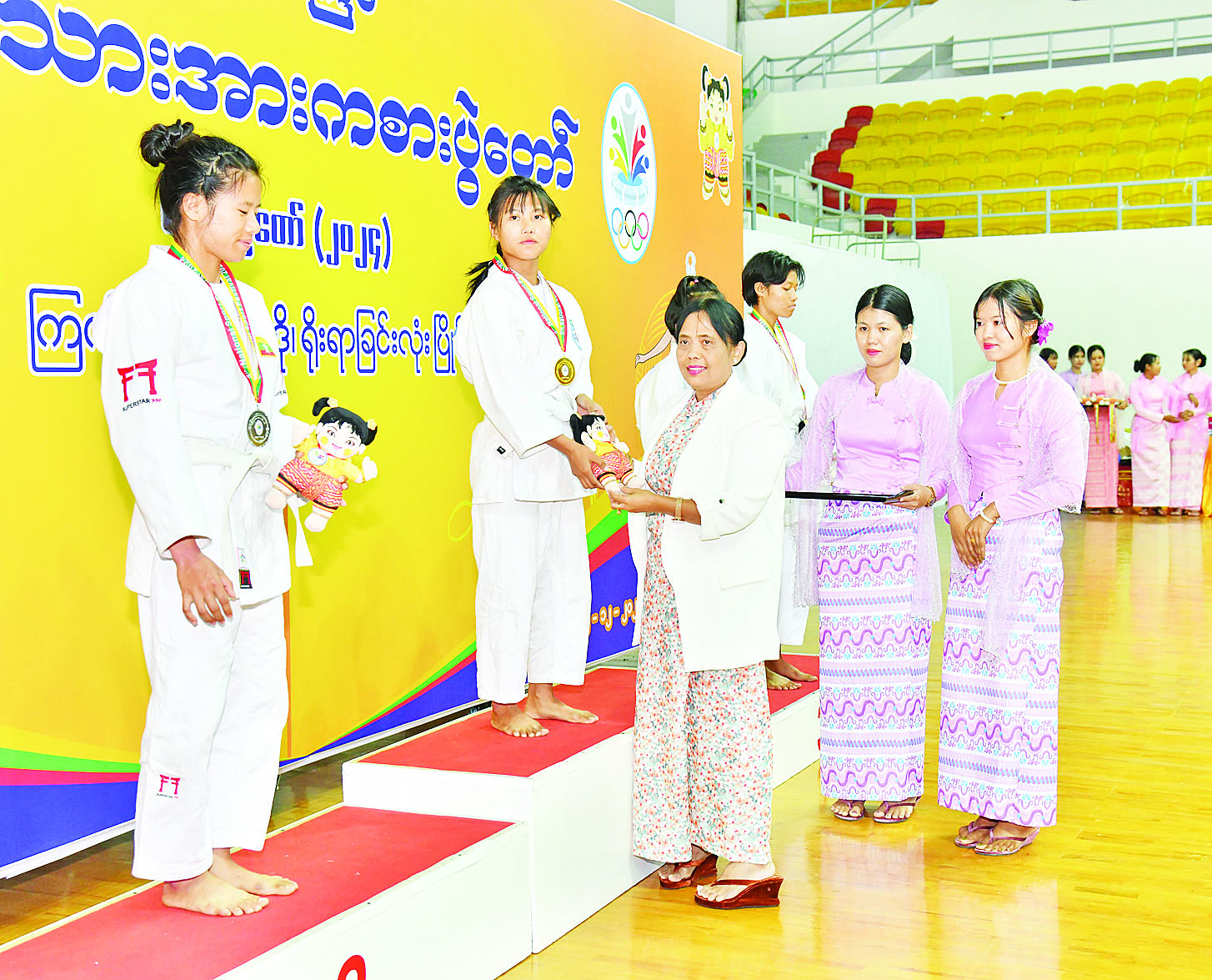 ထို့နောက် နိုင်ငံတော်စီမံအုပ်ချုပ်ရေးကောင်စီအဖွဲ့ဝင် ဦးရန်ကျော်က အမျိုးသမီး (-၄၈ ကီလိုတန်း) ဂျူဒိုအတိုက်ပြိုင်ပွဲတွင် ပထမဆုရရှိသည့် ကချင်ပြည်နယ်၊ ဒုတိယဆုရရှိသည့် ဧရာဝတီတိုင်းဒေသကြီးနှင့် ပူးတွဲတတိယဆုရရှိသည့် မန္တလေးတိုင်းဒေသကြီးနှင့် ရန်ကုန်တိုင်းဒေသကြီးအသင်းတို့မှ ပြိုင်ပွဲဝင်များကိုလည်းကောင်း၊ နိုင်ငံတော်စီမံအုပ်ချုပ်ရေးကောင်စီအဖွဲ့ဝင် ဦးရွှေကြိမ်းက အမျိုးသမီး (-၅၂ ကီလိုတန်း) ဂျူဒိုအတိုက်ပြိုင်ပွဲတွင် ပထမဆုရရှိသည့် ဧရာဝတီတိုင်းဒေသကြီး၊ ဒုတိယဆုရရှိသည့် မွန်ပြည်နယ်နှင့် ပူးတွဲတတိယဆုရရှိသည့် ချင်းပြည်နယ်နှင့် ကချင်ပြည်နယ်အသင်းတို့မှ ပြိုင်ပွဲဝင်များကိုလည်းကောင်း၊ နိုင်ငံတော်စီမံအုပ်ချုပ်ရေးကောင်စီအဖွဲ့ဝင် ဒေါ်ဒွဲဘူက အမျိုးသမီး (- ၅၇ ကီလိုတန်း) ဂျူဒိုအတိုက်ပြိုင်ပွဲတွင် ပထမဆုရရှိသည့် စစ်ကိုင်းတိုင်းဒေသကြီး၊ ဒုတိယဆုရရှိသည့် ကချင်ပြည်နယ်နှင့် ပူးတွဲတတိယဆုရရှိသည့် မန္တလေးတိုင်းဒေသကြီးနှင့် ရှမ်းပြည်နယ်အသင်းတို့မှ ပြိုင်ပွဲဝင်များကိုလည်းကောင်း တစ်ဦးချင်းဂုဏ်ပြုဆုတံဆိပ်နှင့် အမျိုးသားအားကစားပွဲတော်အထိမ်းအမှတ်အရုပ်အား ပေးအပ်ချီးမြှင့်ကြသည်။