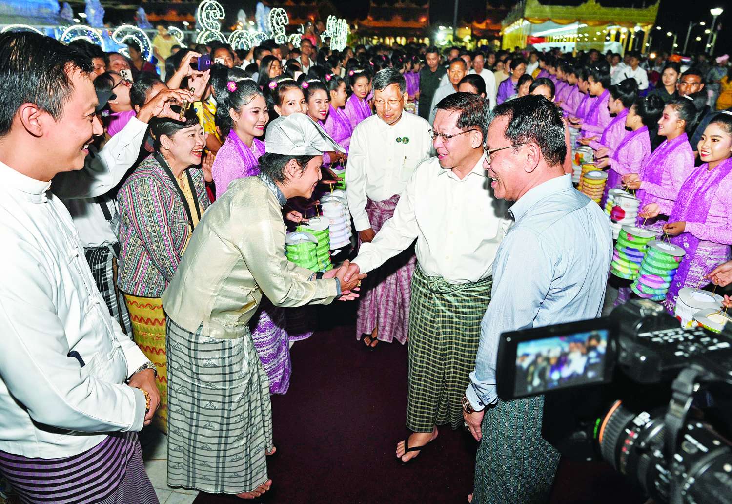 ဦးစွာ နိုင်ငံတော်ယာယီသမ္မတ နိုင်ငံတော်လုံခြုံရေးနှင့်အေးချမ်းသာယာရေးကော်မရှင်ဥက္ကဋ္ဌနှင့်ဇနီးတို့သည် အခမ်းအနားကျင်းပမည့်နေရာသို့ ရောက်ရှိကြရာ မြန်မာ့အသံနှင့်ရုပ်မြင်သံကြားမှ တိုင်းရင်းသား၊ တိုင်းရင်းသူများ၊ သာသနာရေးနှင့်ယဉ်ကျေးမှုဝန်ကြီးဌာန အနုပညာဦးစီးဌာနမှ ယဉ်ကျေးမှုအဖွဲ့များ၊ အနုပညာရှင်များက မြန်မာ့ရိုးရာမီးပုံးငယ်များကို ကိုင်ဆောင်၍ လှိုက်လှဲနွေးထွေးစွာ ကြိုဆိုကြသည်။