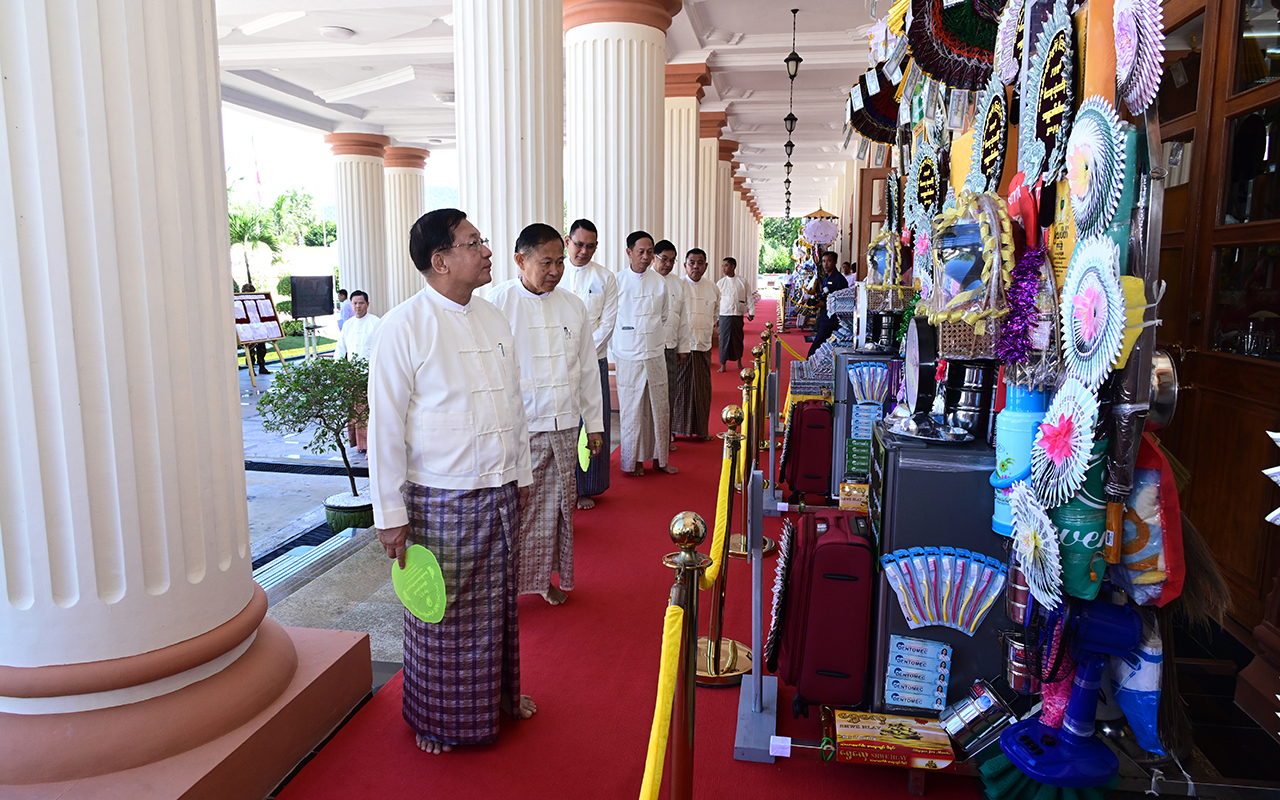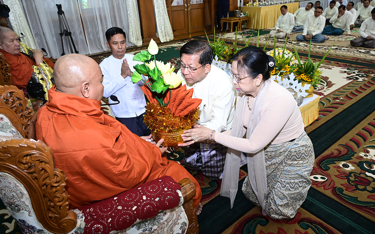 ဦးစွာ နိုင်ငံတော်လုံခြုံရေးနှင့်အေးချမ်းသာယာရေးကော်မရှင်ဥက္ကဋ္ဌ တပ်မတော်ကာကွယ်ရေးဦးစီးချုပ်နှင့်ဇနီး၊ ဧည့်ပရိသတ်များသည် ဘုန်းတော်ကြီးကျောင်းအသီးသီးသို့ လှူဒါန်းရန် ခင်းကျင်းပြင်ဆင်ထားသည့် ကထိန်လျာသင်္ကန်း၊ လှူဖွယ်ပစ္စည်းများနှင့် ပဒေသာပင်များအား လှည့်လည်ကြည့်ရှုကြသည်။ ထို့နောက် နိုင်ငံတော်လုံခြုံရေးနှင့်အေးချမ်းသာယာရေးကော်မရှင်ဥက္ကဋ္ဌ တပ်မတော်ကာကွယ်ရေးဦးစီးချုပ်သည် အနော်ရထာခန်းမအတွင်းရှိ ဗုဒ္ဓရုပ်ပွားတော်မြတ်အား ဖူးမြော်ကြည်ညို၍ မြသပိတ်ဆွမ်းတော်နှင့် ပန်း၊ သောက်တော်ရေချမ်း၊ ဆီမီး၊ သစ်သီးတို့ကို ဆက်ကပ်လှူဒါန်းသည်။