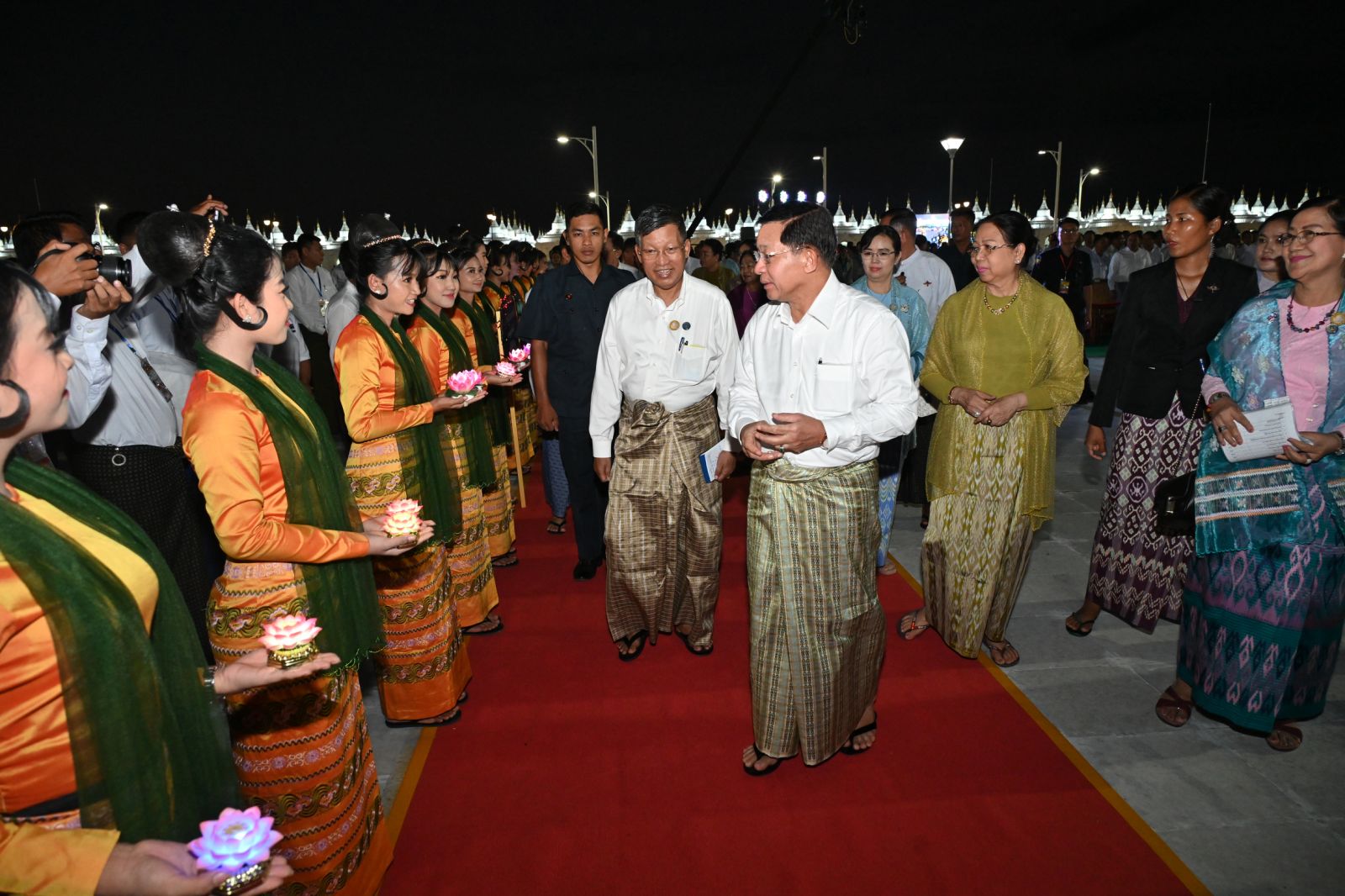 ဦးစွာ နိုင်ငံတော်စီမံအုပ်ချုပ်ရေးကောင်စီဥက္ကဋ္ဌ နိုင်ငံတော်ဝန်ကြီးချုပ်နှင့်ဇနီးတို့သည် အခမ်းအနားကျင်းပမည့်နေရာသို့ရောက်ရှိကြရာ တိုင်းရင်းသား၊ တိုင်းရင်းသူ များက မီးကြာခွက်များကိုင်ဆောင်၍ လည်းကောင်း၊ တိုင်းရင်းသားရိုးရာယဉ်ကျေးမှုအဖွဲ့များက ဦးရွှေရိုးဒေါ်မိုးအက၊ တိုင်းရင်းသားရိုးရာအကအလှများ၊ အိုးစည်ဒိုးပတ်များ တီးမှုတ်၍ ကြိုဆိုကြသည်။