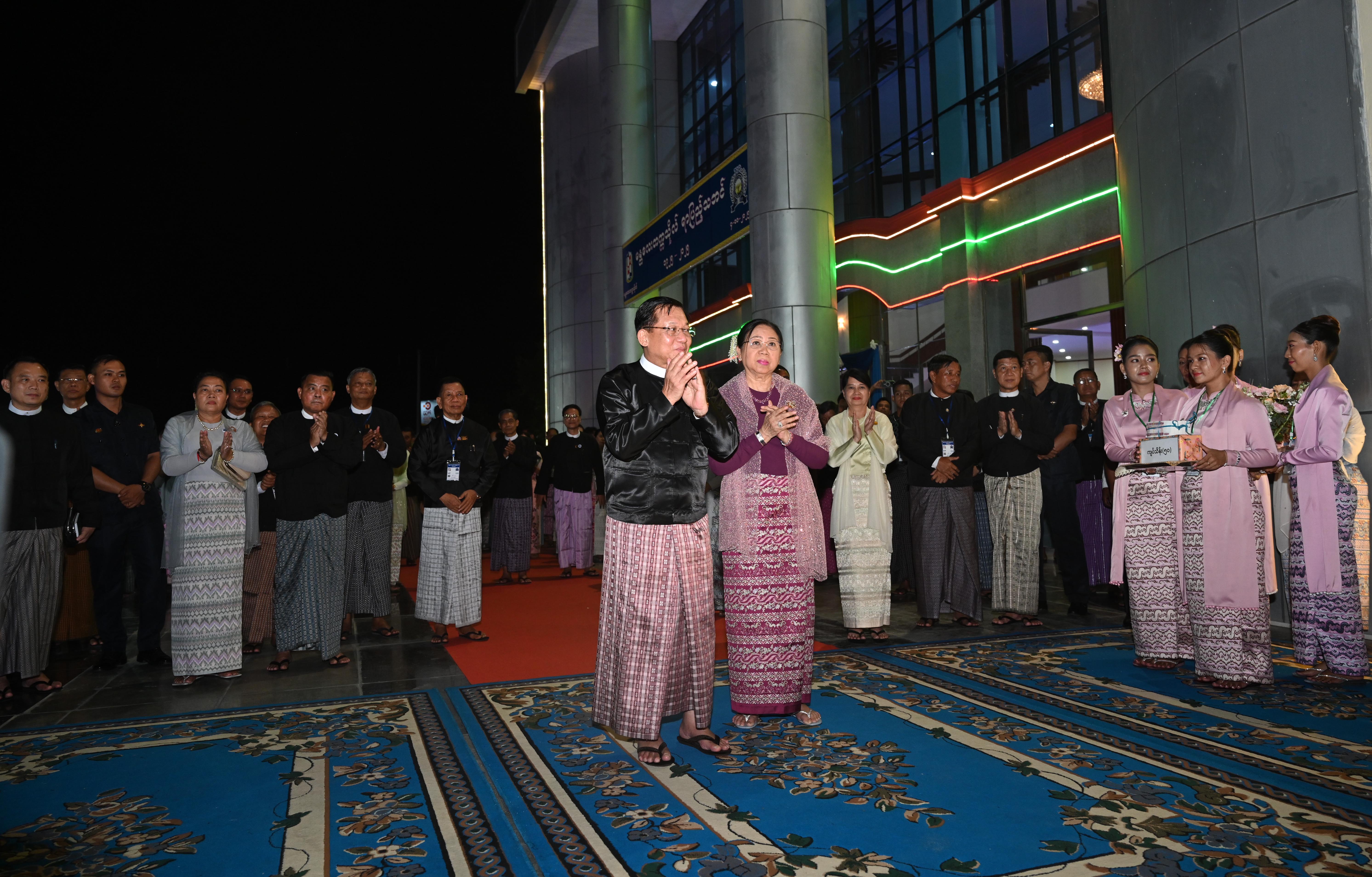 ဦးစွာ နိုင်ငံတော်ယာယီသမ္မတ နိုင်ငံတော်လုံခြုံရေးနှင့်အေးချမ်းသာယာရေးကော်မရှင်ဥက္ကဋ္ဌ နှင့်ဇနီး၊ အဖွဲ့ဝင်များသည် ဂုဏ်ပြုညစာစားပွဲ အခမ်းအနားကျင်းပပြုလုပ်မည့်နေရာသို့ ရောက်ရှိကြရာ တာဝန်ရှိသူများနှင့် ကျောင်းသား ကျောင်းသူဟောင်းများက ကြိုဆိုနှုတ်ဆက်ကြသည်။