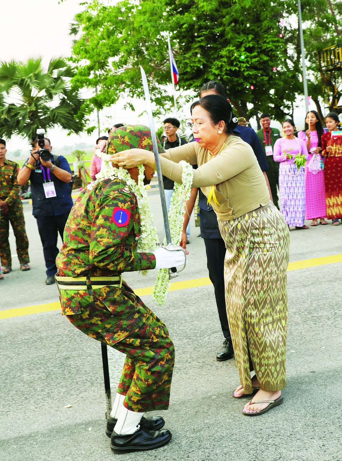 ထိုသို့ချီတက်ချိန်တွင် နိုင်ငံတော်စီမံအုပ်ချုပ်ရေးကောင်စီဥက္ကဋ္ဌ တပ်မတော်ကာကွယ်ရေးဦးစီးချုပ်၏ ဇနီး ဒေါ်ကြူကြူလှ၊ ကောင်စီဒုတိယဥက္ကဋ္ဌ ဒုတိယတပ်မတော်ကာကွယ်ရေးဦးစီးချုပ် ကာကွယ်ရေးဦးစီးချုပ် (ကြည်း) ၏ဇနီး ဒေါ်သန်းသန်းနွယ်၊ ညှိနှိုင်းကွပ်ကဲရေးမှူး (ကြည်း၊ ရေ၊ လေ) ၏ဇနီး၊ ကာကွယ်ရေးဦးစီးချုပ် (ရေ) ၏ဇနီး၊ ကာကွယ်ရေးဦးစီးချုပ် (လေ) ၏ဇနီး၊ ကာကွယ်ရေးဦးစီးချုပ်ရုံးမှ တပ်မတော်အရာရှိကြီးများ၏ ဇနီးများက ဂုဏ်ပြုပန်းကုံးများစွပ်၍ ကြိုဆိုကြသည်။ အလားတူ ကာကွယ်ရေးဦးစီးချုပ်ရုံး (ကြည်း) မှ အရာရှိ၊ စစ်သည်မိသားစုများ၊ နေပြည်တော်တိုင်းစစ်ဌာနချုပ်နှင့် တပ်နယ်အသီးသီးတို့မှ အရာရှိ၊ စစ်သည်၊ မိသားစုများ၊ မြန်မာနိုင်ငံရဲတပ်ဖွဲ့ဝင်များနှင့် မိသားစုများ၊ ဝန်ကြီးဌာနအသီးသီးမှ နိုင်ငံ့ဝန်ထမ်းများ၊ ရုပ်ရှင်ဂီတအနုပညာရှင်များ၊ ဒေသခံမိဘပြည်သူများကလည်း စစ်ကြောင်းကြီးများ ချီတက်ရာလမ်းတစ်လျှောက် သောင်းသောင်းဖြဖြကြိုဆိုကာ ဂုဏ်ပြုပန်းကုံးများစွပ်၍ ကြိုဆိုခဲ့ကြပြီး စစ်ကြောင်းကြီးများမှ တပ်မတော်သားများနှင့် မြန်မာနိုင်ငံရဲတပ်ဖွဲ့ဝင်များသည် ဇာတိသွေး၊ ဇာတိမာန်အပြည့်ဖြင့် စစ်ချီတေးများကို သံပြိုင်ဟစ်ကြွေးသီဆိုချီတက်လာကြပြီး စစ်ရေးပြကွင်းအတွင်းသို့ ရောက်ရှိနေရာယူကြသည်။