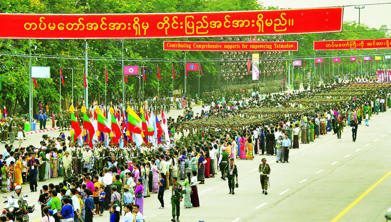 နှစ် (၈ဝ) ပြည့် တပ်မတော်နေ့ စစ်ရေးပြအခမ်းအနား ကျင်းပပြုလုပ်၊ နိုင်ငံတော်စီမံအုပ်ချုပ်ရေးကောင်စီဥက္ကဋ္ဌ တပ်မတော်ကာကွယ်ရေးဦးစီးချုပ် ဗိုလ်ချုပ်မှူးကြီး သတိုးမဟာသရေစည်သူ သတိုးသီရိသုဓမ္မ မင်းအောင်လှိုင် တက်ရောက်မိန့်ခွန်းပြောကြား