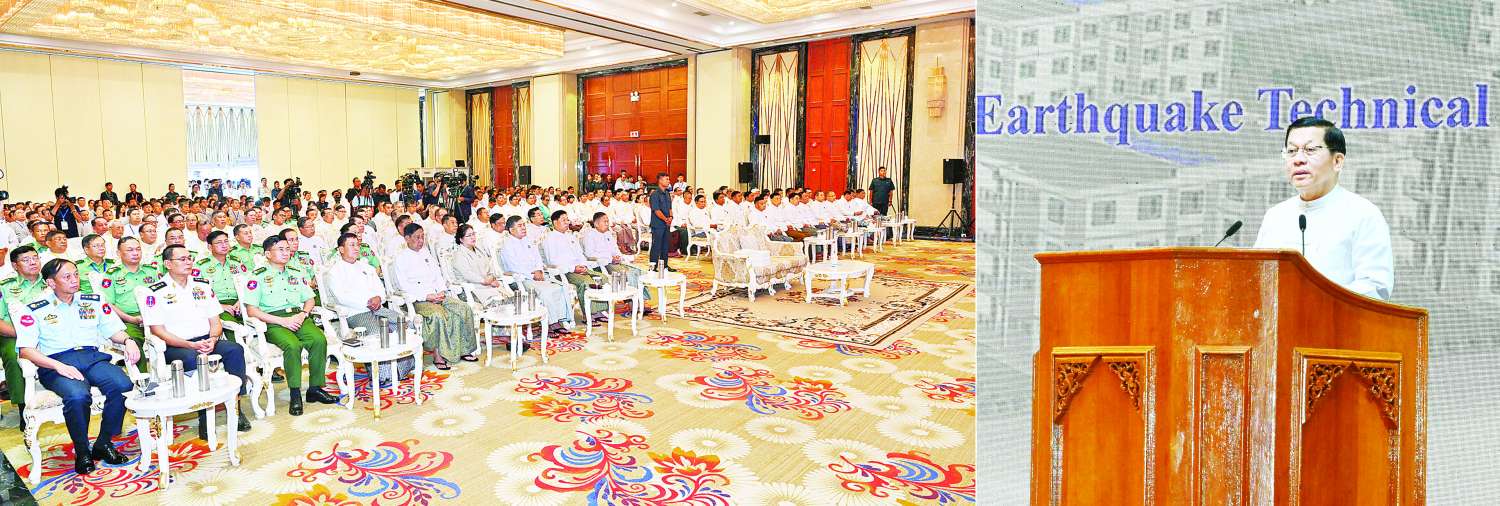 “ငလျင်ကာလအလွန် တည်ဆောက်ပြုပြင်ရေးလုပ်ငန်းများအတွက် နည်းပညာဆိုင်ရာ ပြန်လည်သုံးသပ်ခြင်းနှင့် အနာဂတ်တွင် ကြုံတွေ့လာနိုင်သည့် နည်းပညာဆိုင်ရာ စိန်ခေါ်မှုများအတွက် ကြိုတင်ပြင်ဆင်ခြင်း” ခေါင်းစဉ်ဖြင့် ကျင်းပပြုလုပ်သည့် ငလျင်ကာလအလွန် နည်းပညာဆိုင်ရာဆွေးနွေးပွဲ (Post Earthquake Technical Forum) ဖွင့်ပွဲအခမ်းအနားကို ယနေ့နံနက်ပိုင်းတွင် နေပြည်တော်ရှိ မင်္ဂလာသီရိဟိုတယ်၌ ကျင်းပပြုလုပ်ရာ နိုင်ငံတော်စီမံအုပ်ချုပ်ရေးကောင်စီဥက္ကဋ္ဌ နိုင်ငံတော်ဝန်ကြီးချုပ် ဗိုလ်ချုပ်မှူးကြီး မင်းအောင်လှိုင် တက်ရောက်၍ အဖွင့်အမှာစကား ပြောကြားသည်။