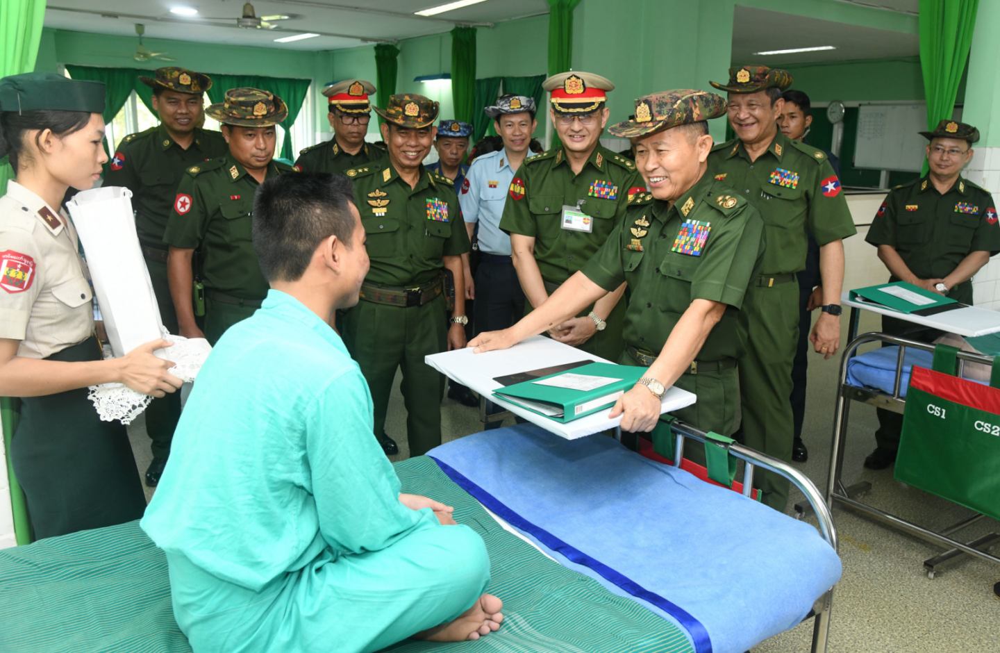 ထို့နောက် နိုင်ငံတော်စီမံအုပ်ချုပ်ရေးကောင်စီ ဒုတိယဥက္ကဋ္ဌ ဒုတိယတပ်မတော်ကာကွယ်ရေးဦးစီးချုပ် ကာကွယ်ရေးဦးစီးချုပ် (ကြည်း) နှင့် အဖွဲ့ဝင်များသည် ဆေးရုံများတွင် တက်ရောက်ဆေးကုသမှုခံယူလျက်ရှိသည့် အရာရှိ၊ စစ်သည်၊ မိသားစု များအား တစ်ဦးချင်း လိုက်လံကြည့်ရှု၍ ရောဂါဖြစ်ပွားမှုအခြေအနေများ၊ ဆေးဝါးကုသပေးထားမှု အခြေအနေများ၊ ကျန်းမာရေးတိုးတက်ကောင်းမွန်လာမှု အခြေအနေများနှင့်ပတ်သက်၍ တစ်ဦးချင်း ရင်းရင်းနှီးနှီး လိုက်လံမေးမြန်း အားပေးစကား ပြောကြားပြီး စားသောက်ဖွယ်ရာများနှင့် ဂုဏ်ပြုချီးမြှင့်ငွေများ ပေးအပ်သည်။